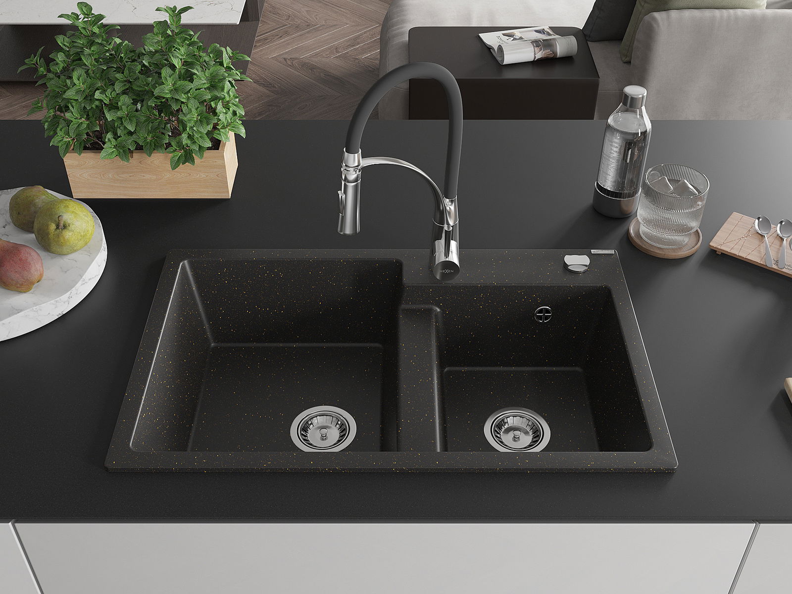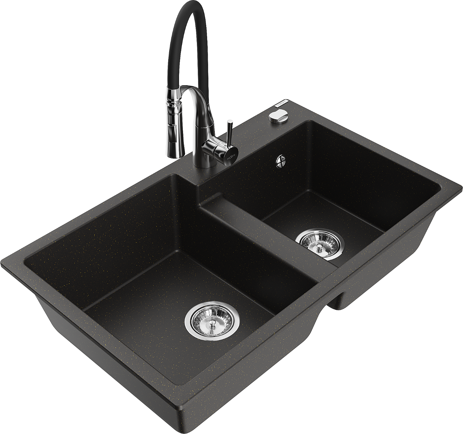 Mexen Tomas dřez žulový 2-komorový s kuchyňskou baterií Aster, černý/zlatý metalik - 6516-75-73450-07