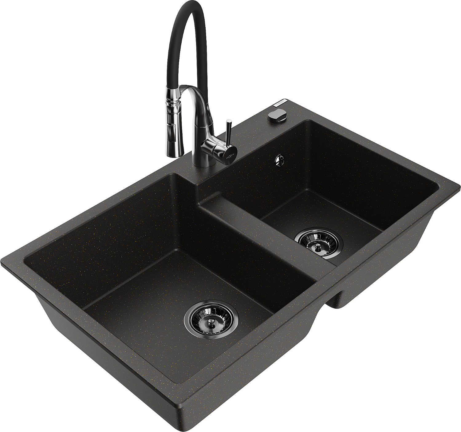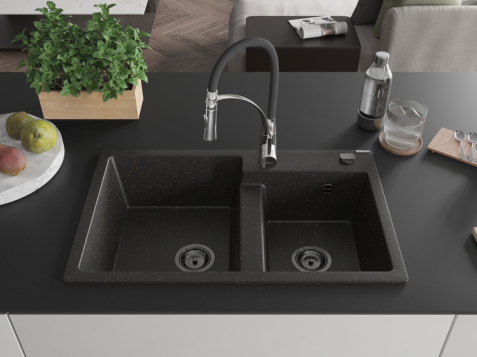 Mexen Tomas dvoudřezový granitový dřez s kuchyňskou baterií Aster, černý/zlatý metalik - 6516-75-73450-07-B