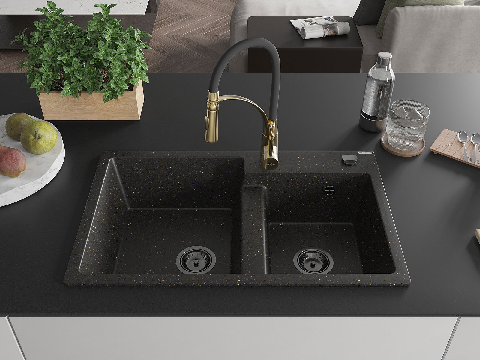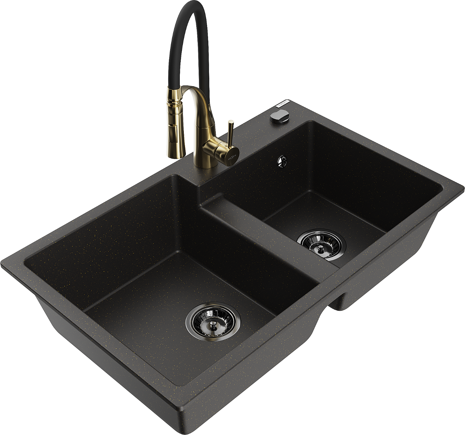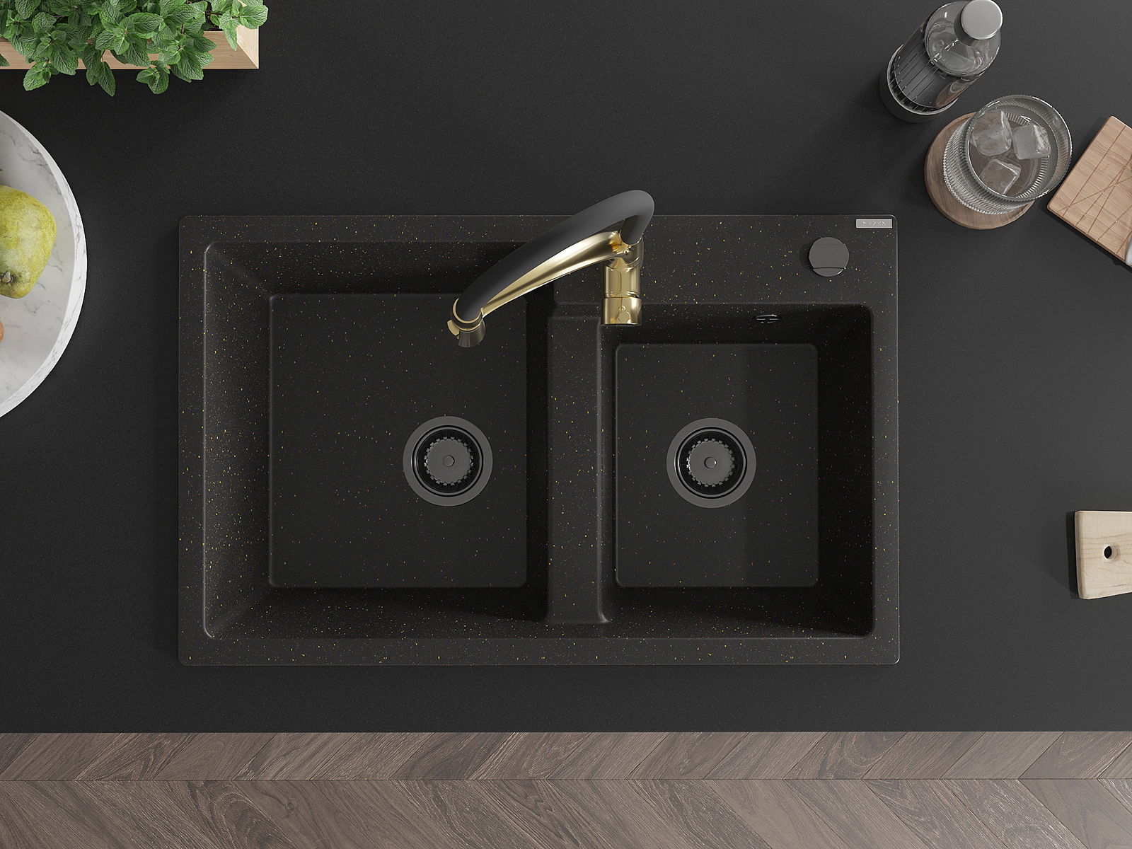 Mexen Tomas dřez granitový 2-komorový s kuchyňskou baterií Aster, černý/zlatý metalik - 6516-75-73450-57-B