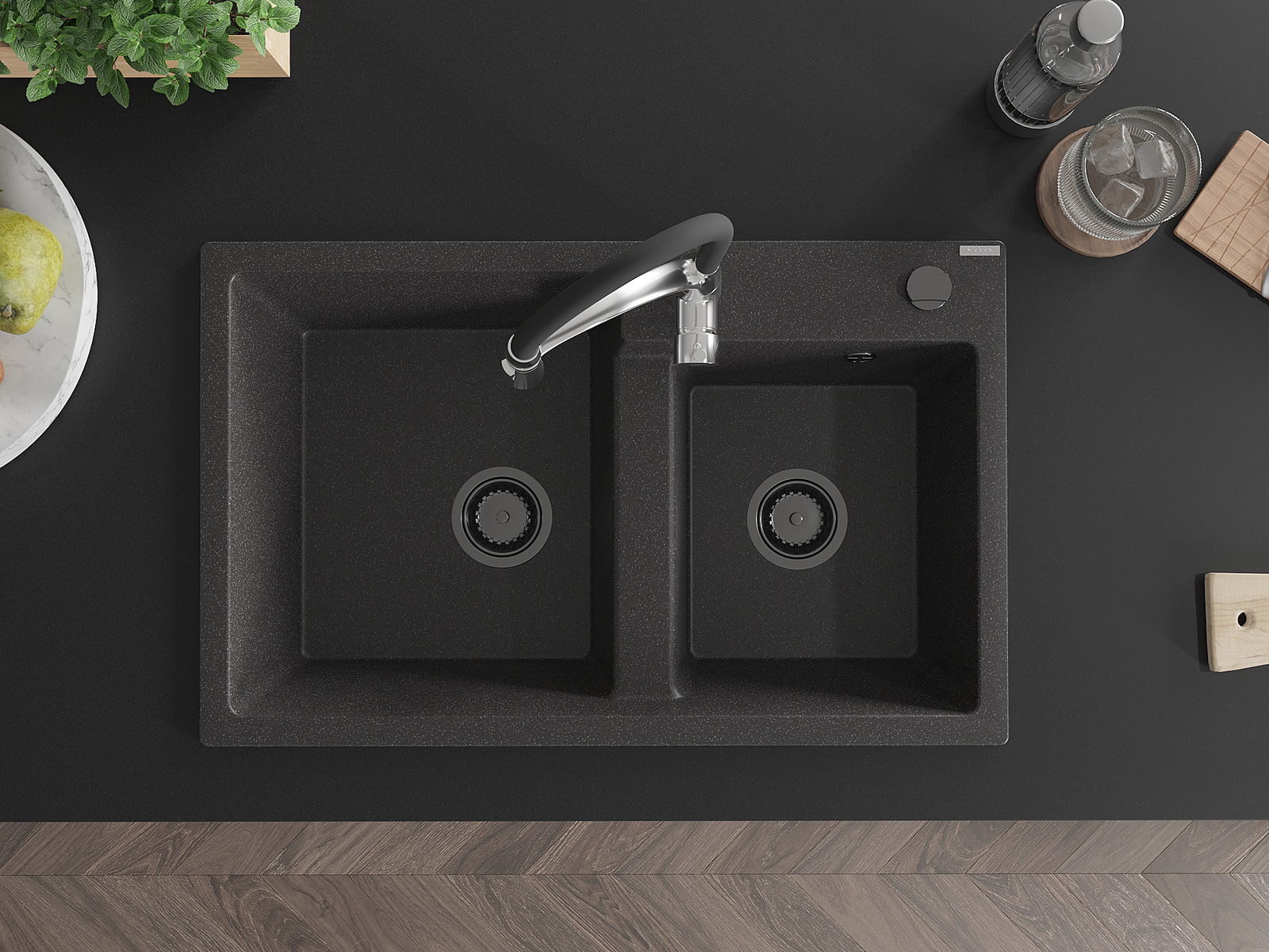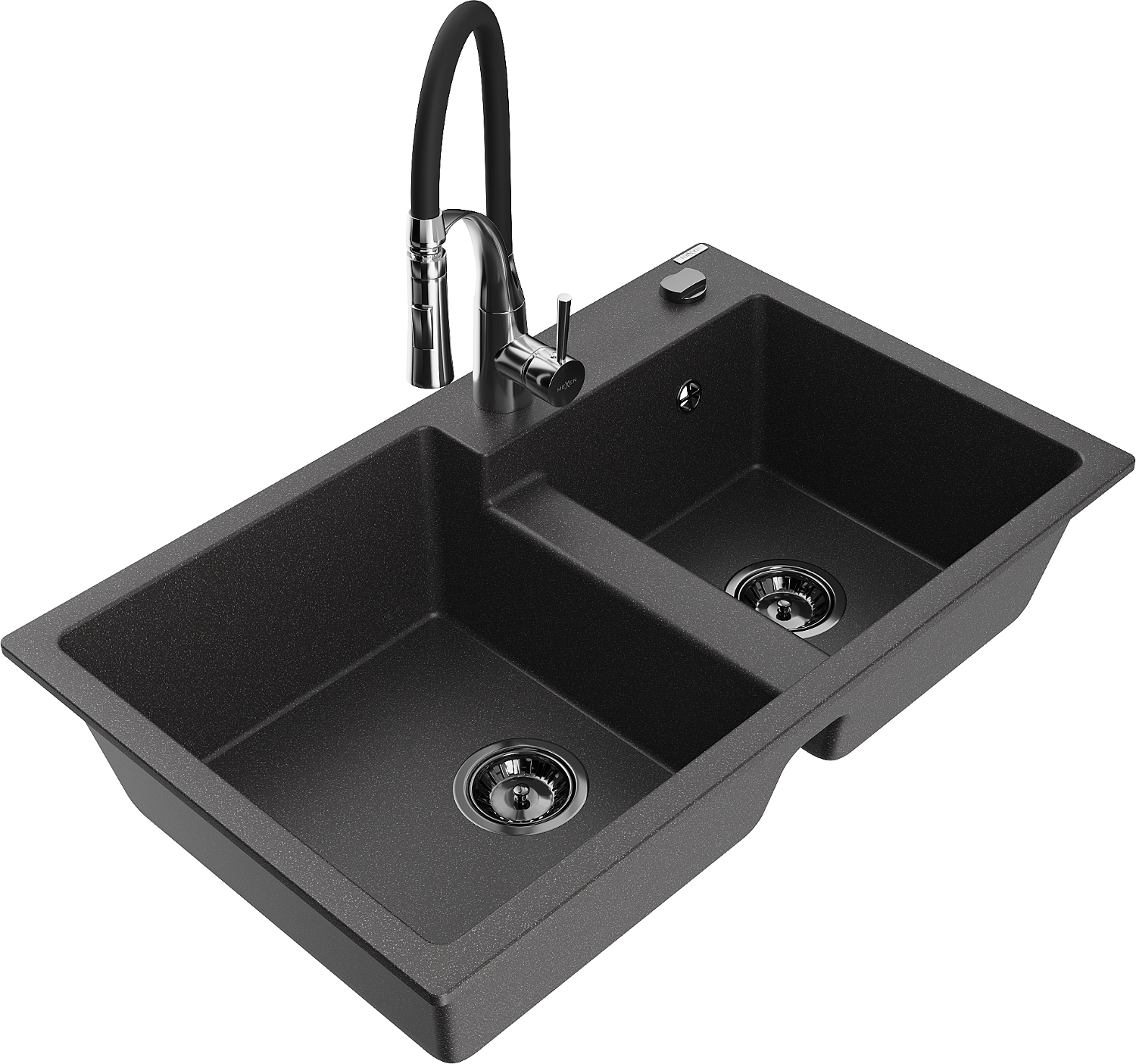 Mexen Tomas dvoukomorový dřez z granitu s kuchyňskou baterií Aster, černý skvrnitý - 6516-76-73450-07-B