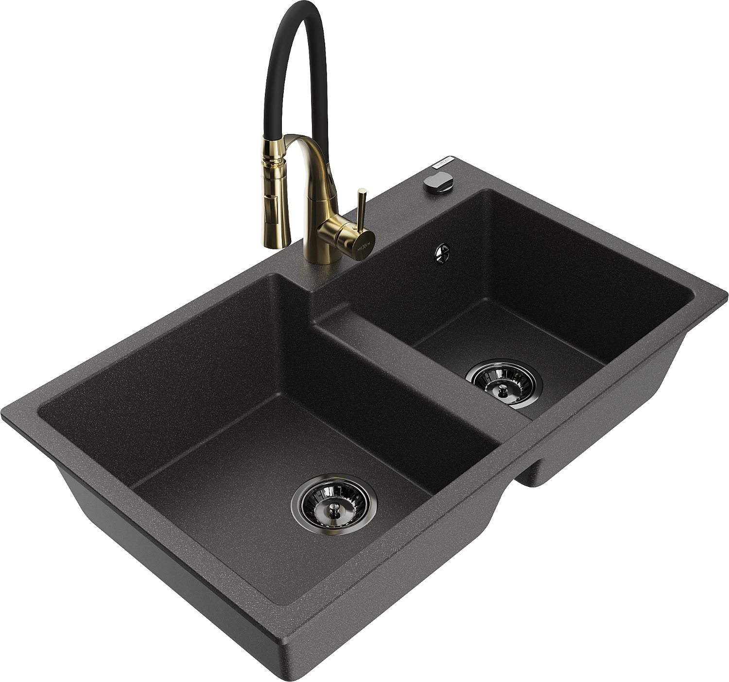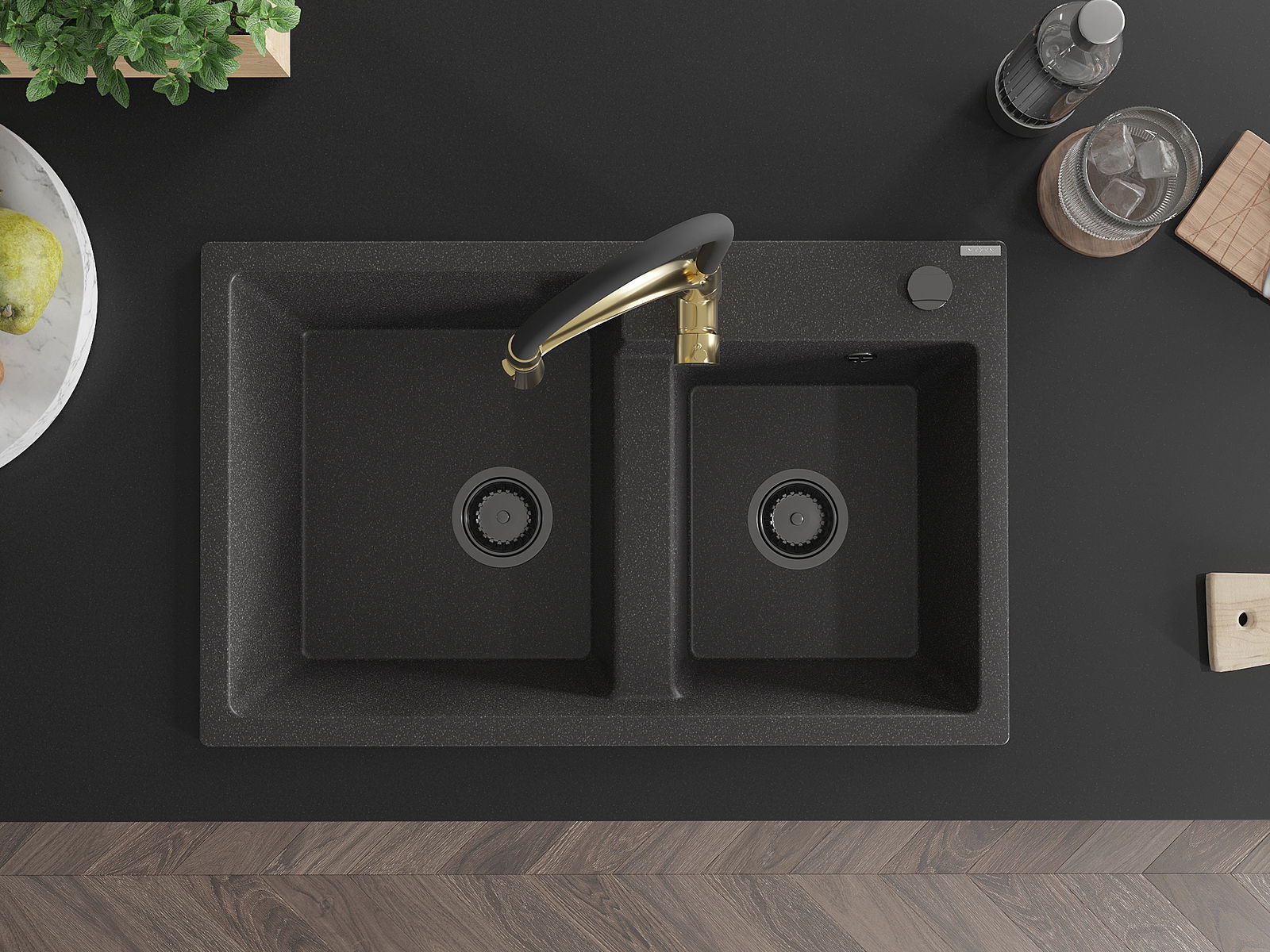 Mexen Tomas granitový dřez 2-komorový s kuchyňskou baterií Aster, černo-posypaný - 6516-76-73450-57-B