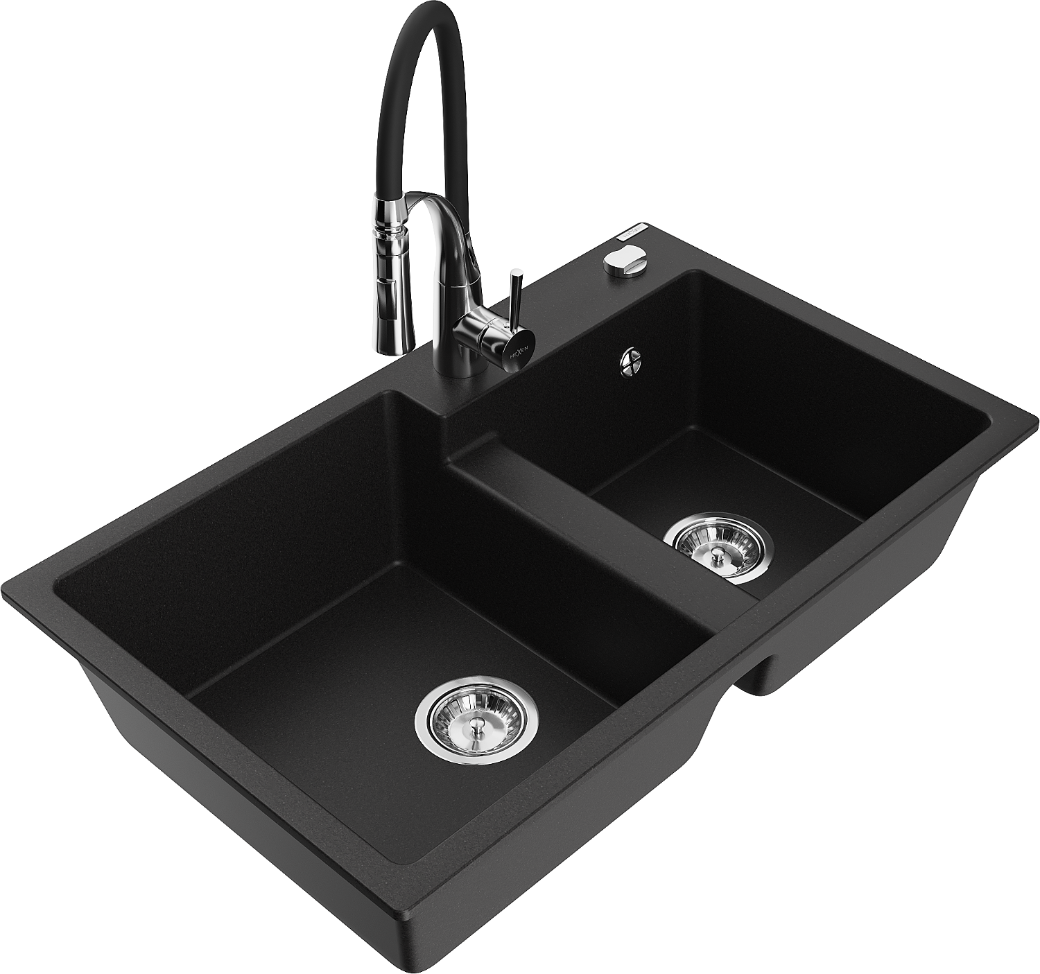 Mexen Tomas granitový dřez 2komorový s kuchyňskou baterií Aster, černý - 6516-77-73450-07