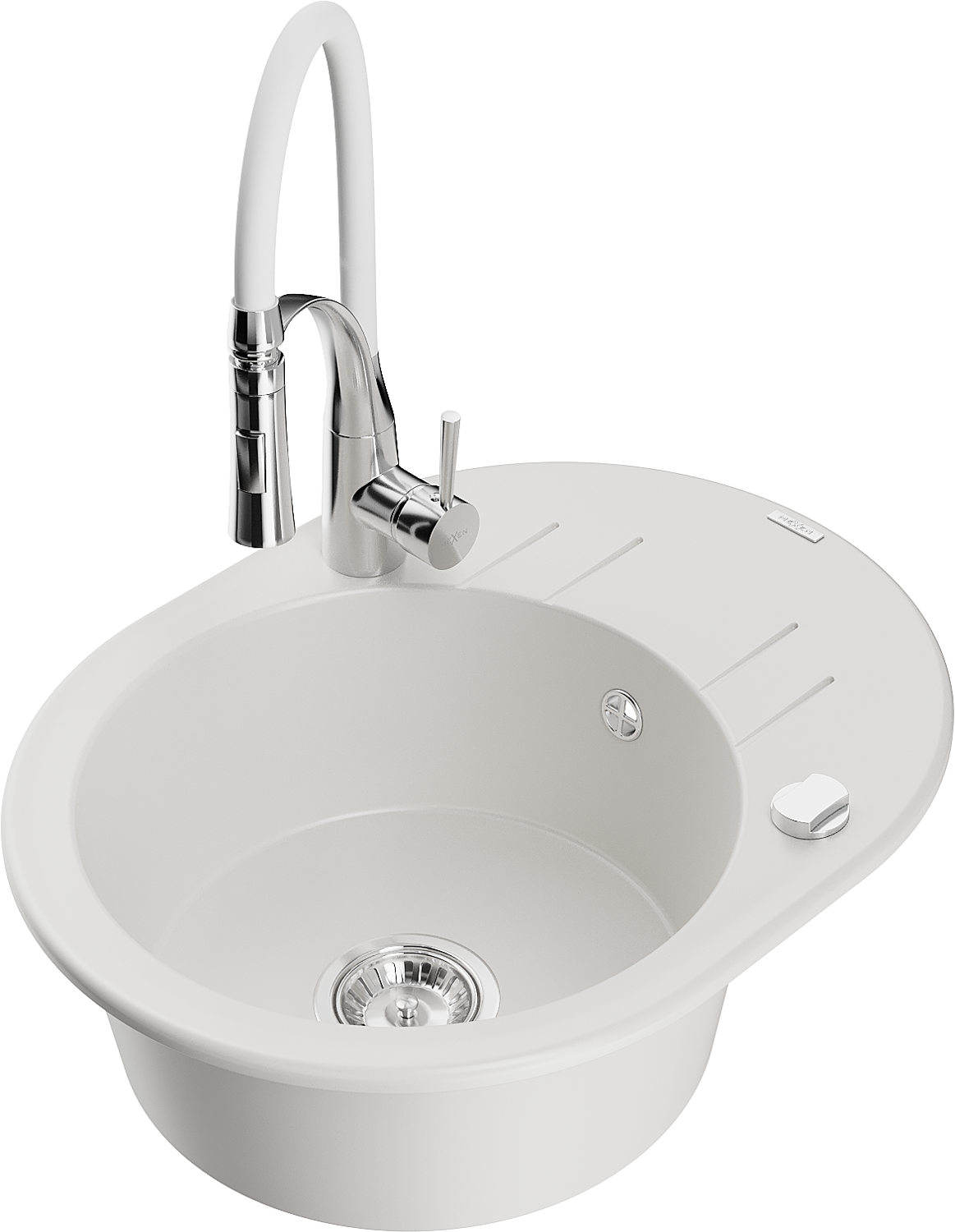 Mexen Kevin granitový dřez 1-komorový s odkapávačem a kuchyňskou baterií Aster, bílý - 6517-20-73450-02