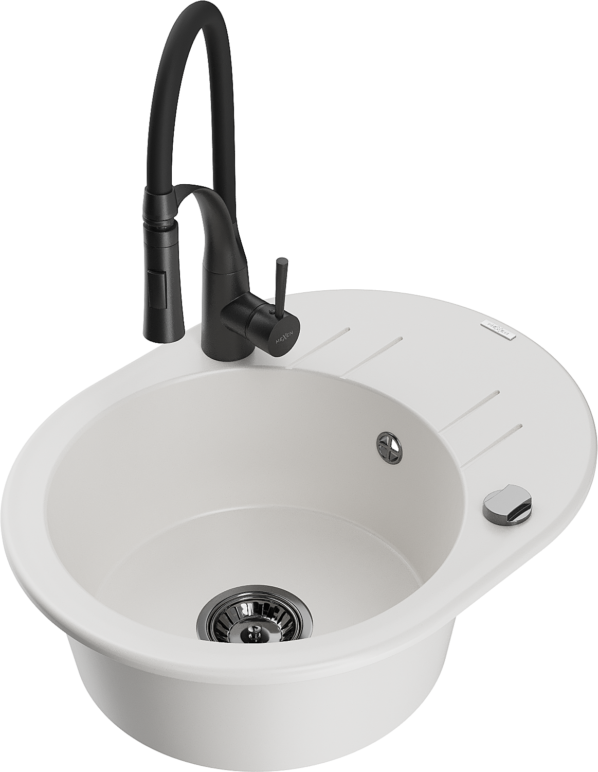 Mexen Kevin granitový dřez 1-komorový s odkapávačem a kuchyňskou baterií Aster, bílý - 6517-20-73450-70-B