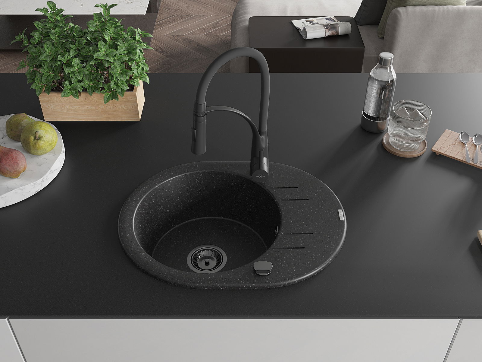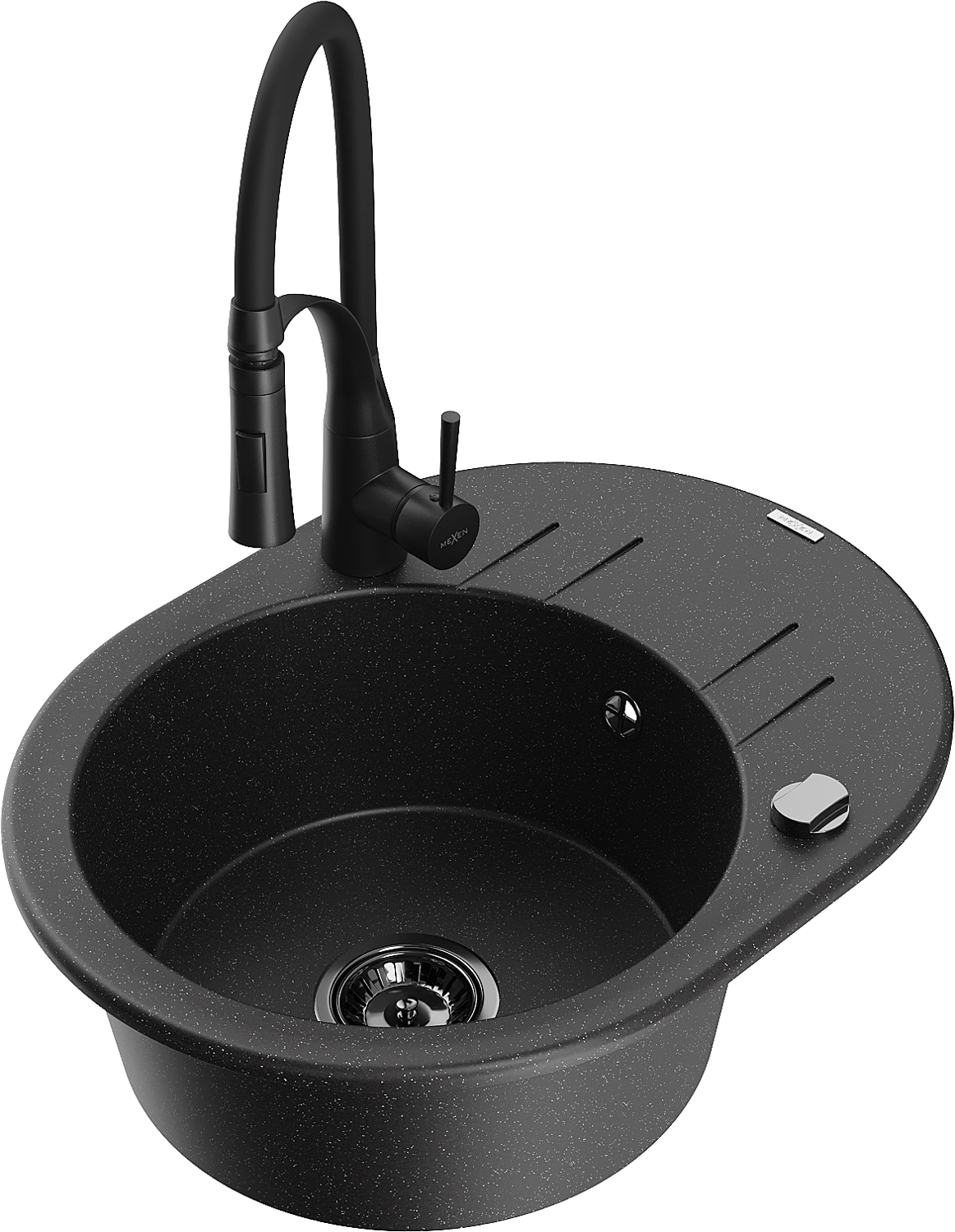 Mexen Kevin granitový dřez s 1 komorou, odkapávačem a kuchyňskou baterií Aster, černý/stříbrný metalík - 6517-73-73450-70-B