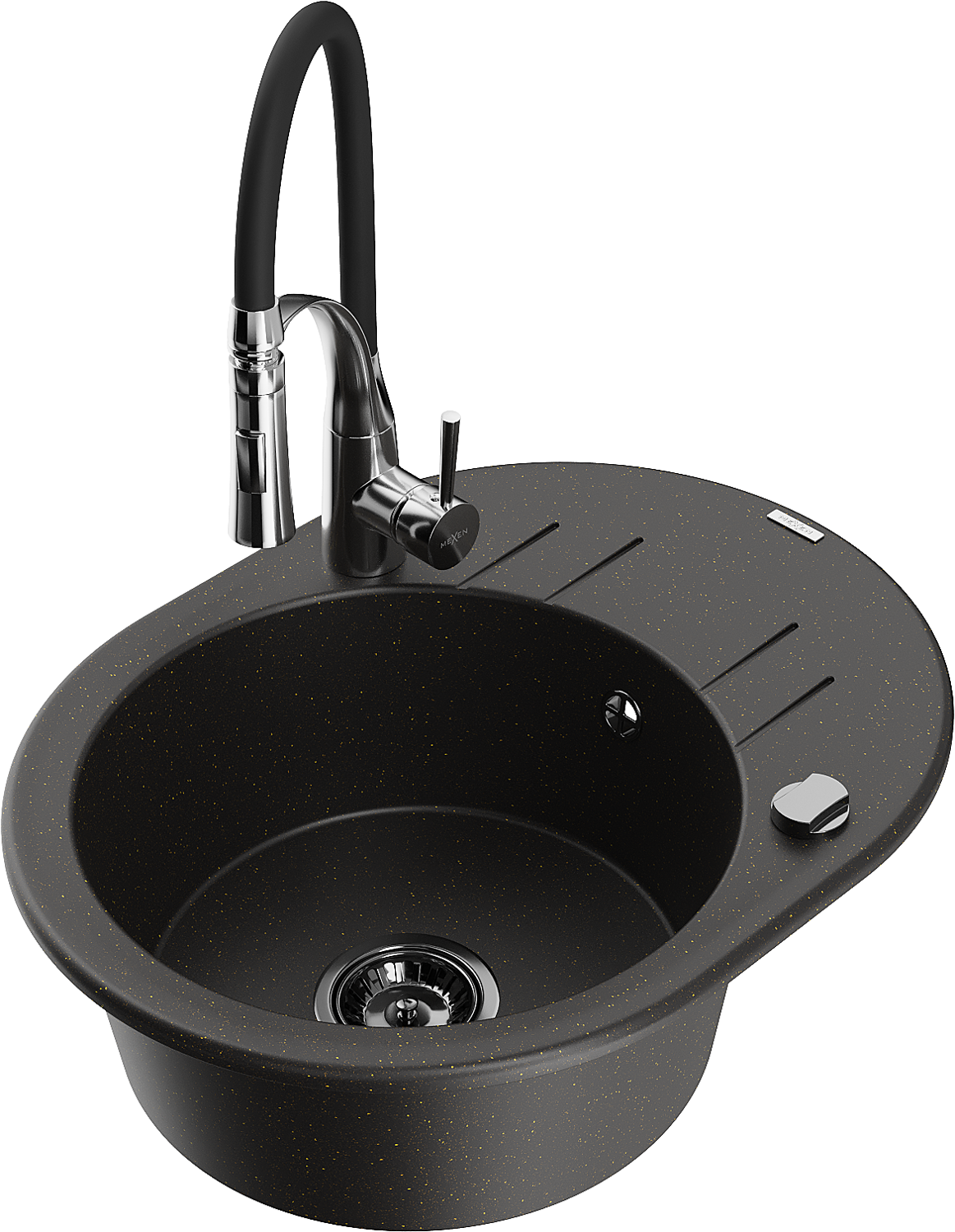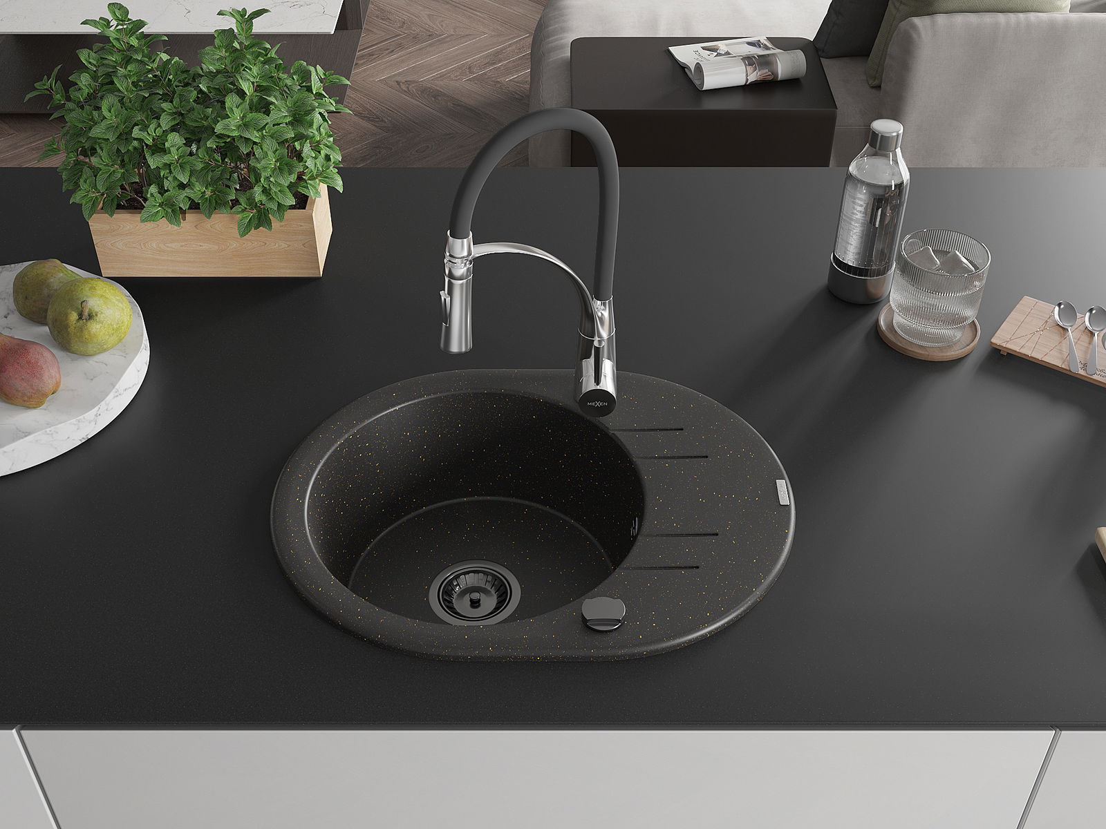 Mexen Kevin žulový dřez 1-komorový s odkapávačem a kuchyňskou baterií Aster, černý/zlatý metalik - 6517-75-73450-07-B