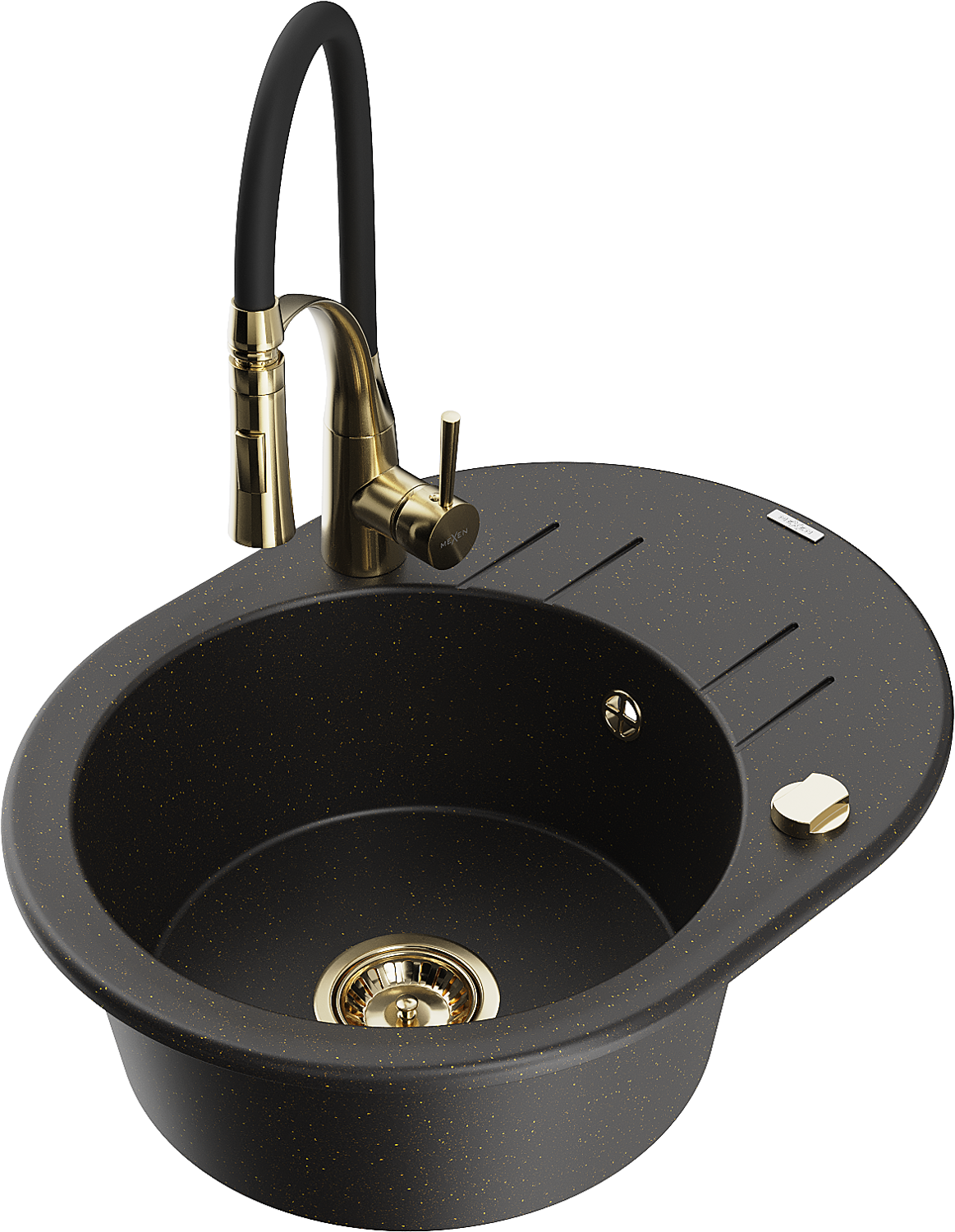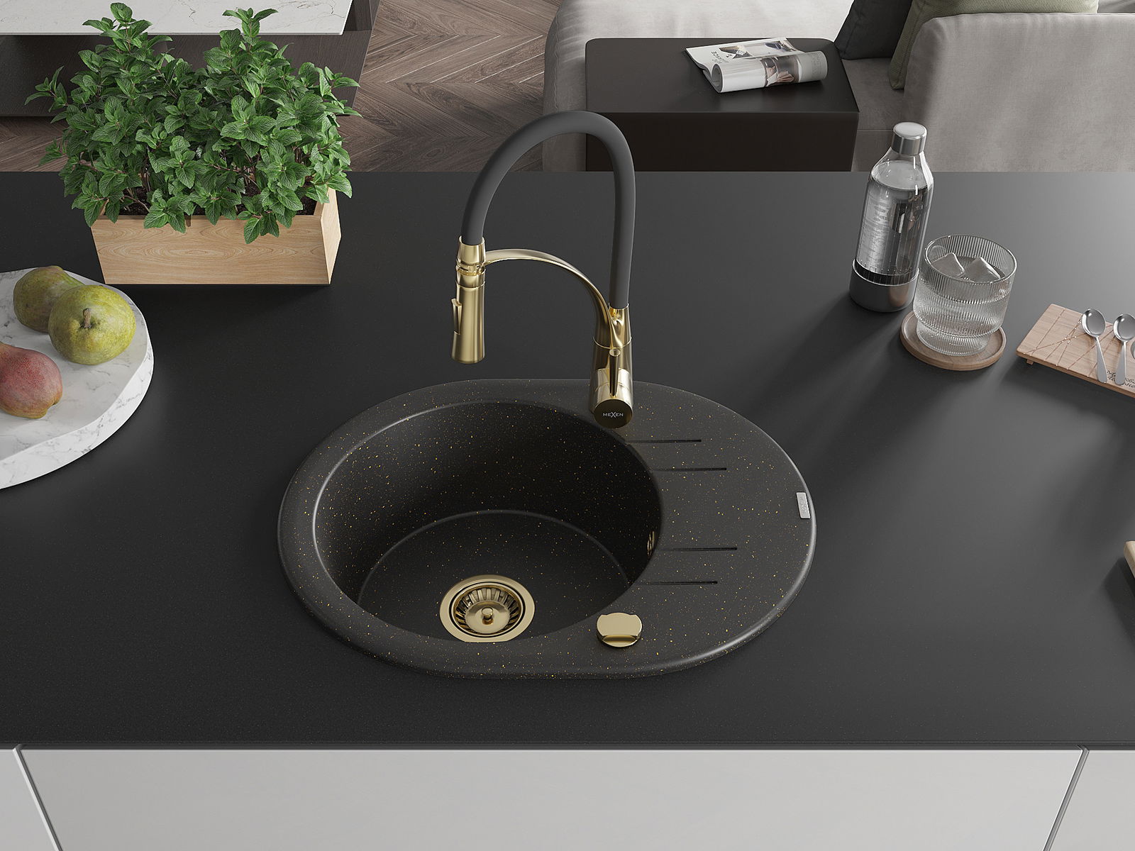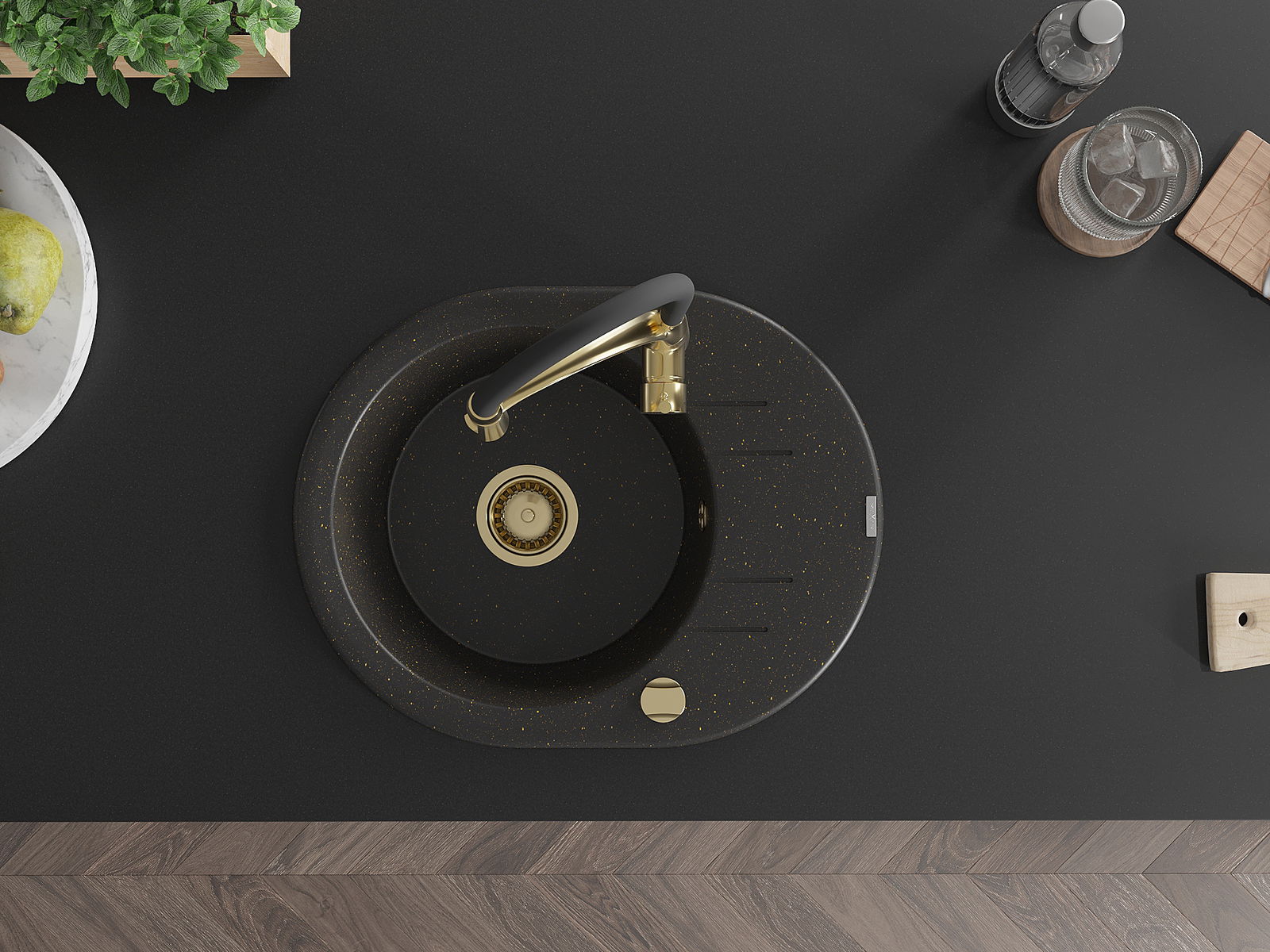 Mexen Kevin granitový dřez 1-komorový s odkapávačem a kuchyňskou baterií Aster, černý/zlatý metalik - 6517-75-73450-57-G