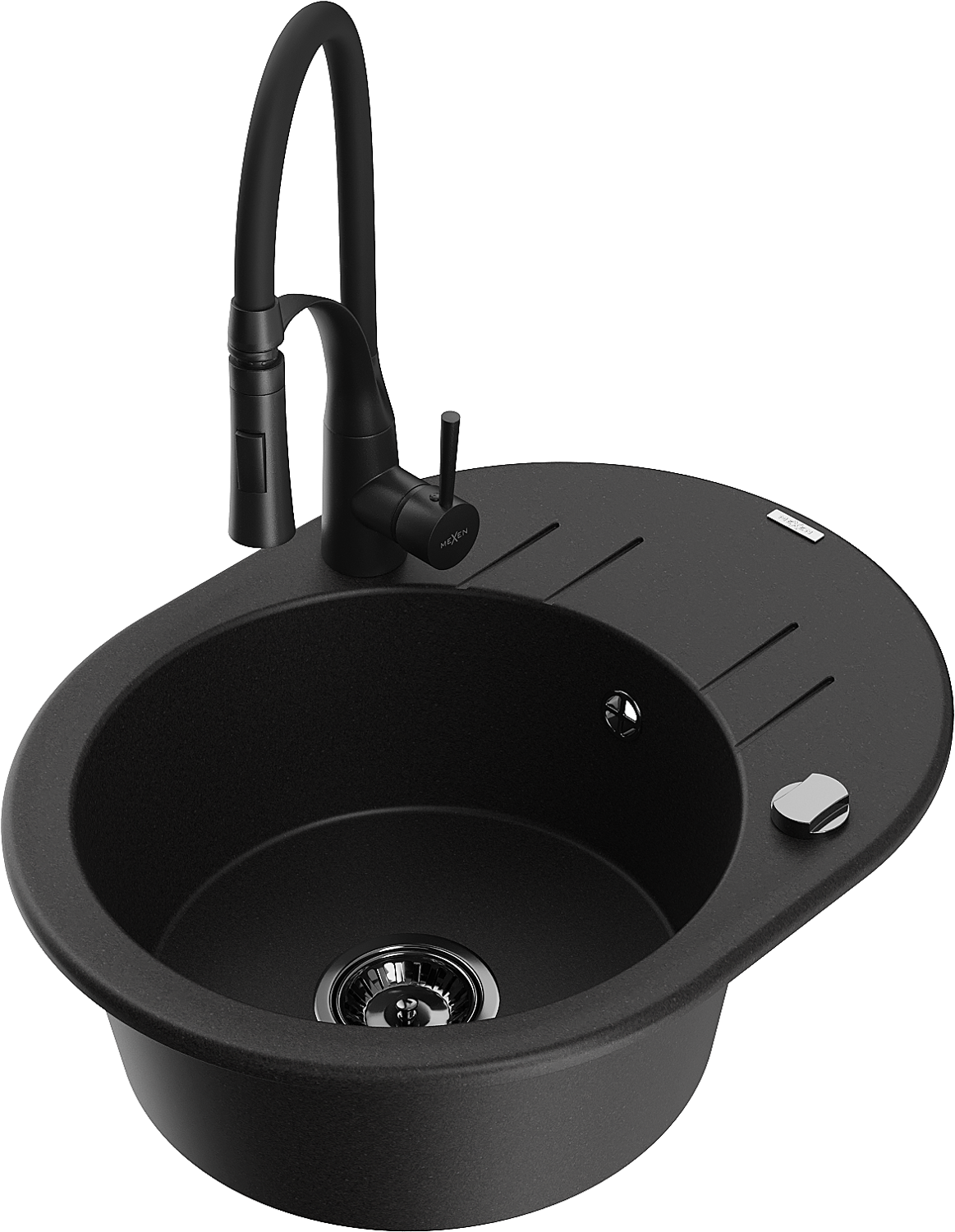 Mexen Kevin granitový dřez 1-komorový s odkapávačem a kuchyňskou baterií Aster, černý - 6517-77-73450-70-B