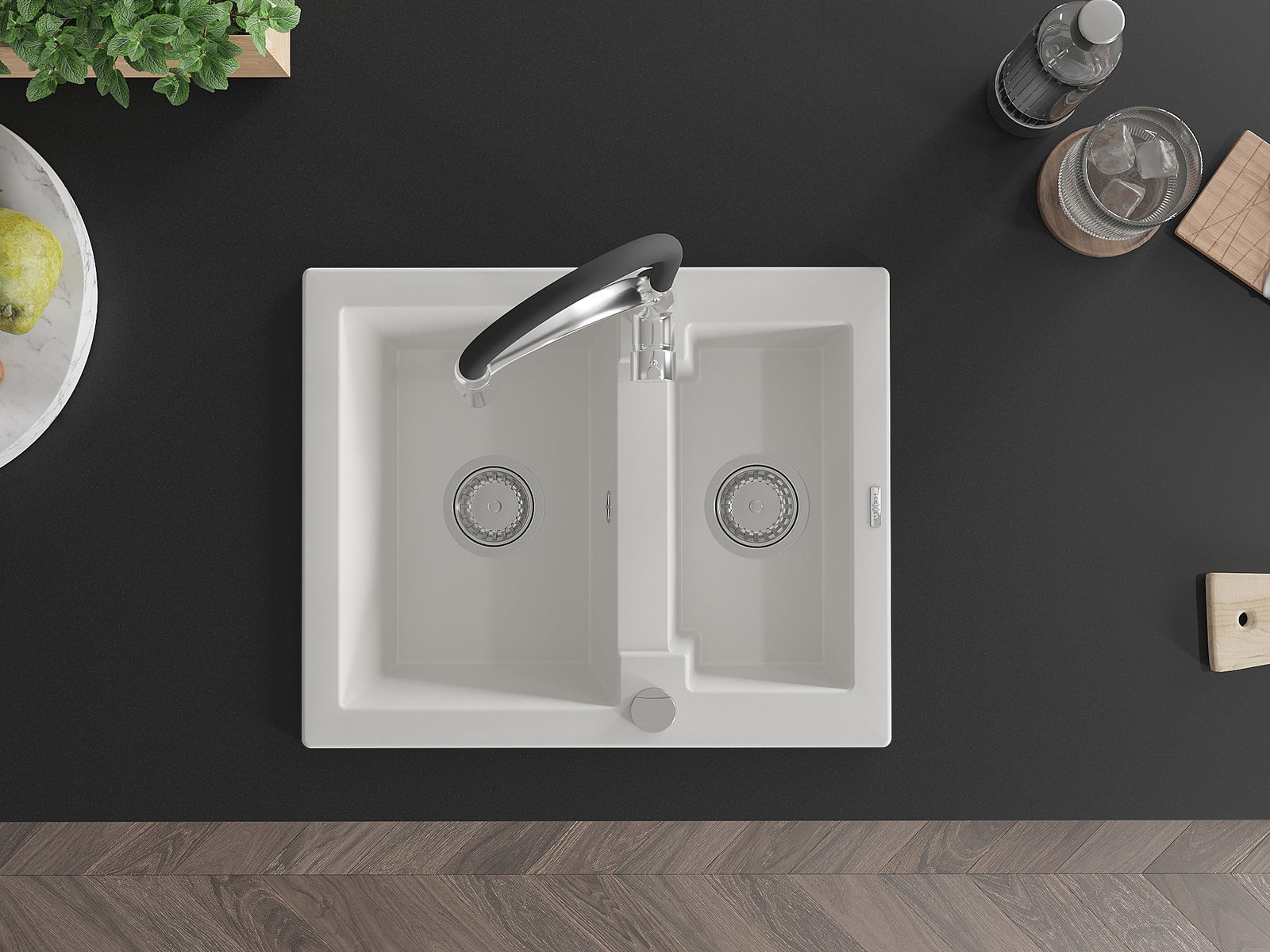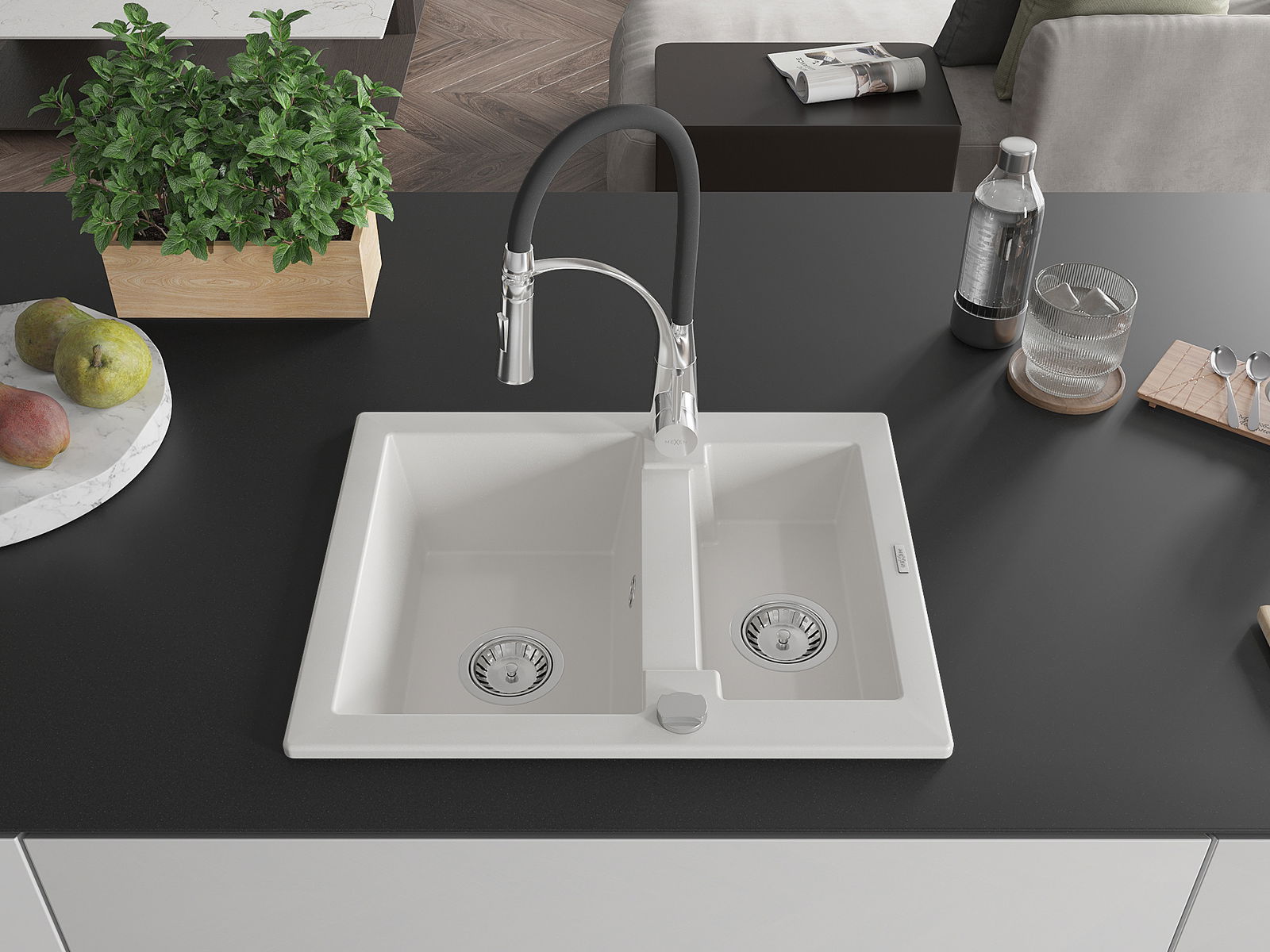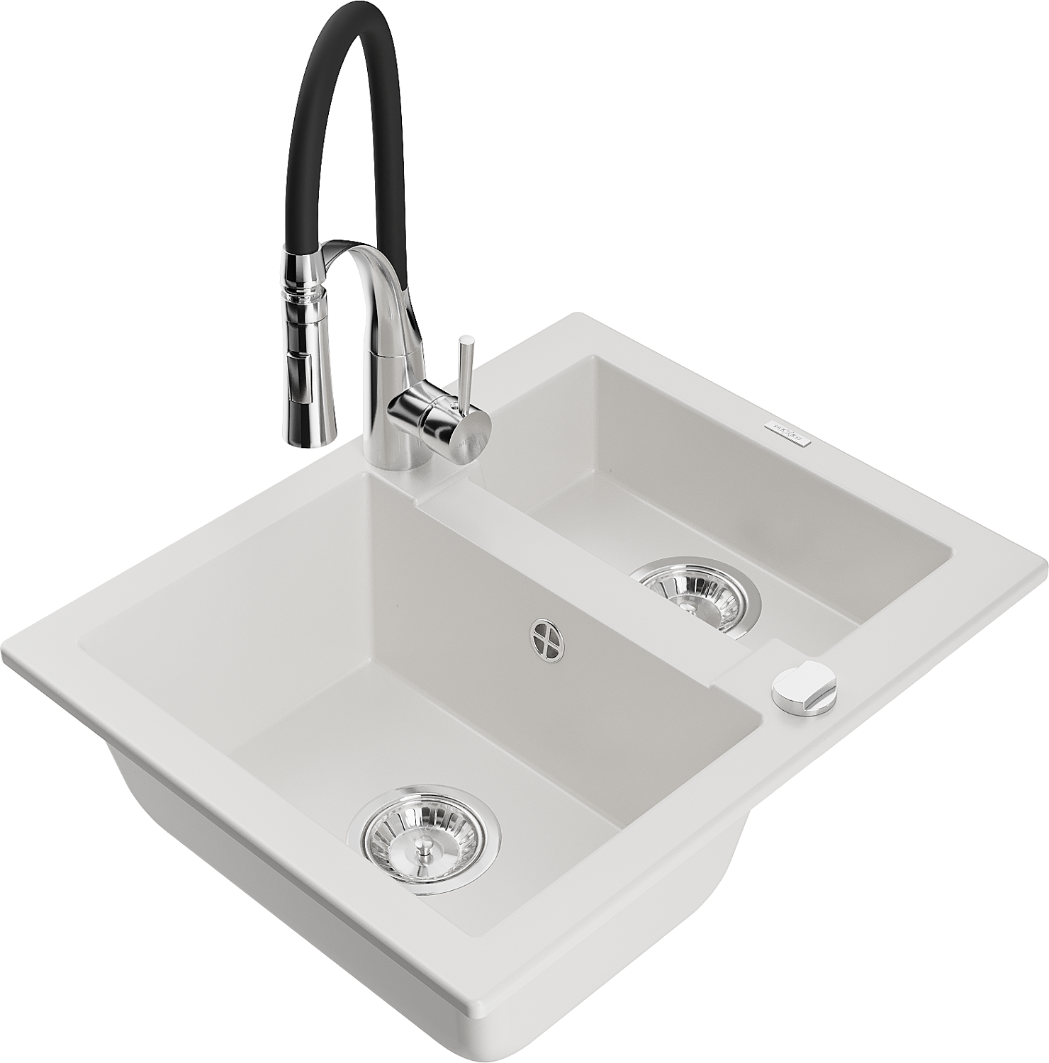 Mexen Carlos granitový dřez 1,5-komorový s kuchyňskou baterií Aster, bílý - 6518-20-73450-07