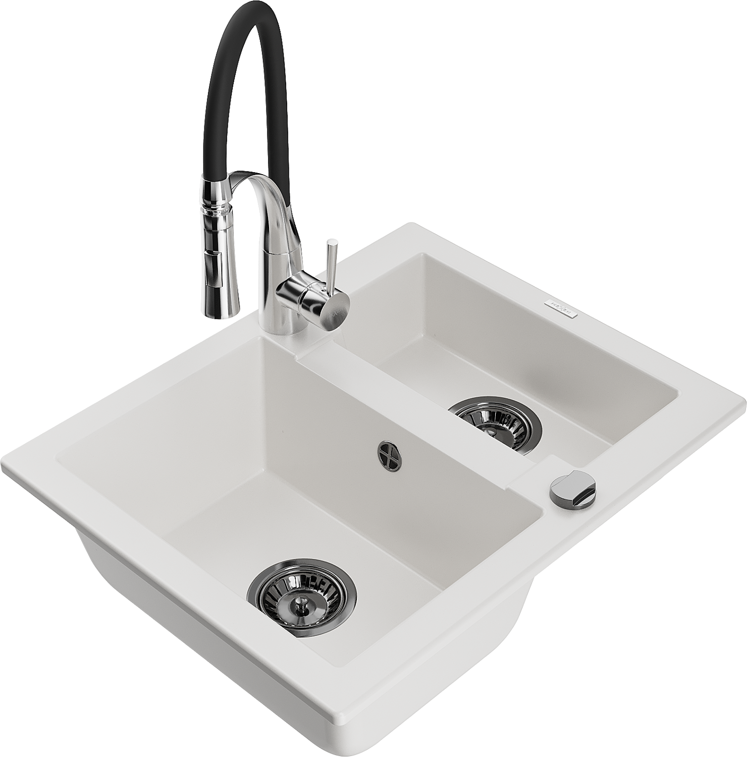 Mexen Carlos granitový dřez 1,5-komorový s kuchyňskou baterií Aster, bílý - 6518-20-73450-07-B