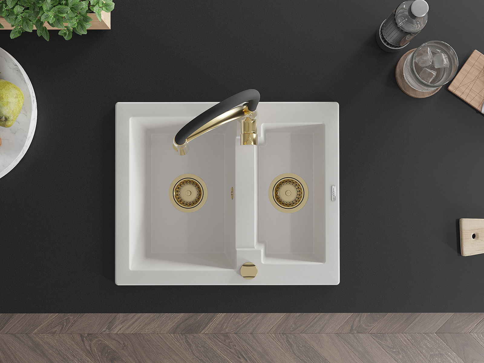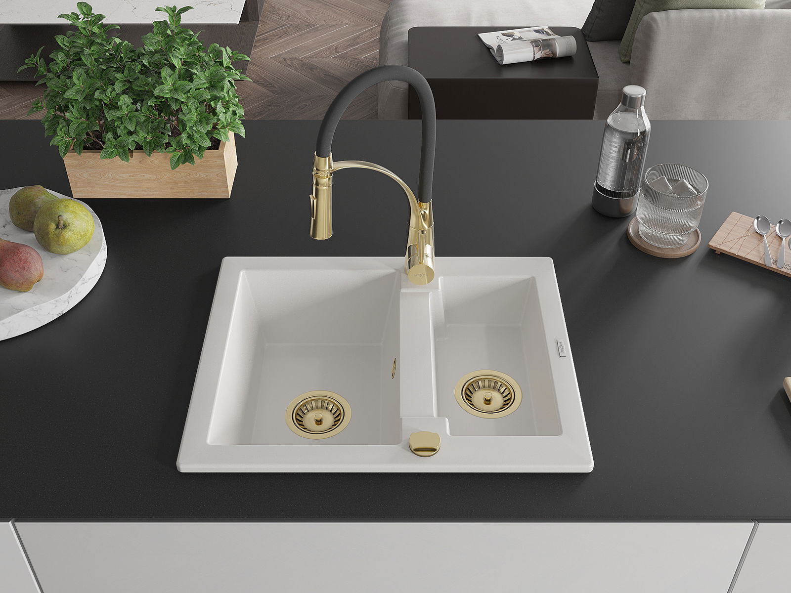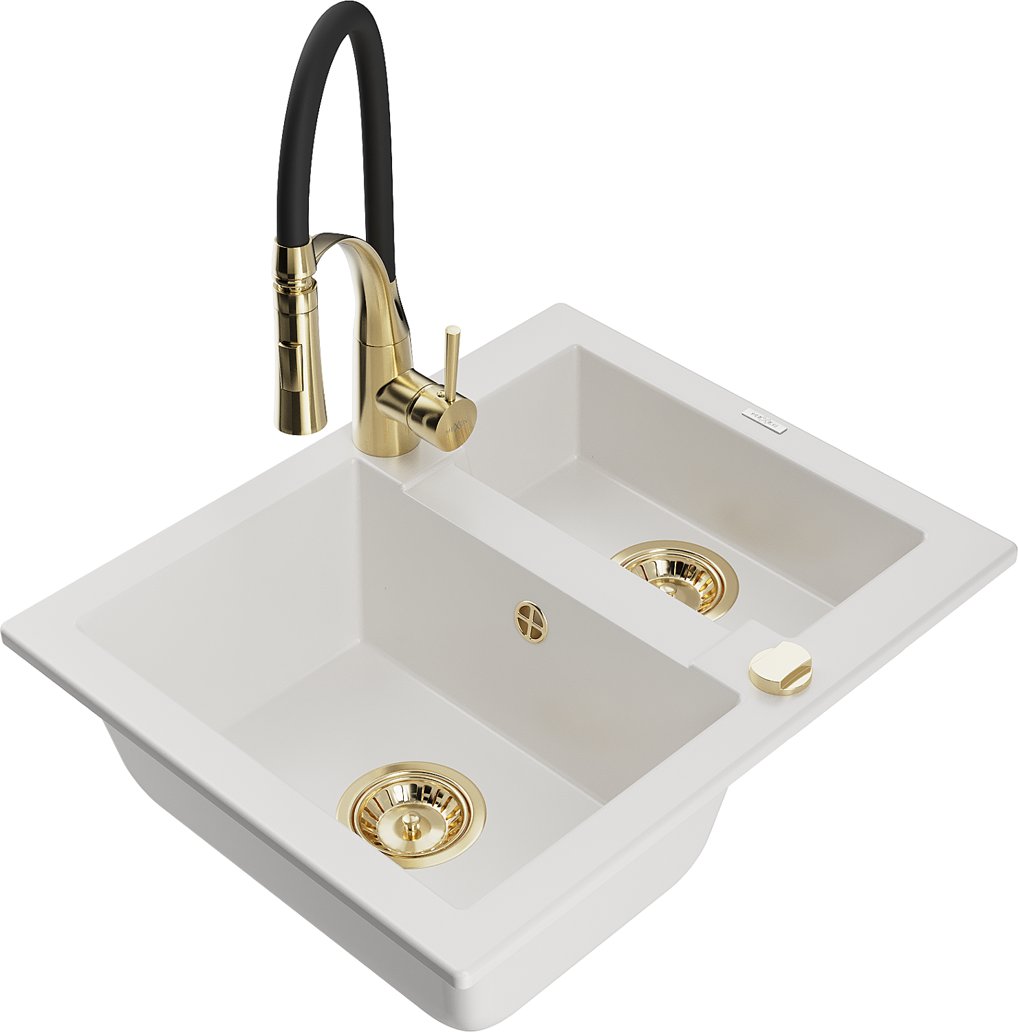 Mexen Carlos žulový dřez 1,5-komorový s kuchyňskou baterií Aster, bílý - 6518-20-73450-57-G