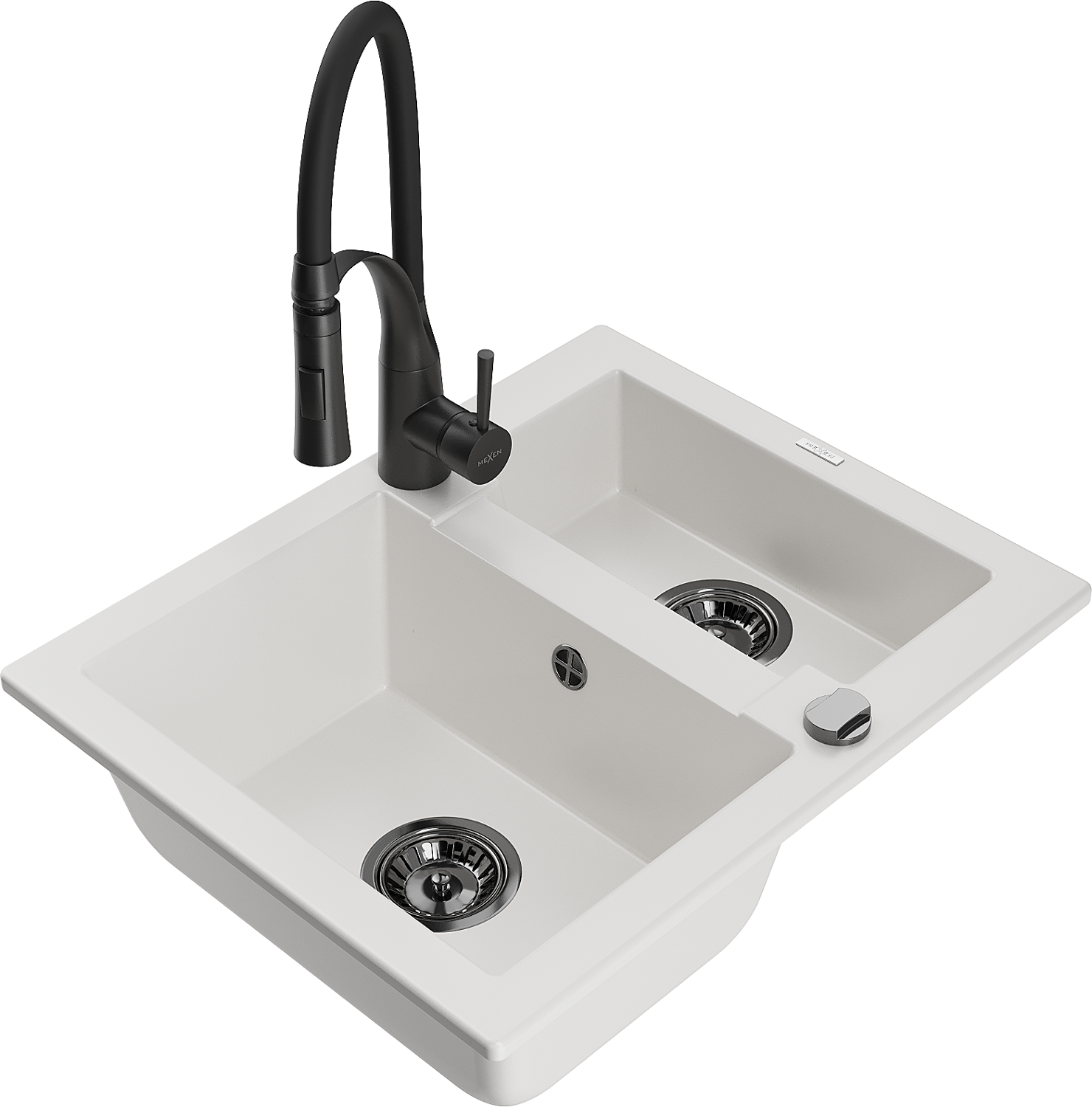 Mexen Carlos granitový dřez 1,5-komorový s kuchyňskou baterií Aster, bílý - 6518-20-73450-70-B