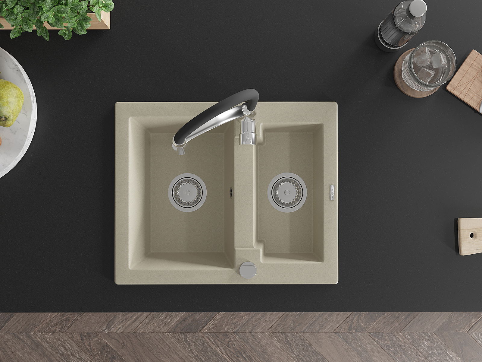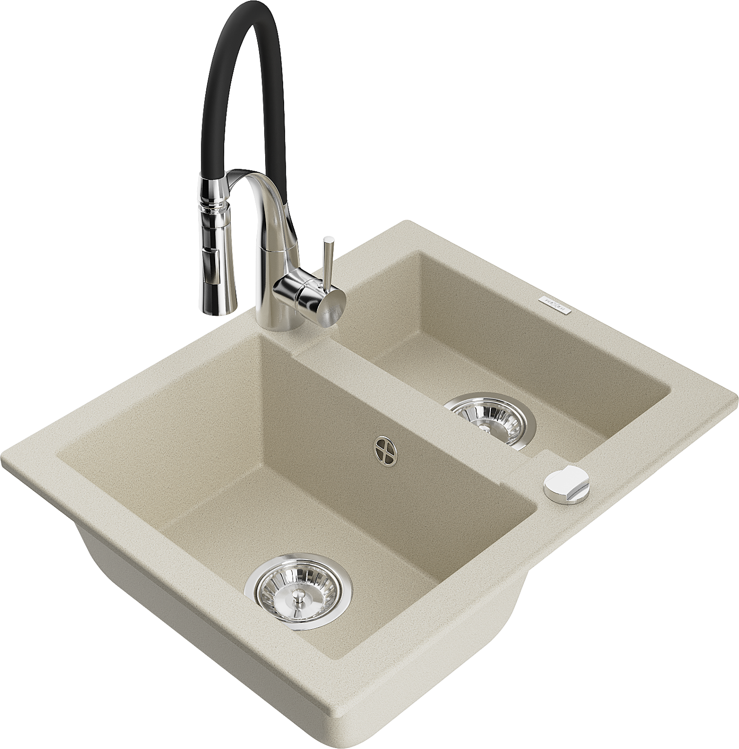 Mexen Carlos žulový dřez 1,5-komorový s kuchyňskou baterií Aster, béžový - 6518-69-73450-07