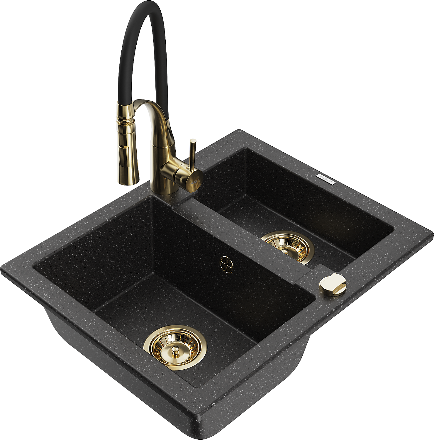 Mexen Carlos granitový dřez 1,5-komorový s kuchyňskou baterií Aster, černý/stříbrný metalík - 6518-73-73450-57-G