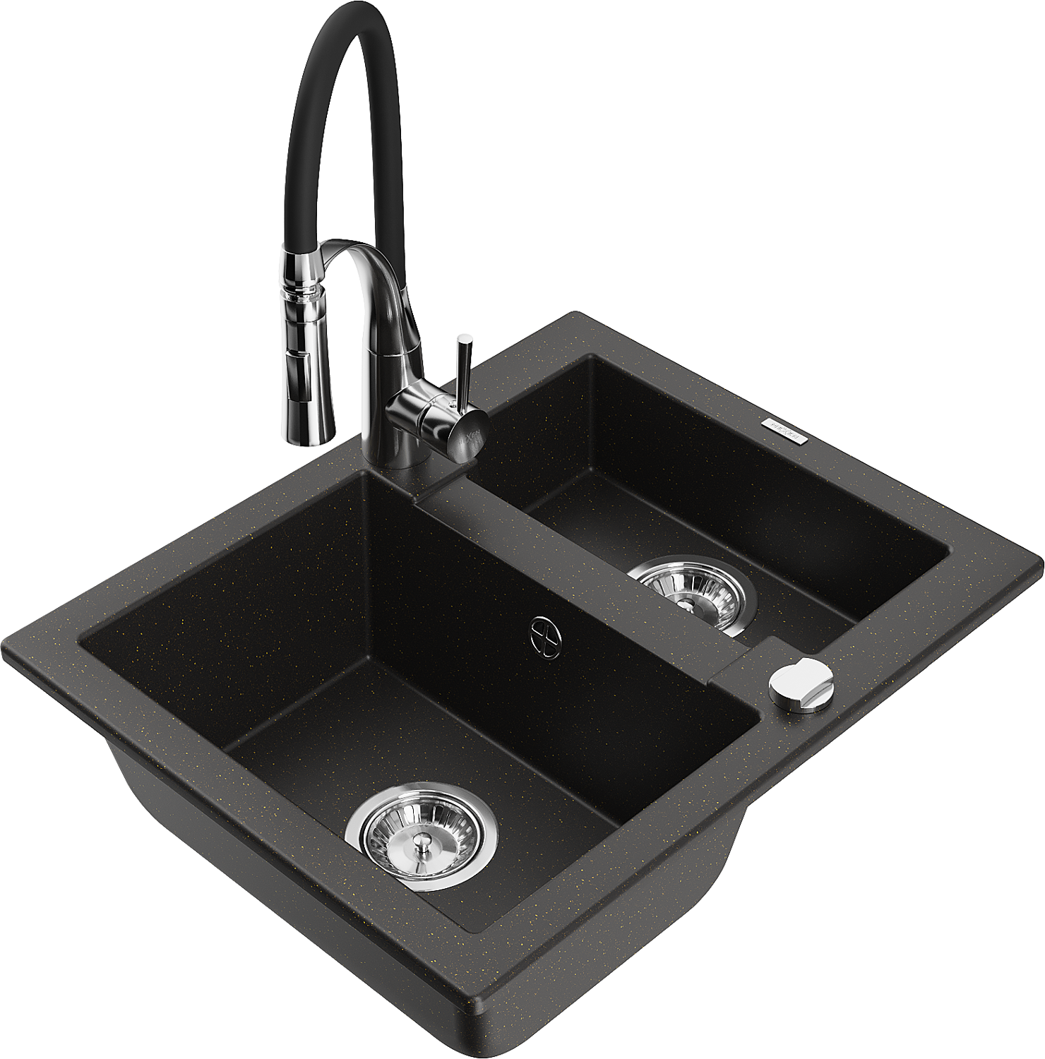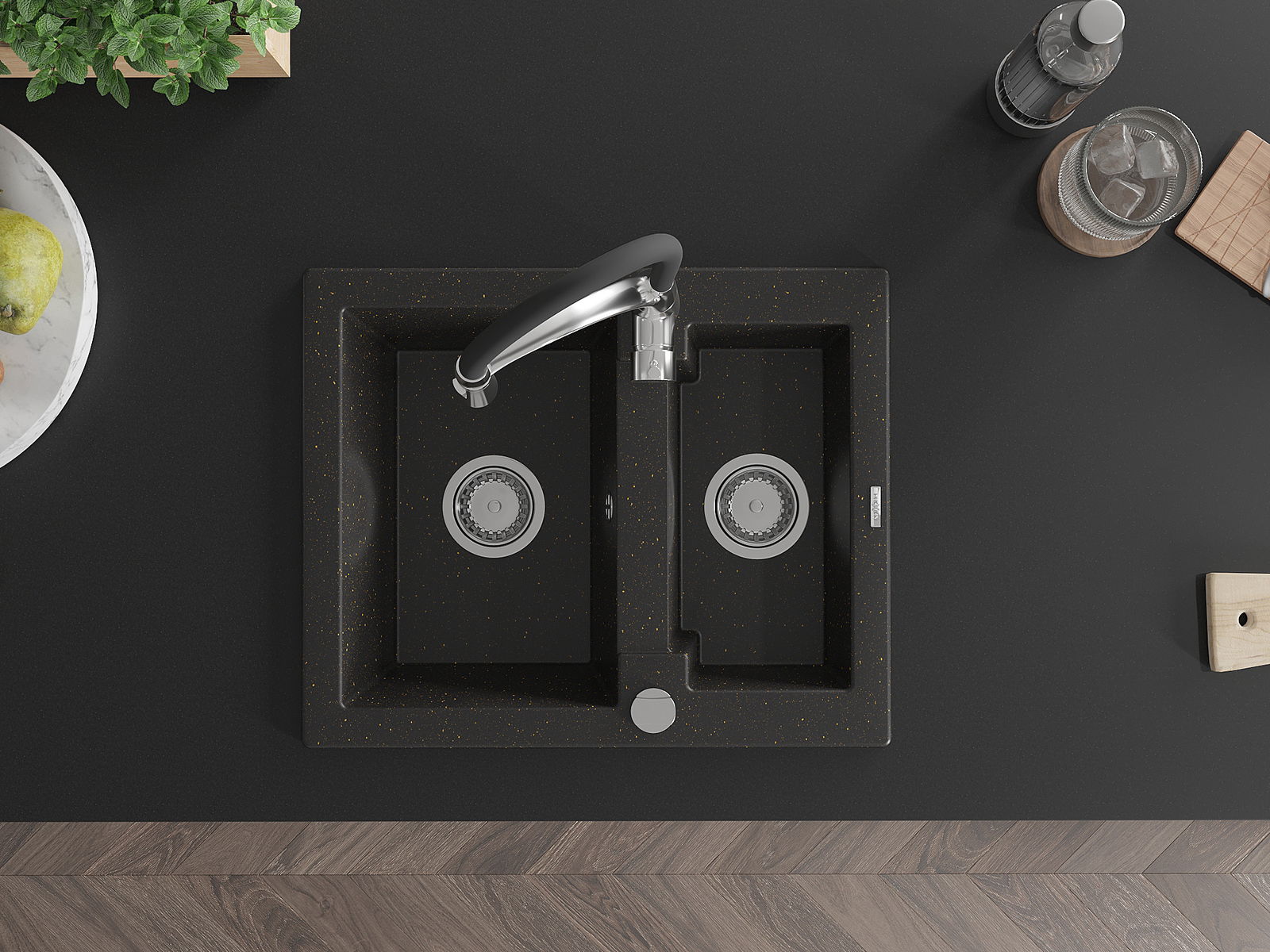 Mexen Carlos granitový dřez 1,5-komorový s kuchyňskou baterií Aster, černý/zlatý metalický - 6518-75-73450-07