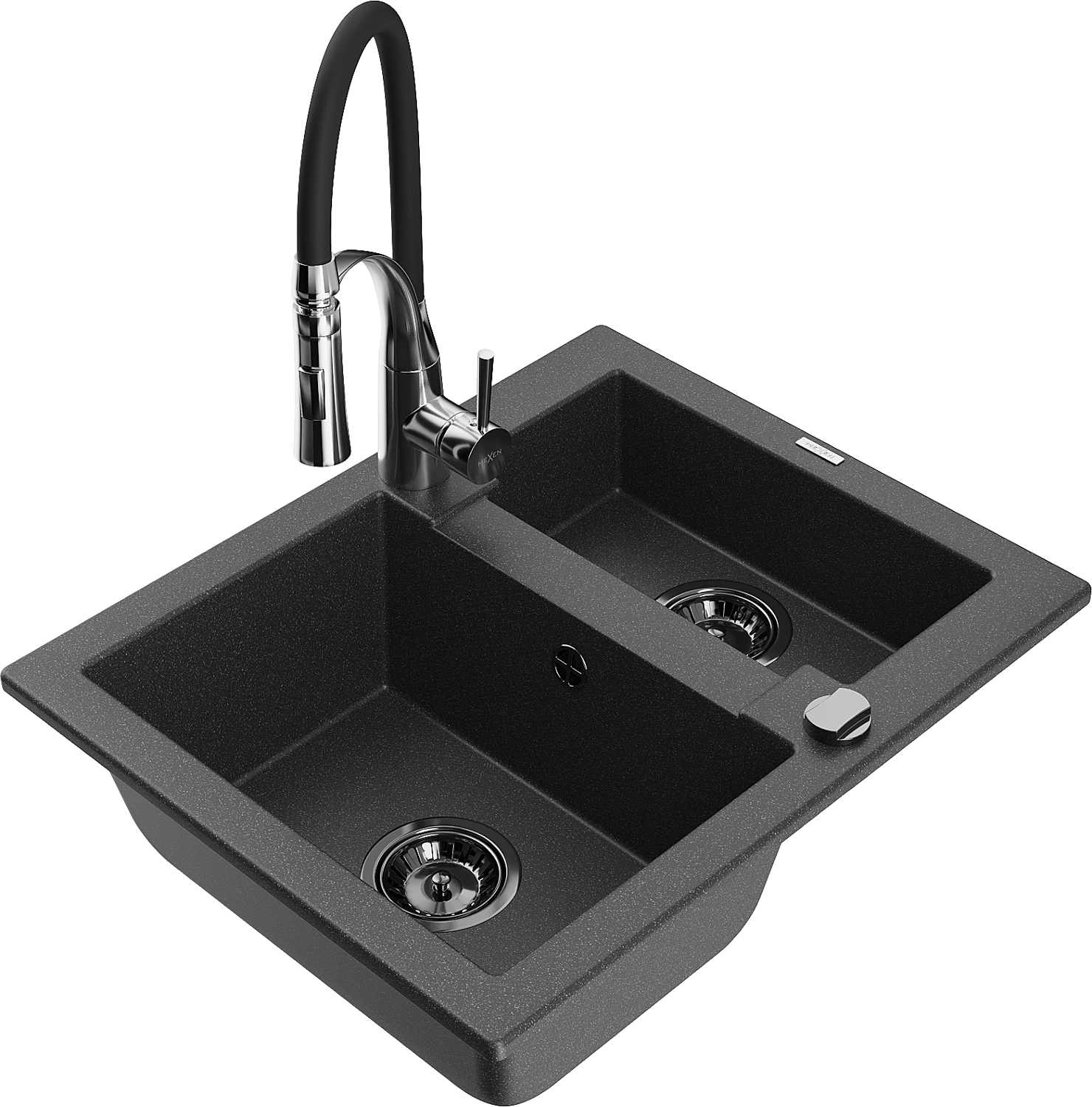 Mexen Carlos granitový dřez 1,5 komorový s kuchyňskou baterií Aster, černý skvrnitý - 6518-76-73450-07-B