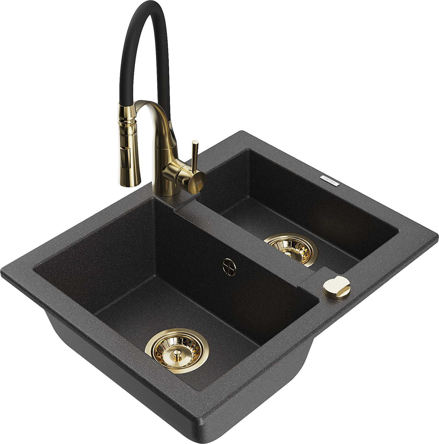 Mexen Carlos granitový dřez 1,5-komorový s kuchyňskou baterií Aster, černý skvrnitý - 6518-76-73450-57-G