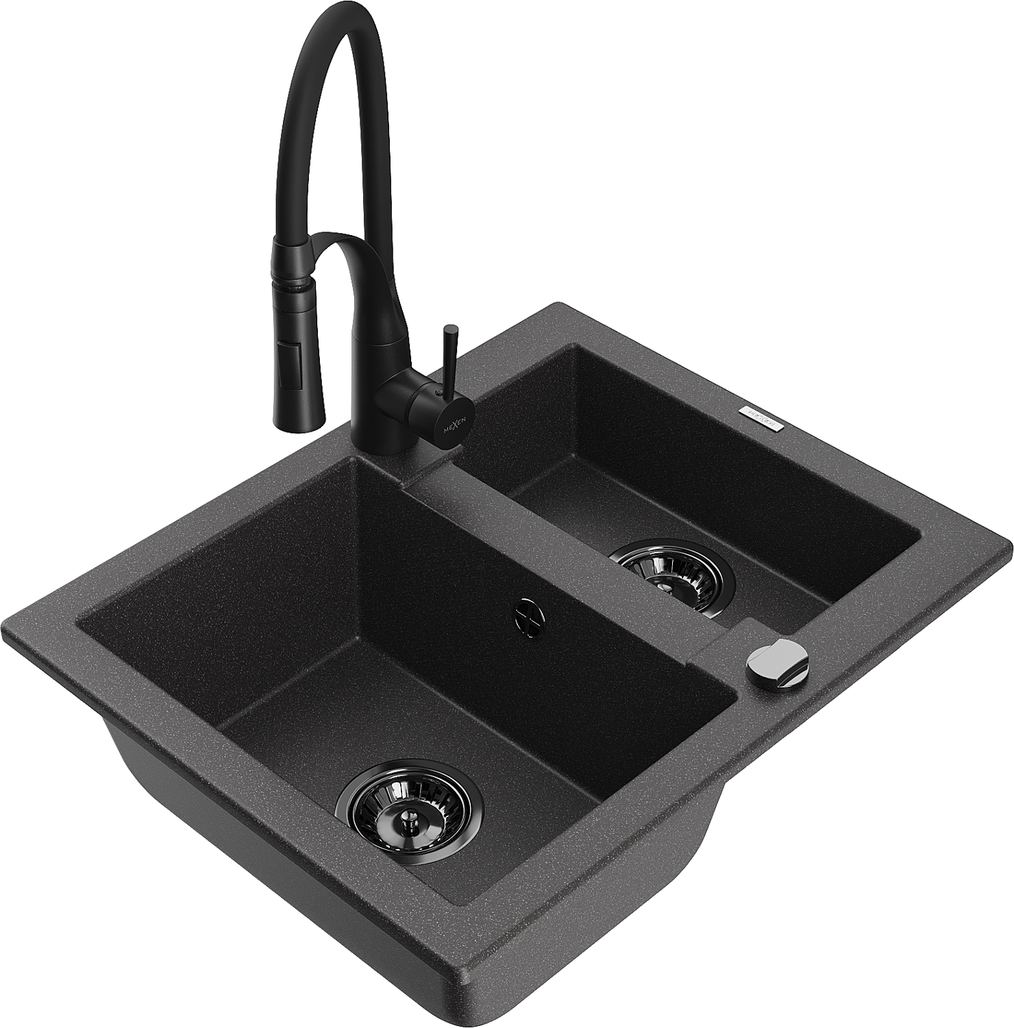 Mexen Carlos granitový dřez 1,5-komorový s kuchyňskou baterií Aster, černý s puntíky - 6518-76-73450-70-B