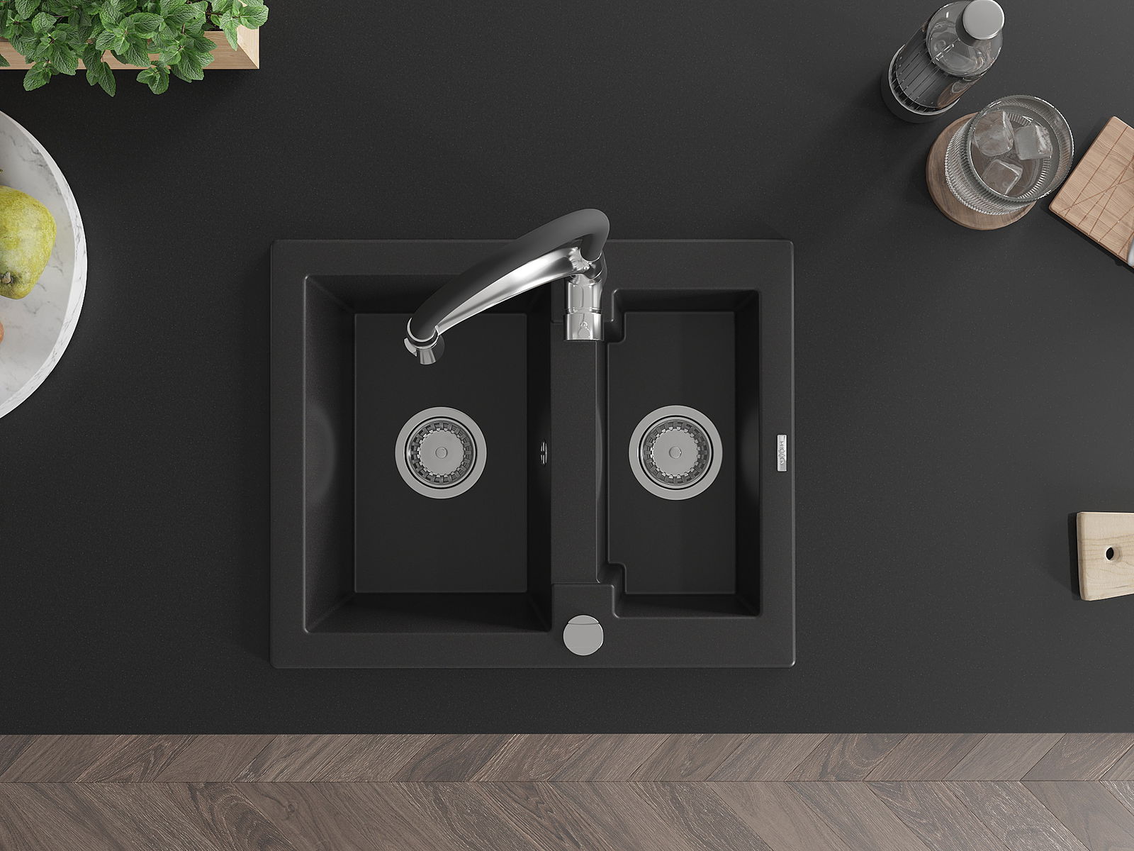 Mexen Carlos granitový dřez 1,5-komorový s kuchyňskou baterií Aster, černý - 6518-77-73450-07