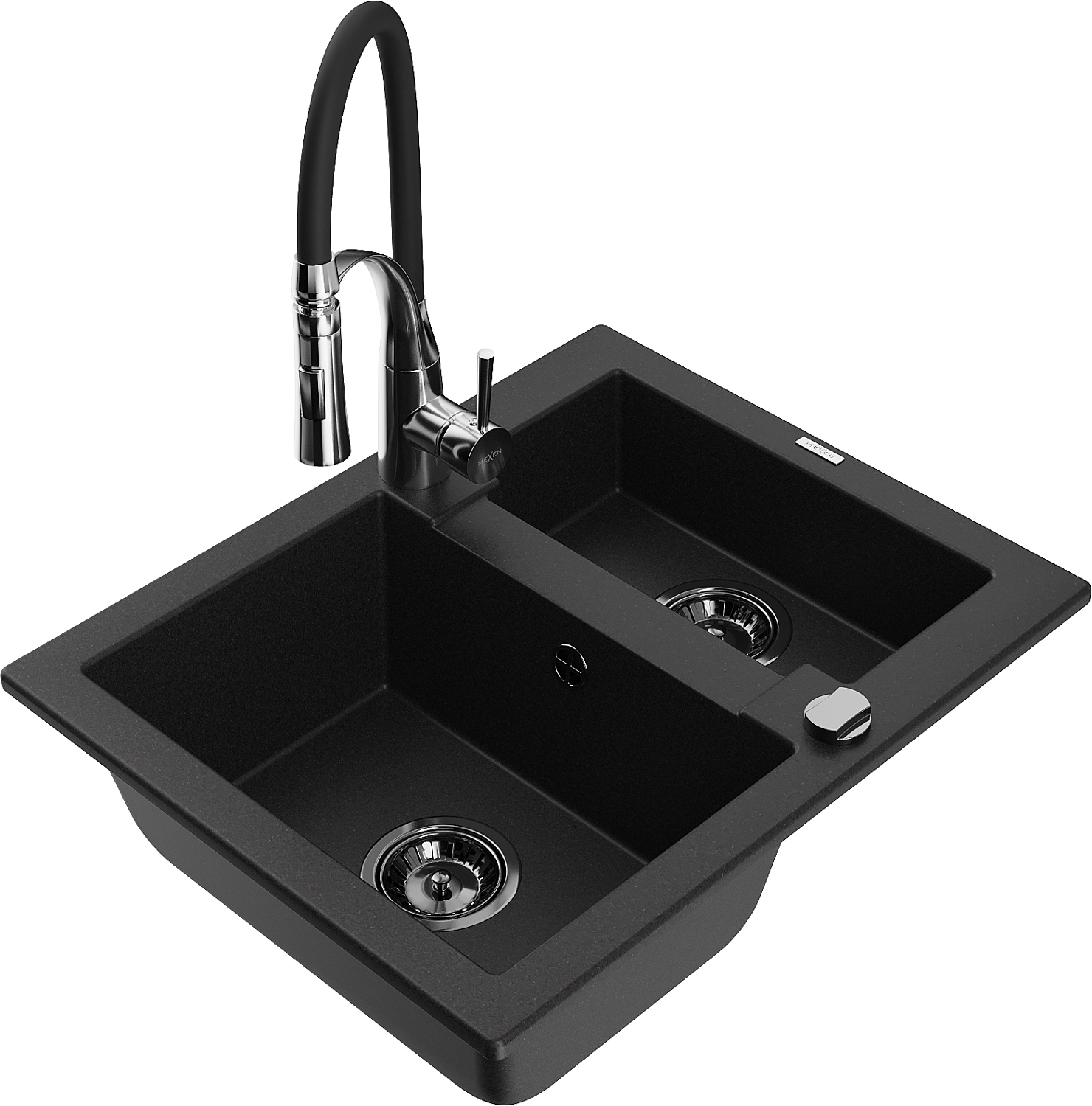 Mexen Carlos granitový dřez 1,5komorový s kuchyňskou baterií Aster, černý - 6518-77-73450-07-B