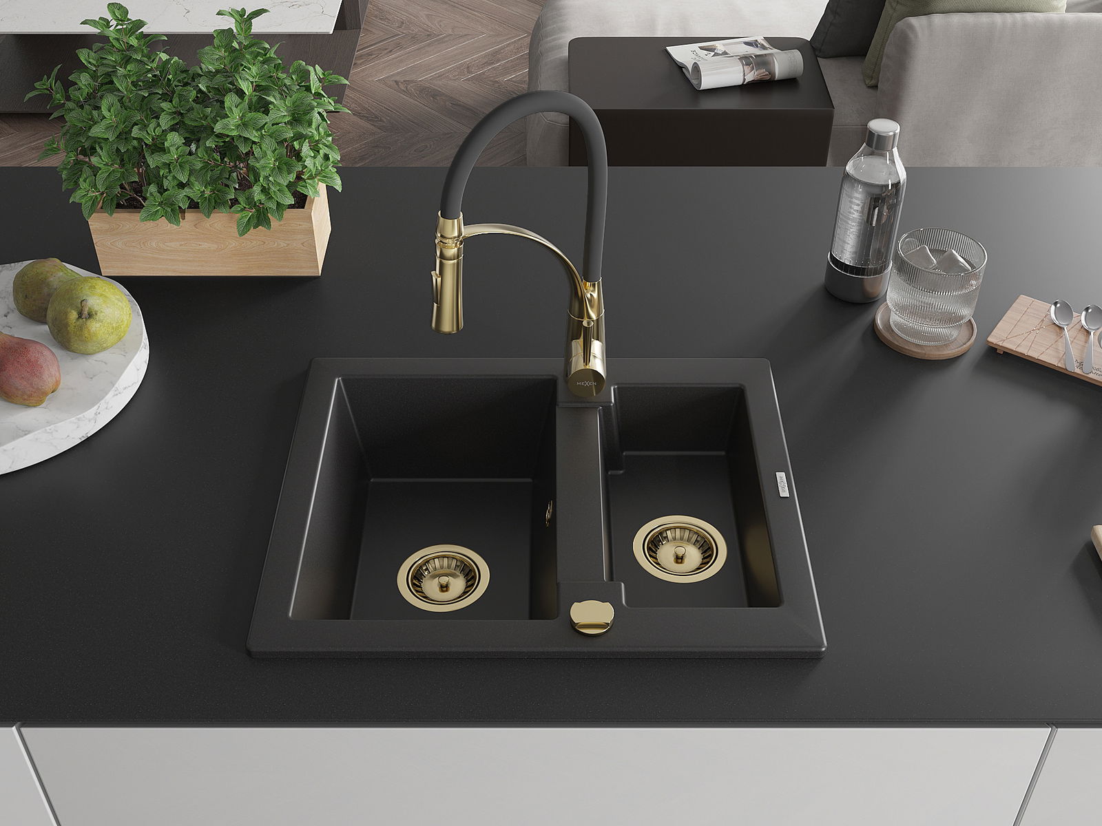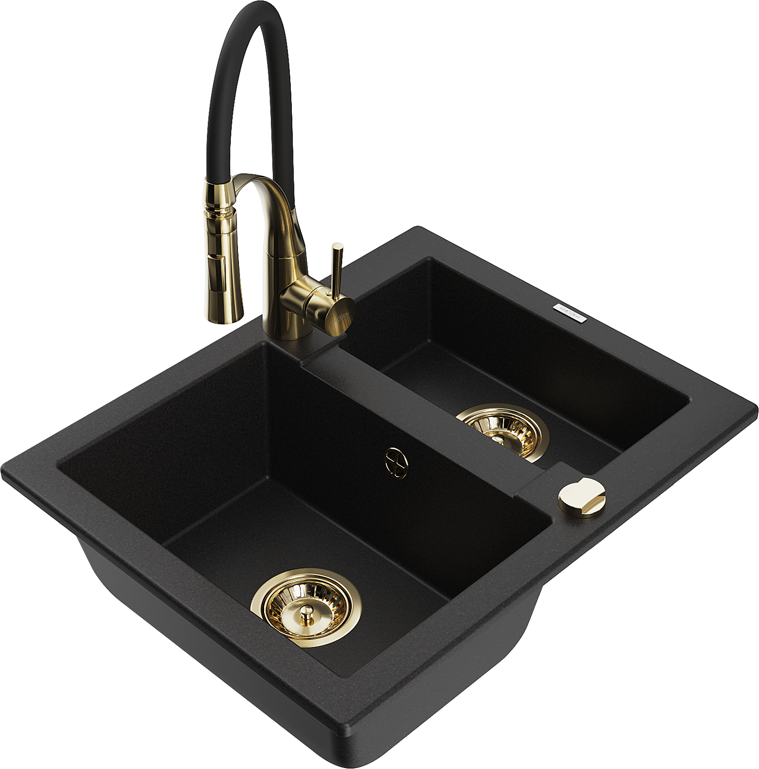 Mexen Carlos žulový dřez 1,5-komorový s kuchyňskou baterií Aster, černý - 6518-77-73450-57-G