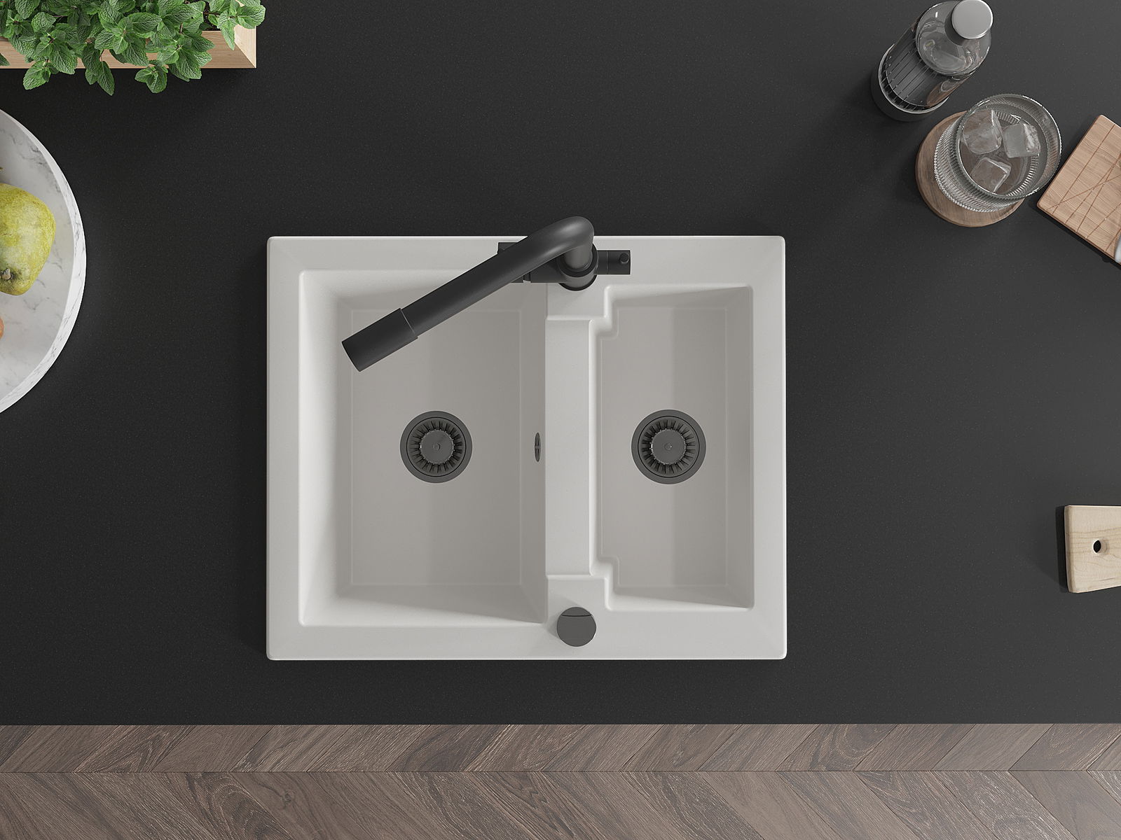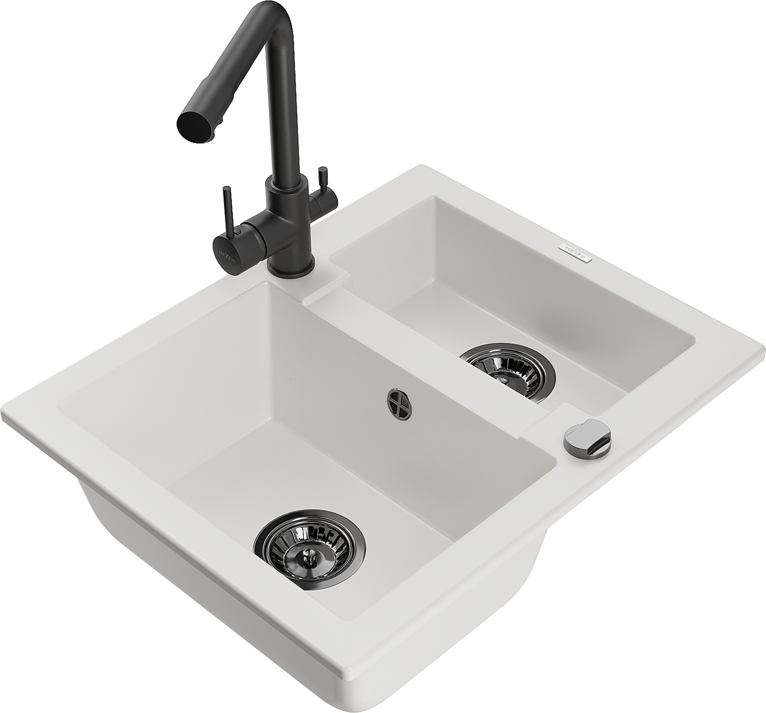 Mexen Carlos granitový dřez 1,5-komorový s kuchyňskou baterií Duero, bílý - 6518-20-671600-70