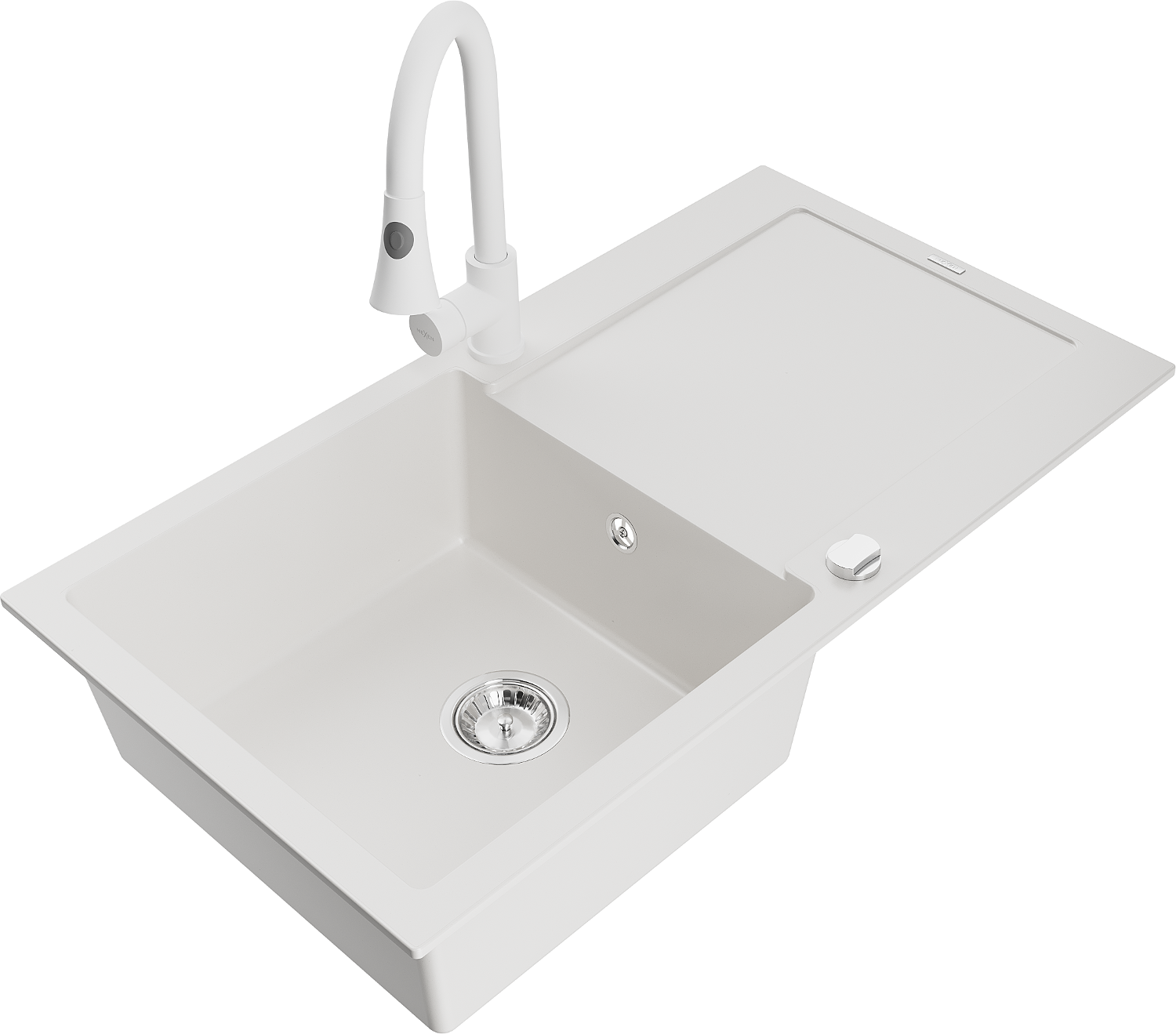 Mexen Leo granitový dřez 1-komorový s odkapávačem a kuchyňskou baterií Elia, bílý - 6501-20-670101-20