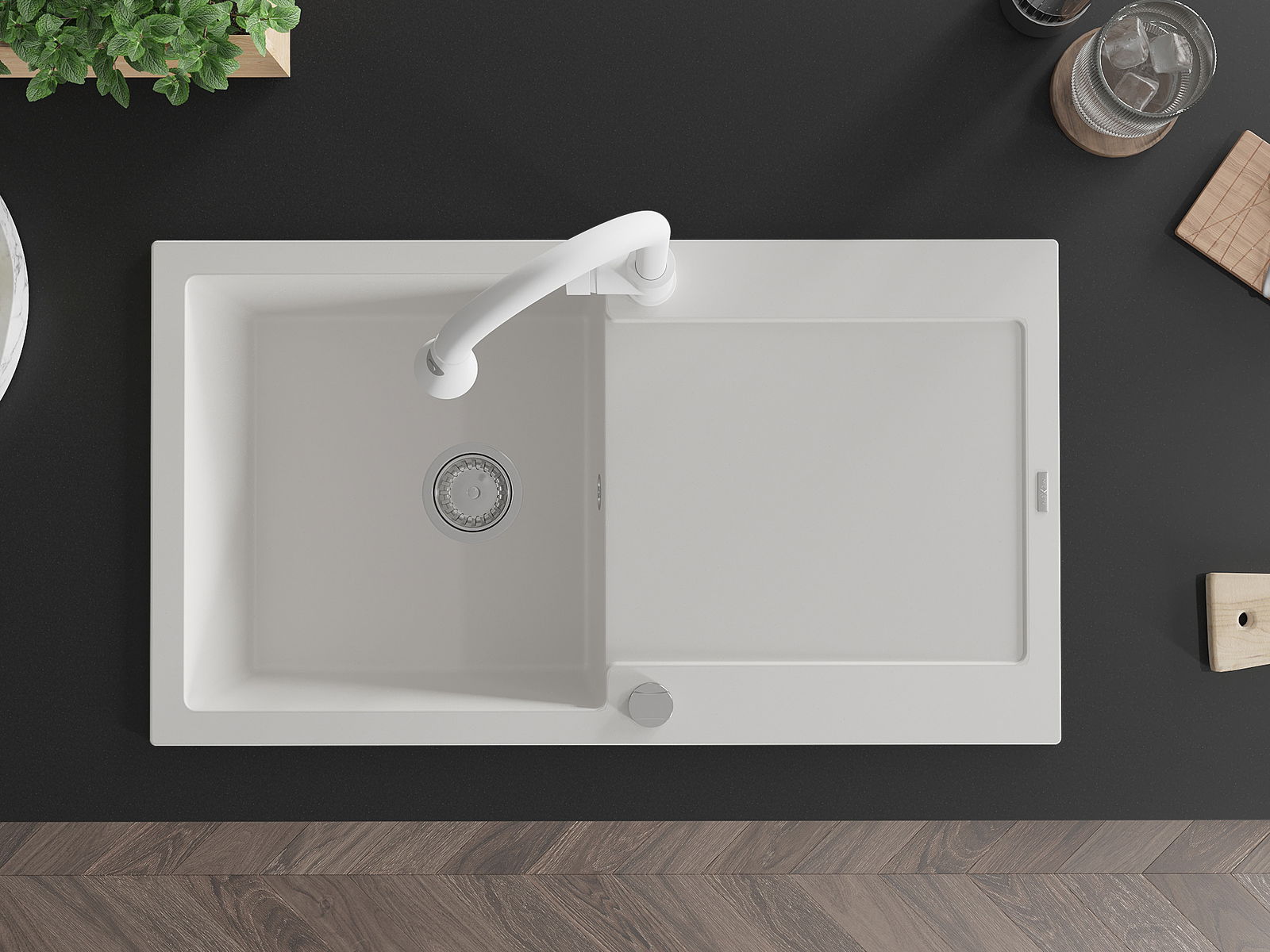 Povrch dřezu je odolný proti skvrnám a zabarvení, což usnadňuje jeho čištění a zachovává jeho barvu po dlouhou dobu používání. Estetický a praktický doplněk každé kuchyně.