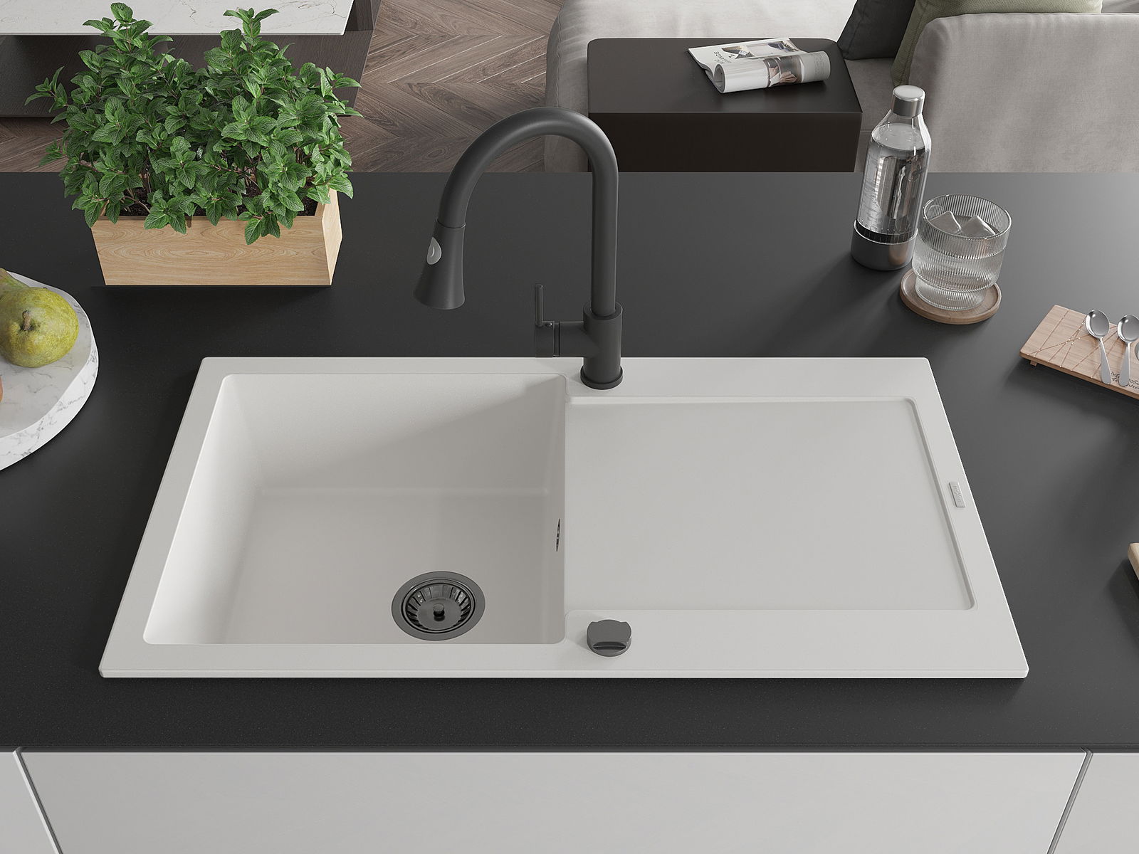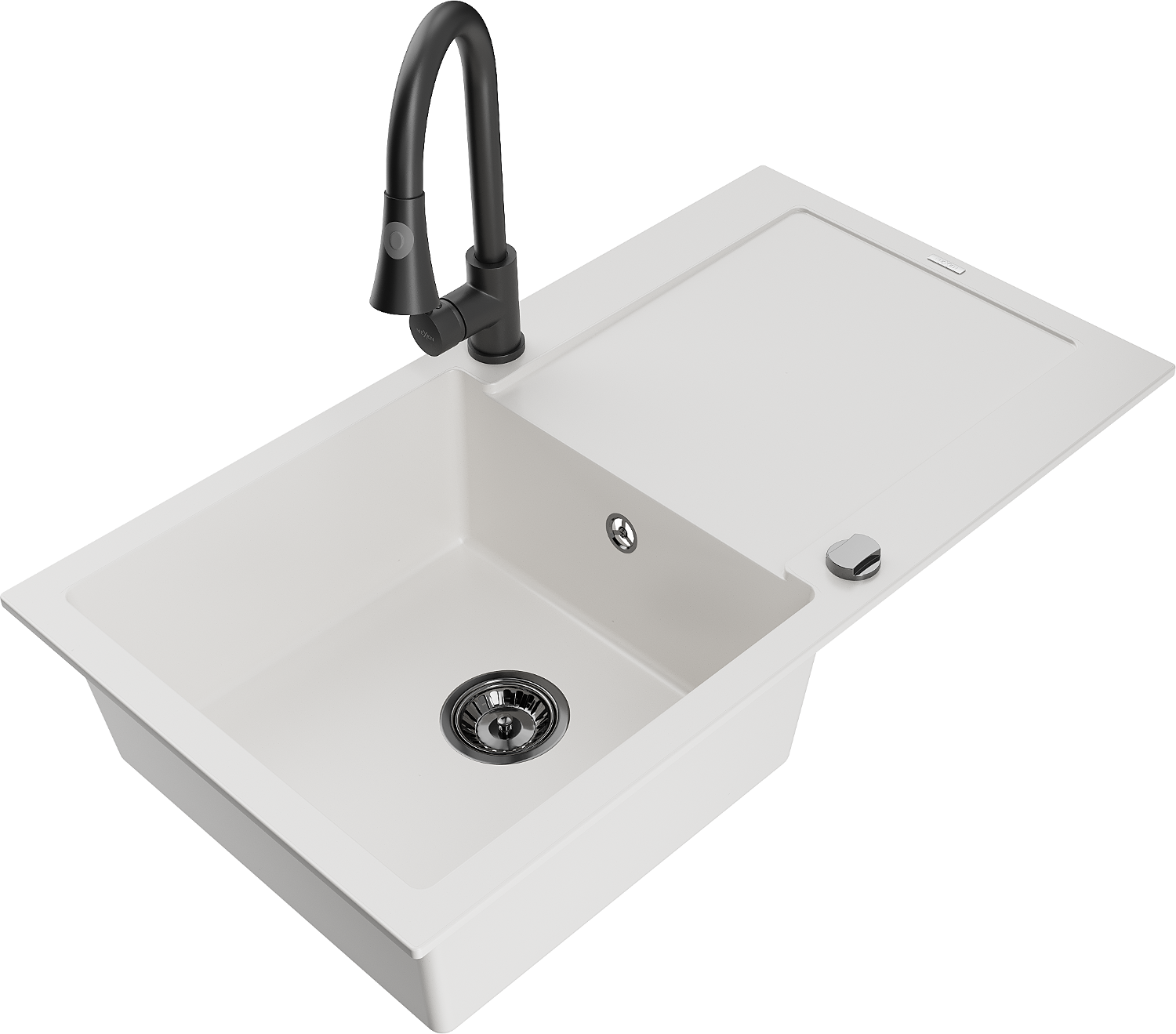 Mexen Leo granitový dřez 1-komorový s odkapávačem a kuchyňskou baterií Elia, bílý - 6501-20-670101-70