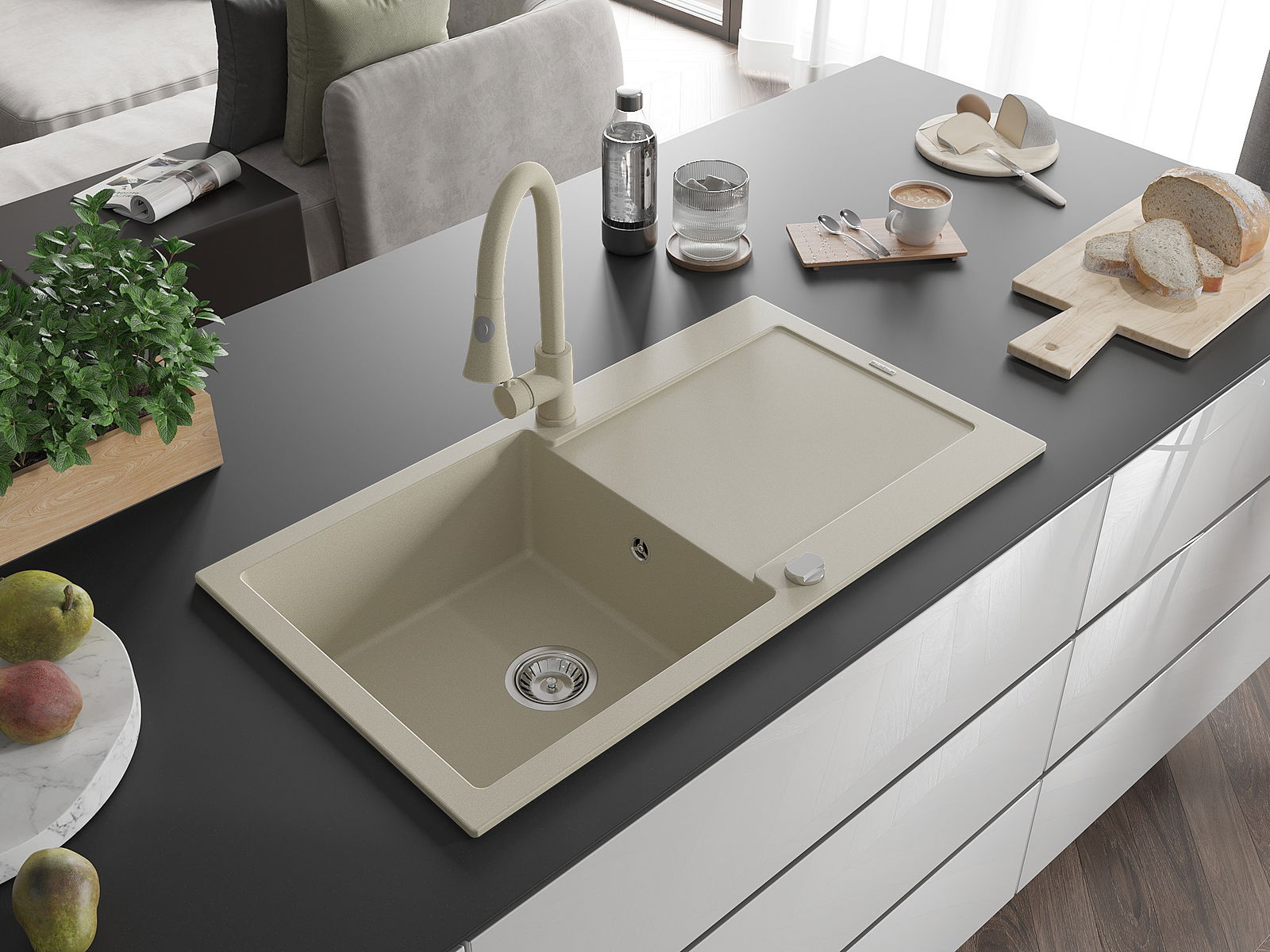 Mexen Leo granitový dřez 1-komorový s odkapávačem a kuchyňskou baterií Elia, béžový - 6501-69-670101-69