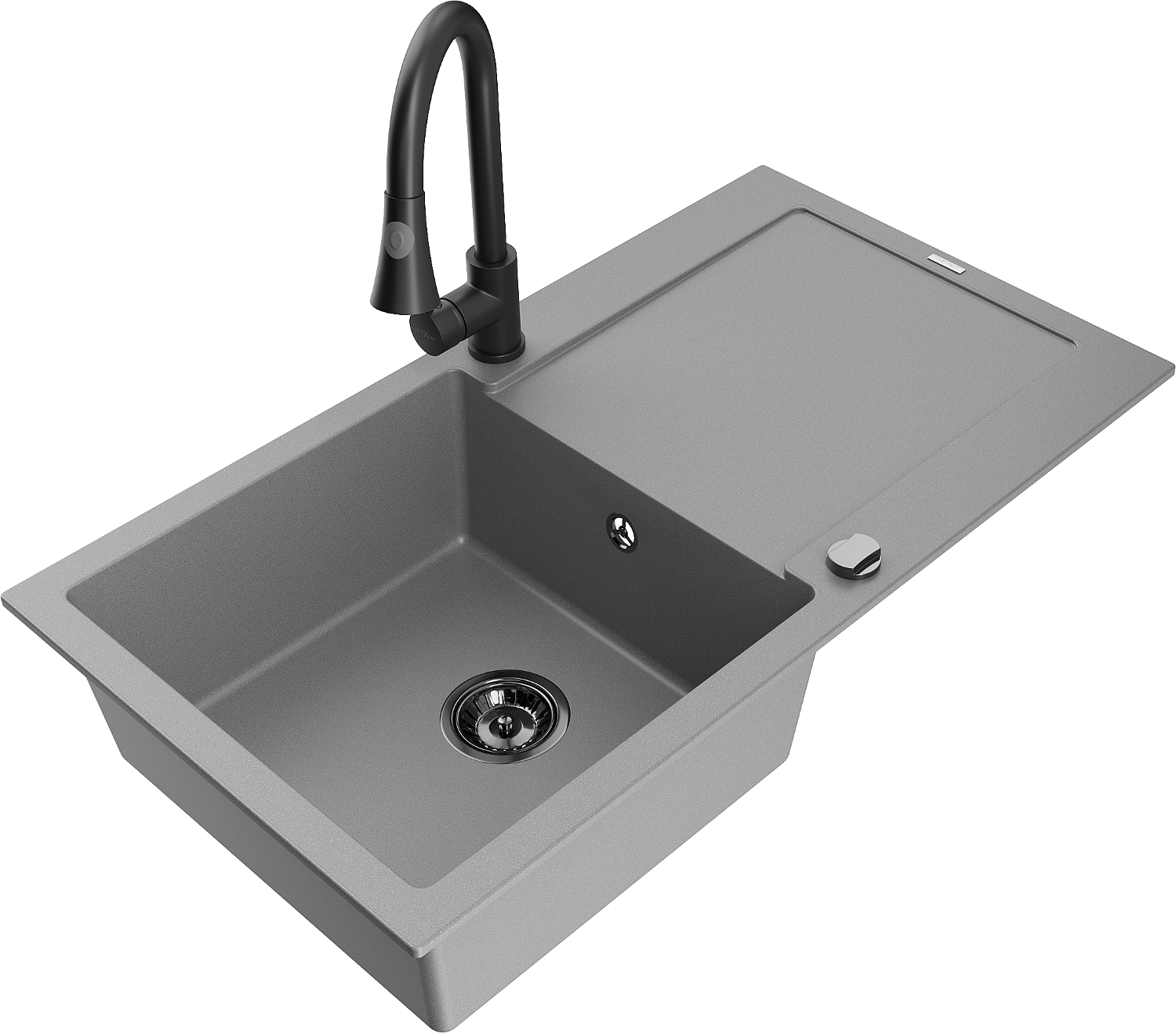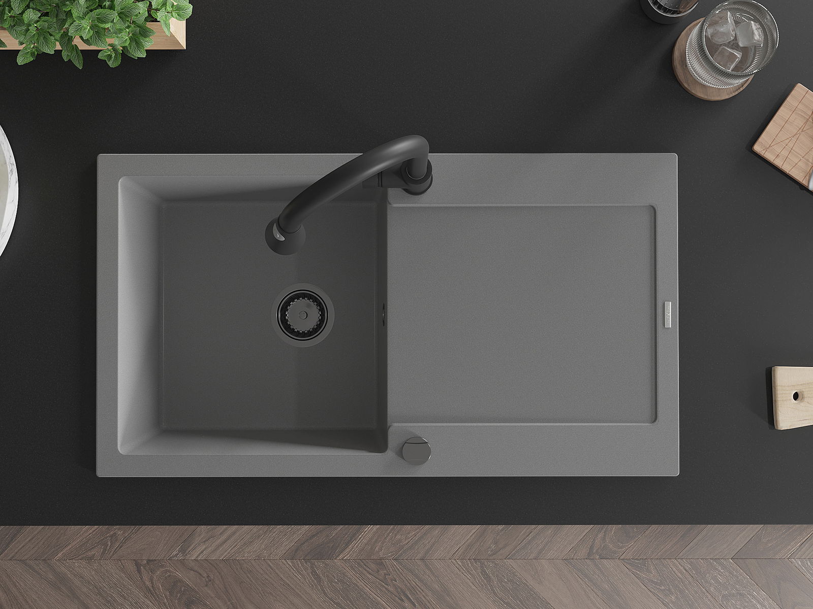 Mexen Leo granitový kuchyňský dřez s 1 komorou, odkapávačem a kuchyňskou baterií Elia, šedý - 6501-71-670101-70-B