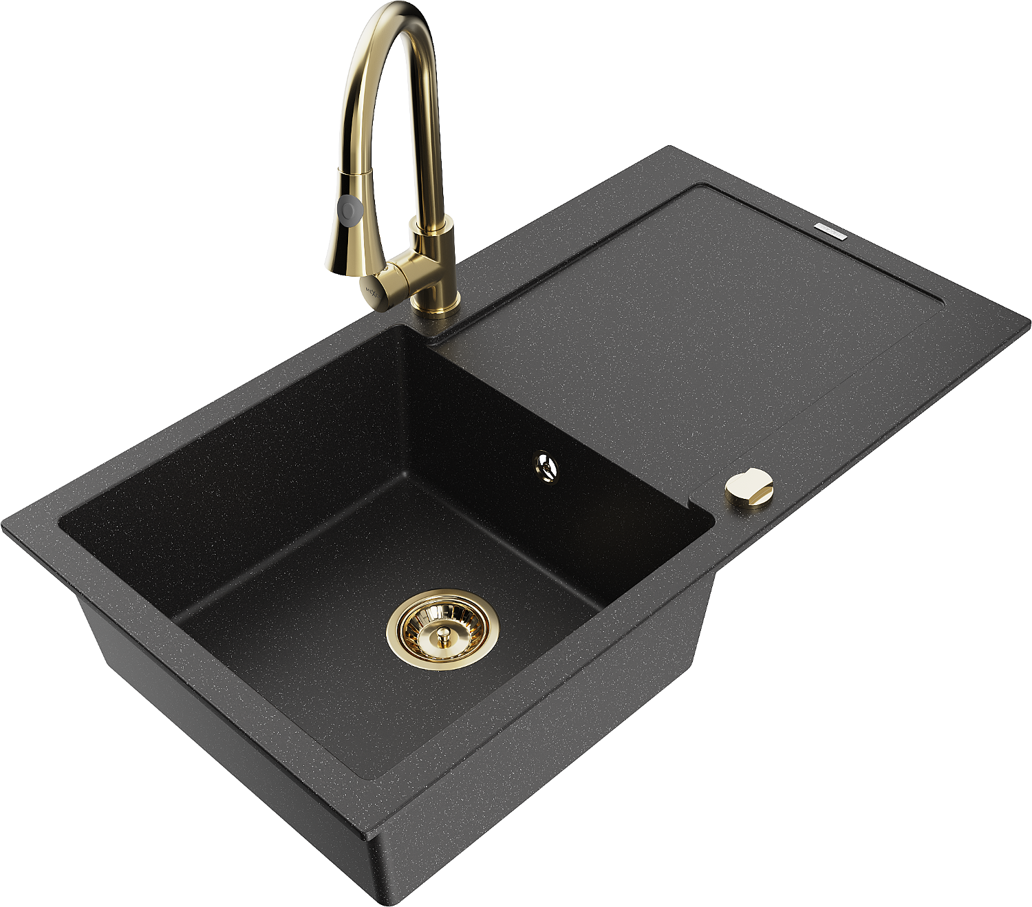 Mexen Leo jednokomorový granitový dřez s odkapávačem a kuchyňskou baterií Elia, černý/stříbrný metalik - 6501-73-670101-50