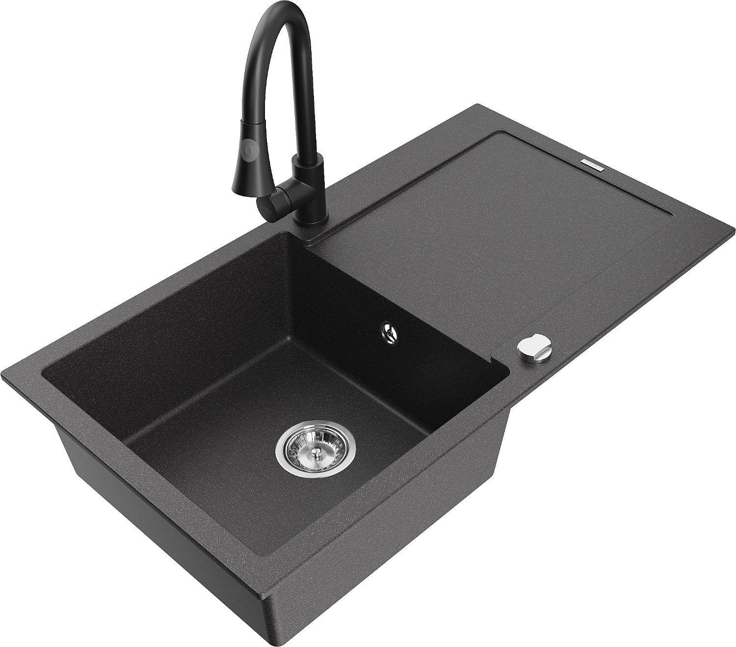 Mexen Leo granitový dřez 1-komorový s odkapávačem a kuchyňskou baterií Elia, černý skvrnitý - 6501-76-670101-70