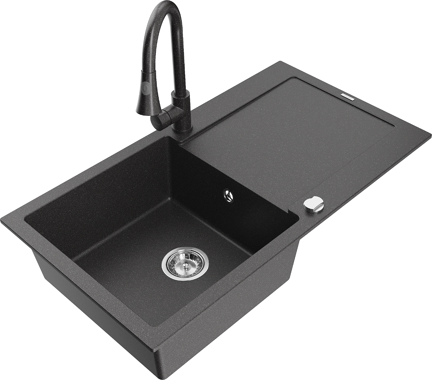 Mexen Leo granitový dřez 1-komorový s odkapávačem a kuchyňskou baterií Elia, černý skvrnitý - 6501-76-670101-76