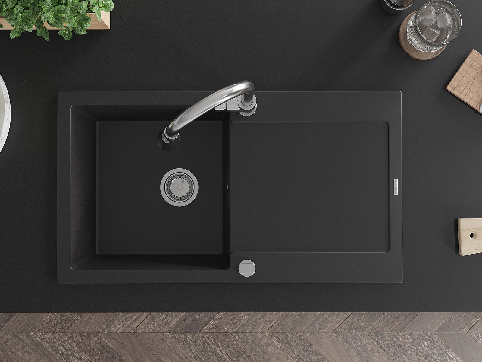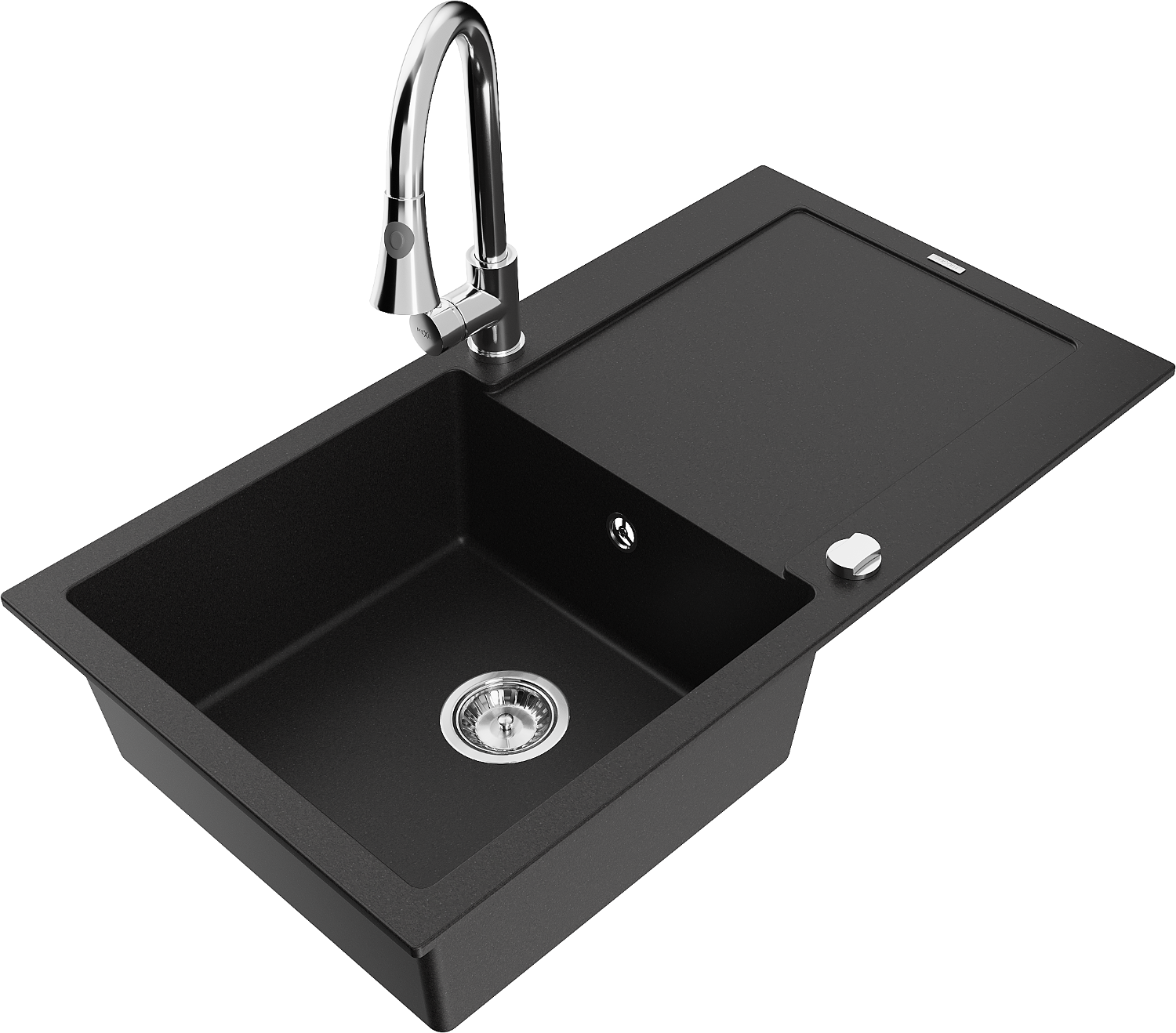 Mexen Leo granitový dřez 1-komorový s odkapávačem a kuchyňskou baterií Elia, černý - 6501-77-670101-00