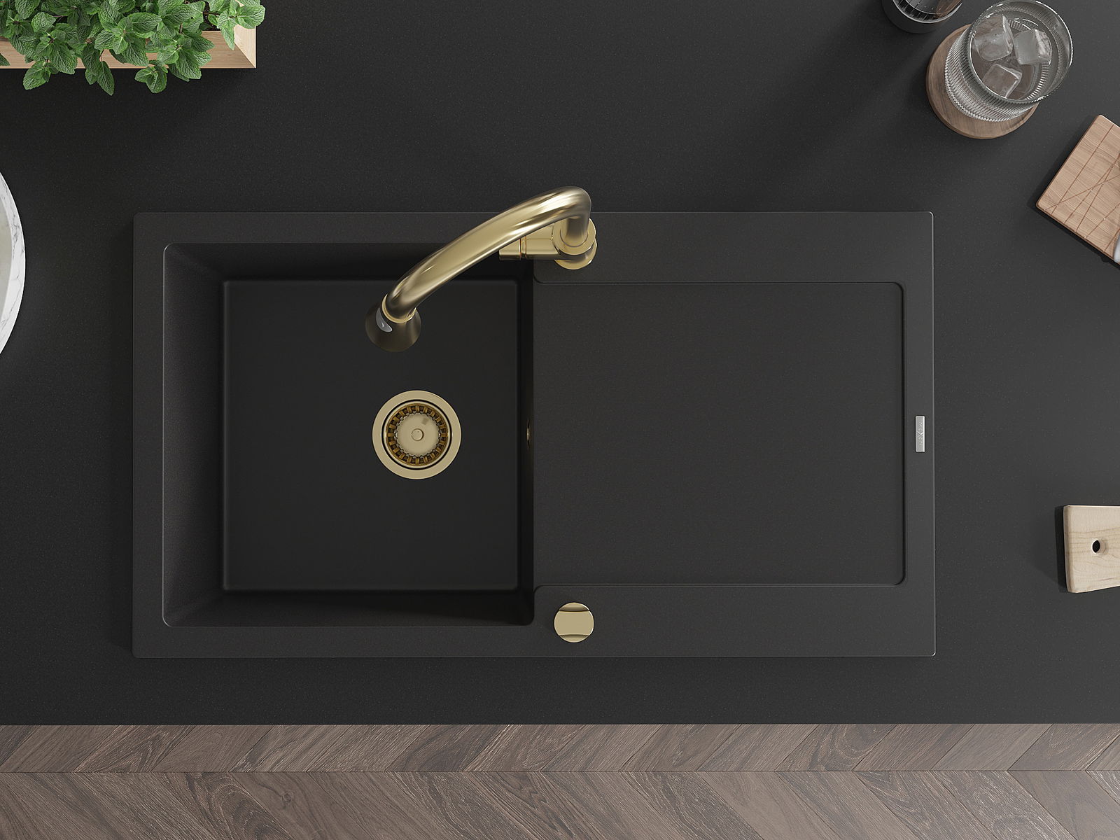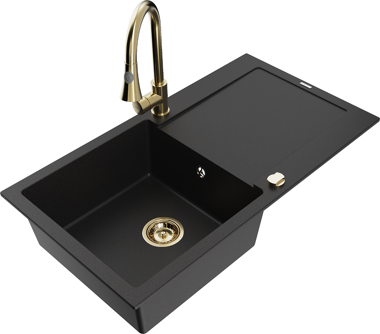 Mexen Leo granitový dřez s 1 komorou, odkapávačem a kuchyňskou baterií Elia, černý - 6501-77-670101-50