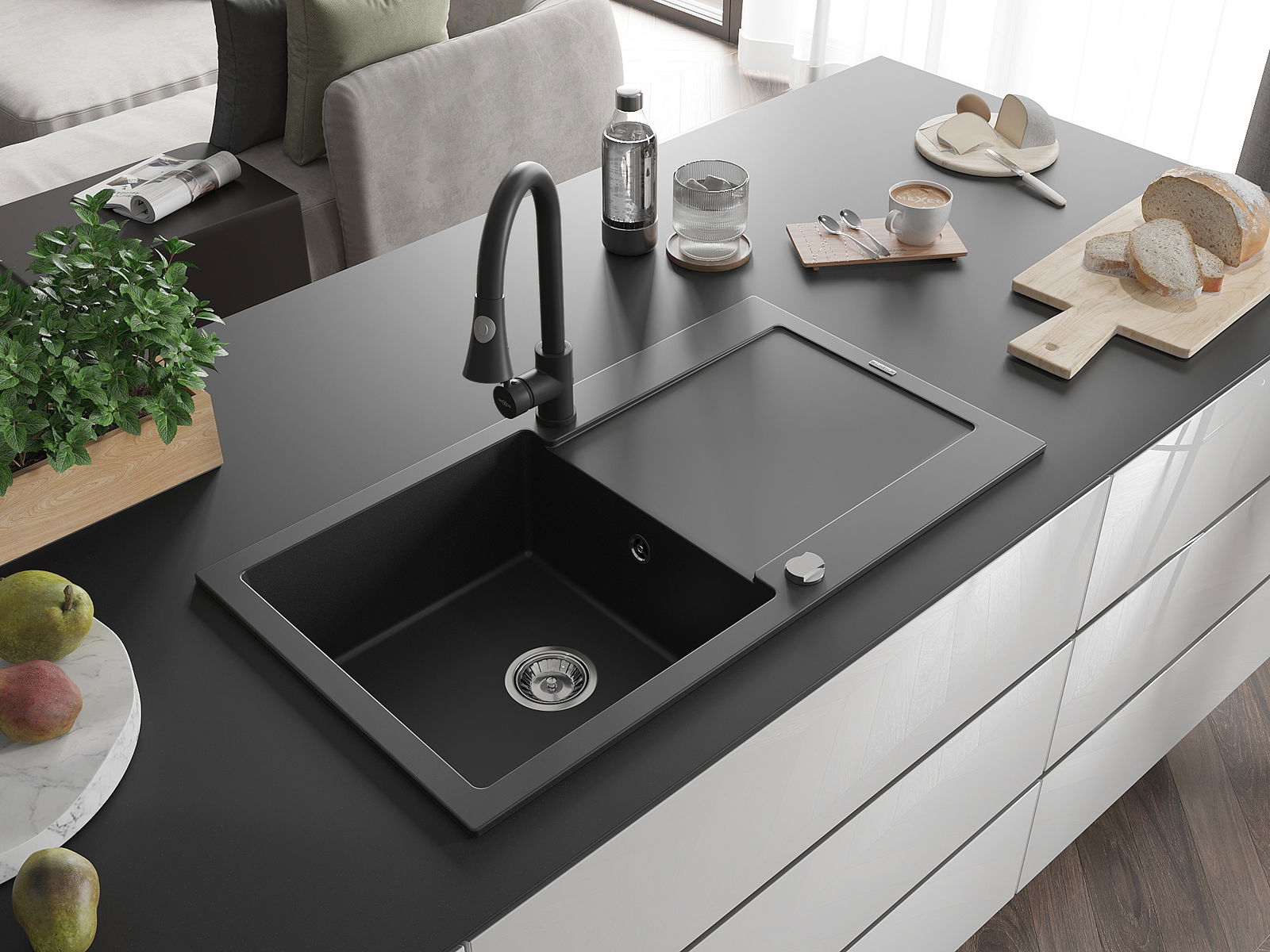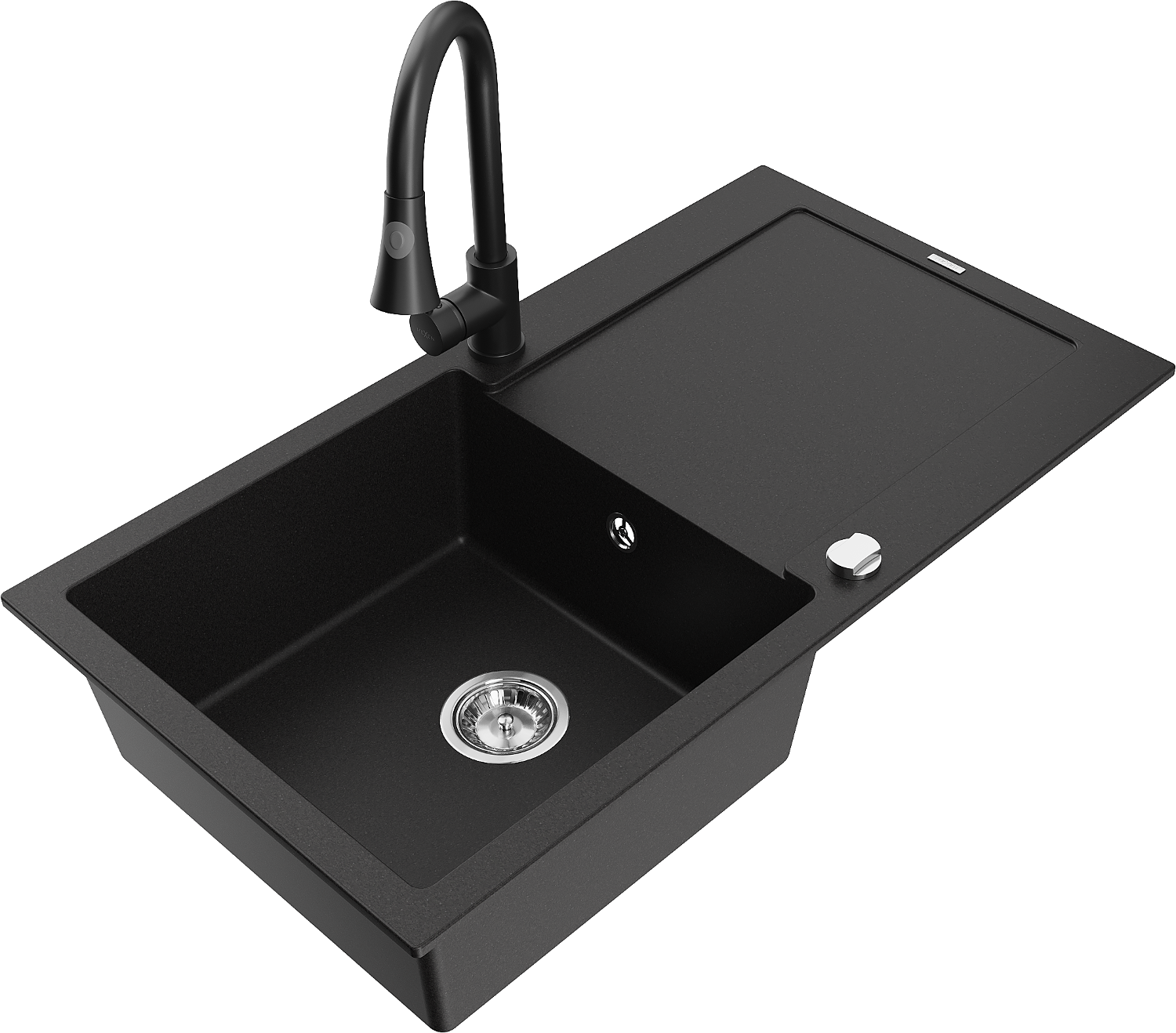 Mexen Leo 1-komorový žulový dřez s odkapávačem a kuchyňskou baterií Elia, černý - 6501-77-670101-70