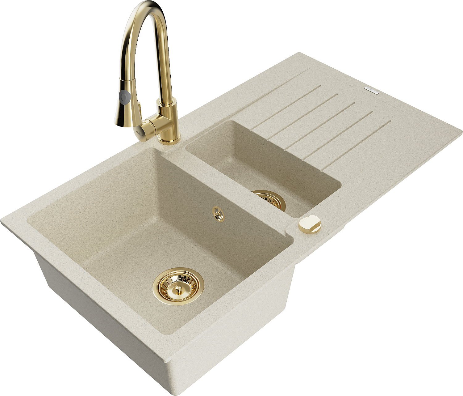Mexen Matias granitový dřez 1,5-komorový s odkapávačem a kuchyňskou baterií Elia, béžový - 6502-69-670101-50