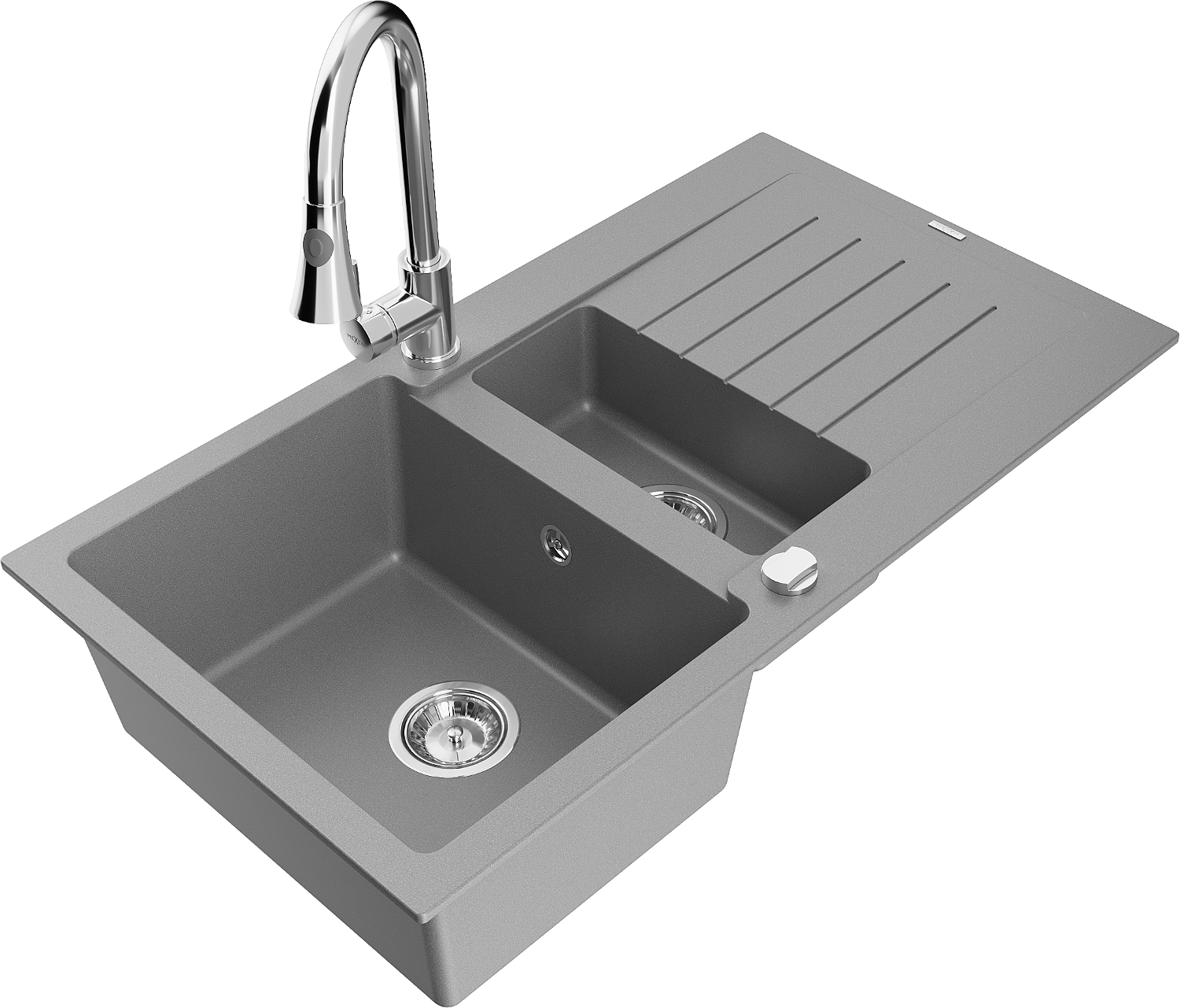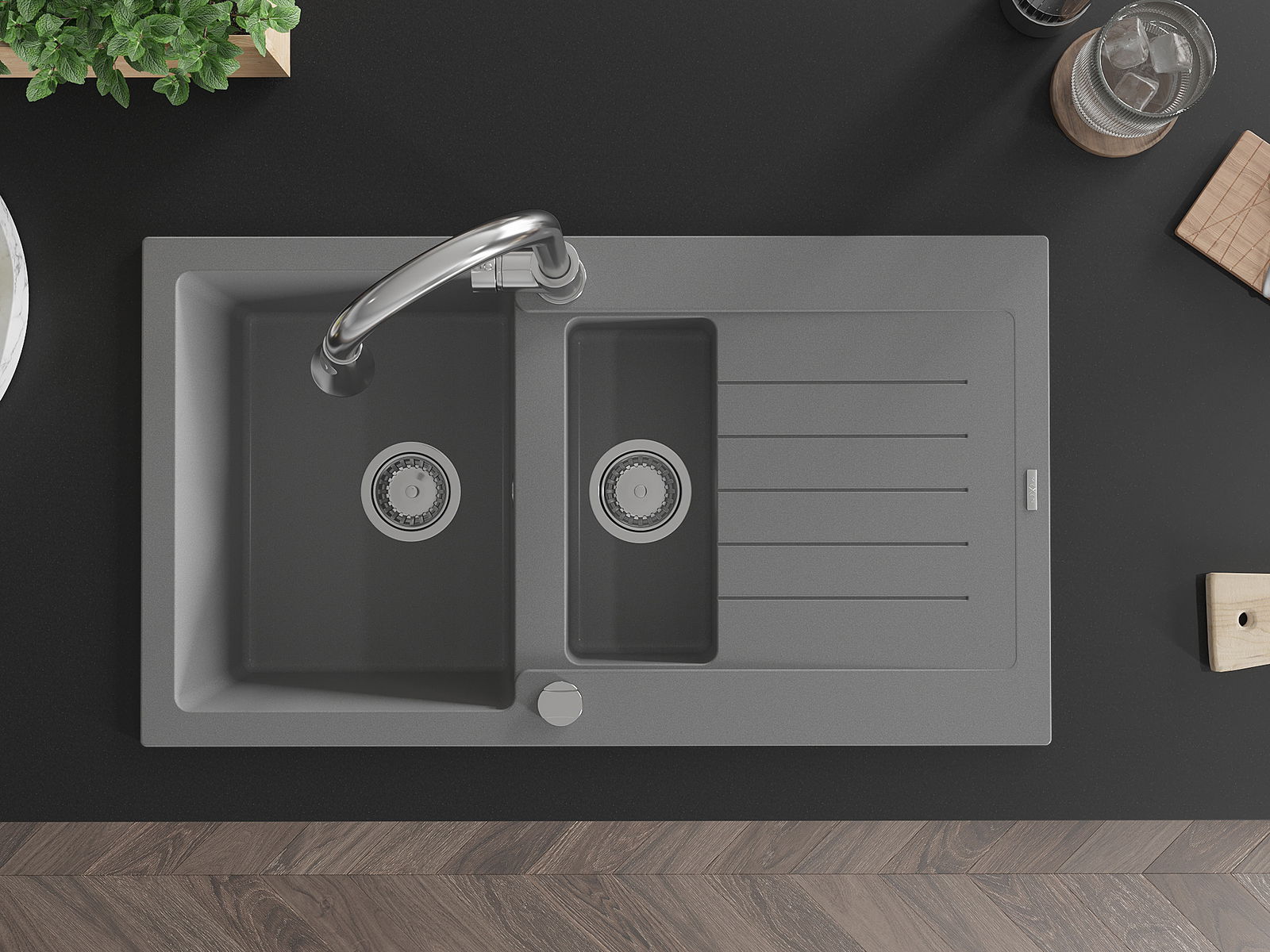 Mexen Matias granitový dřez 1,5-komorový s odkapávačem a kuchyňskou baterií Elia, šedý - 6502-71-670101-00