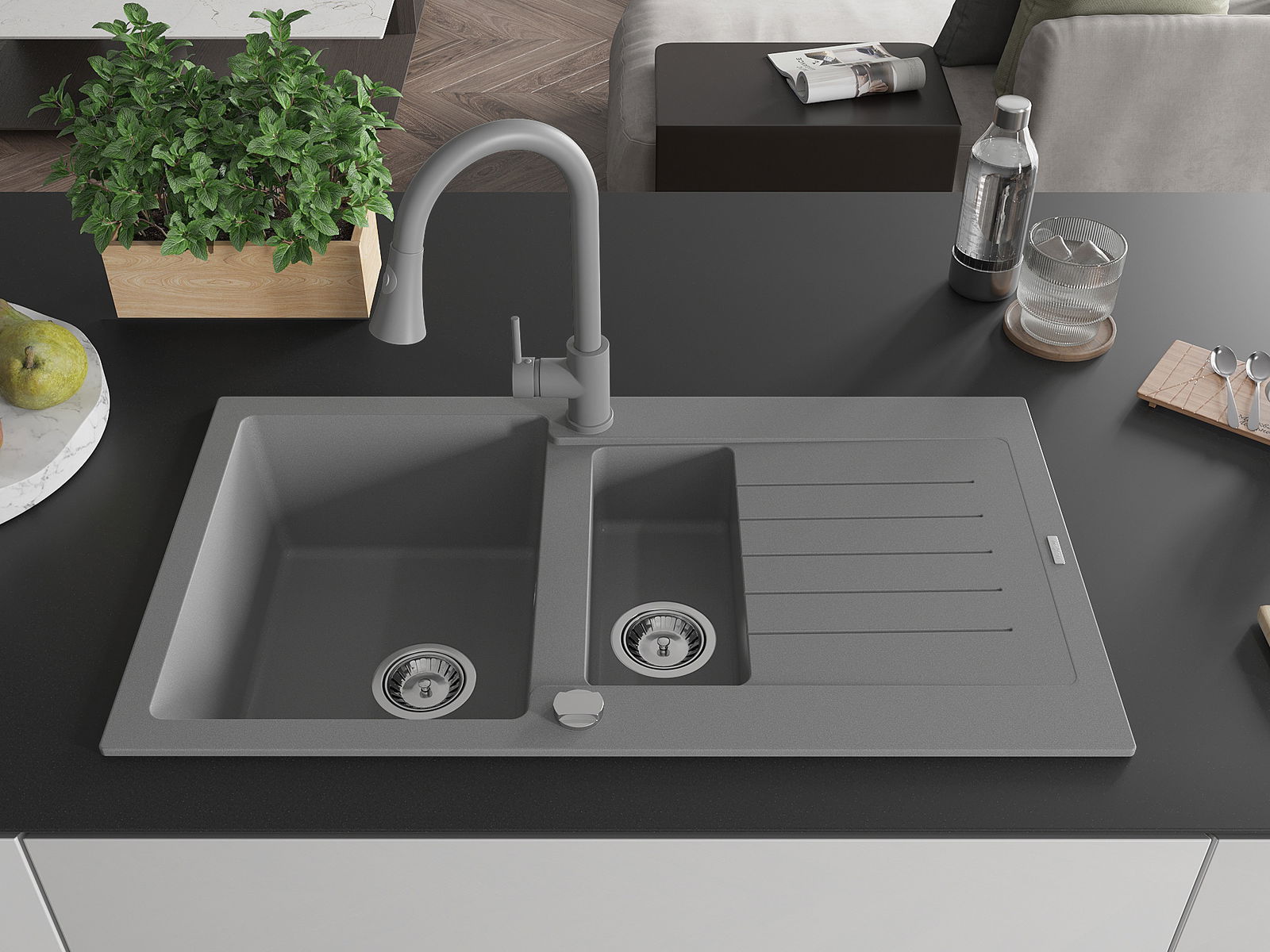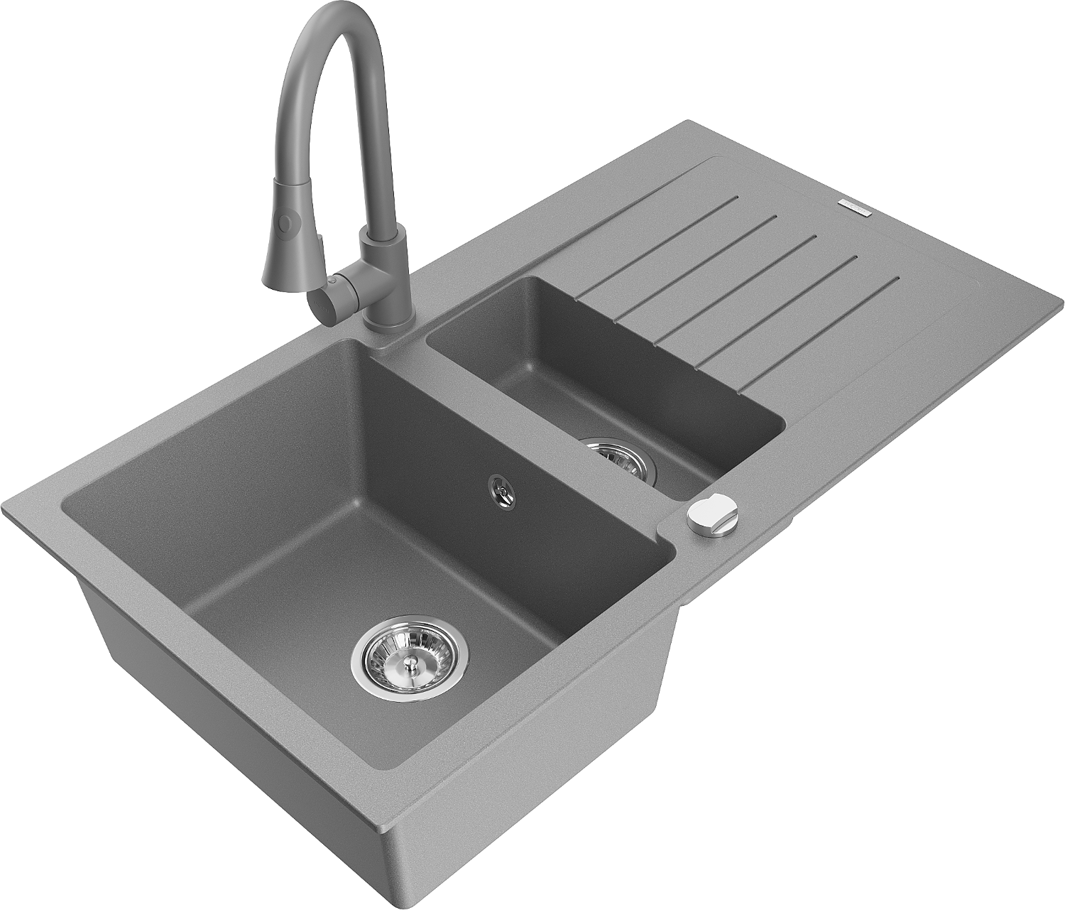 Mexen Matias žulový dřez 1,5-komorový s odkapávačem a kuchyňskou baterií Elia, šedý - 6502-71-670101-71
