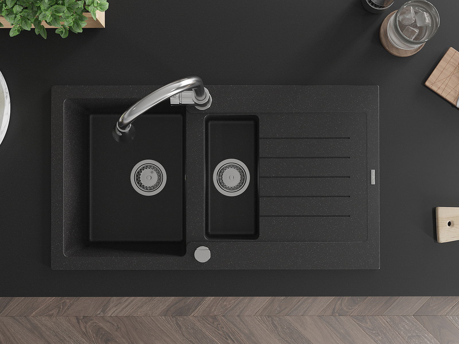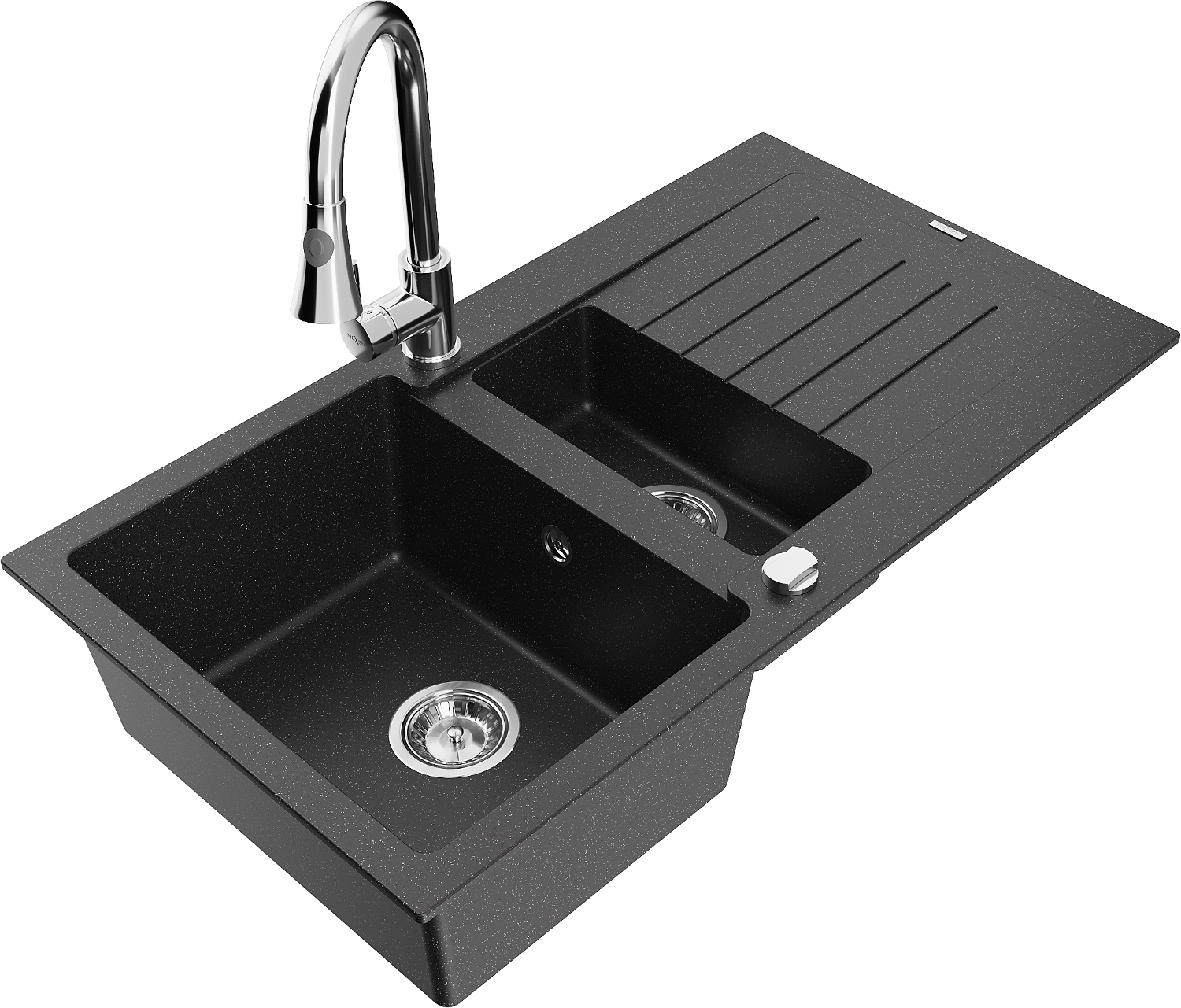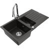 Mexen Matias žulový dřez 1,5-komorový s odkapávačem a kuchyňskou baterií Elia, černý/stříbrný metalík - 6502-73-670101-00