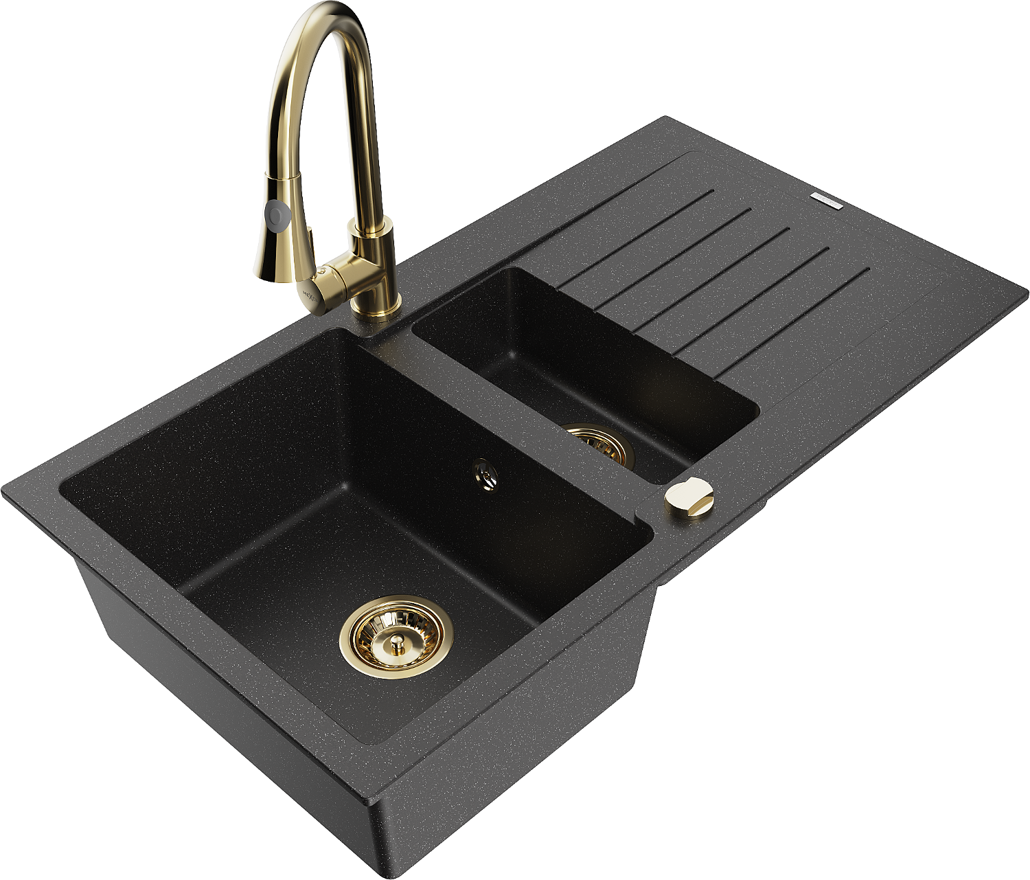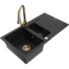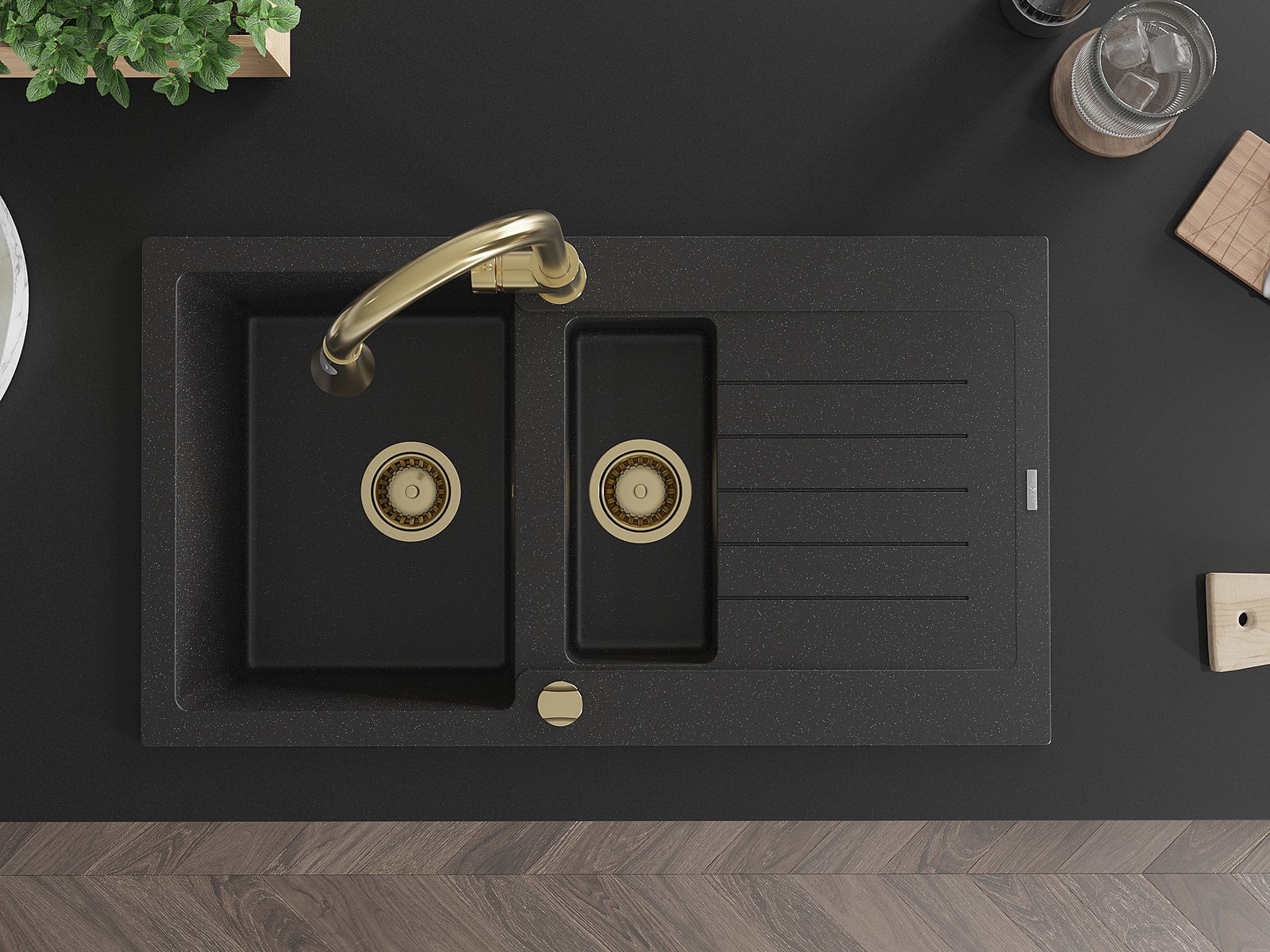 Mexen Matias granitový dřez 1,5-komorový s odkapávačem a kuchyňskou baterií Elia, černý/stříbrný metalik - 6502-73-670101-50
