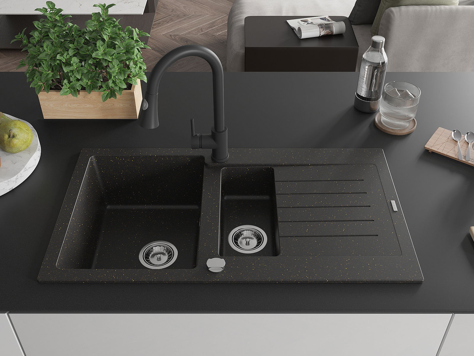 Mexen Matias granitový dřez 1,5-komorový s odkapávačem a kuchyňskou baterií Elia, černý/zlatý metalický - 6502-75-670101-70
