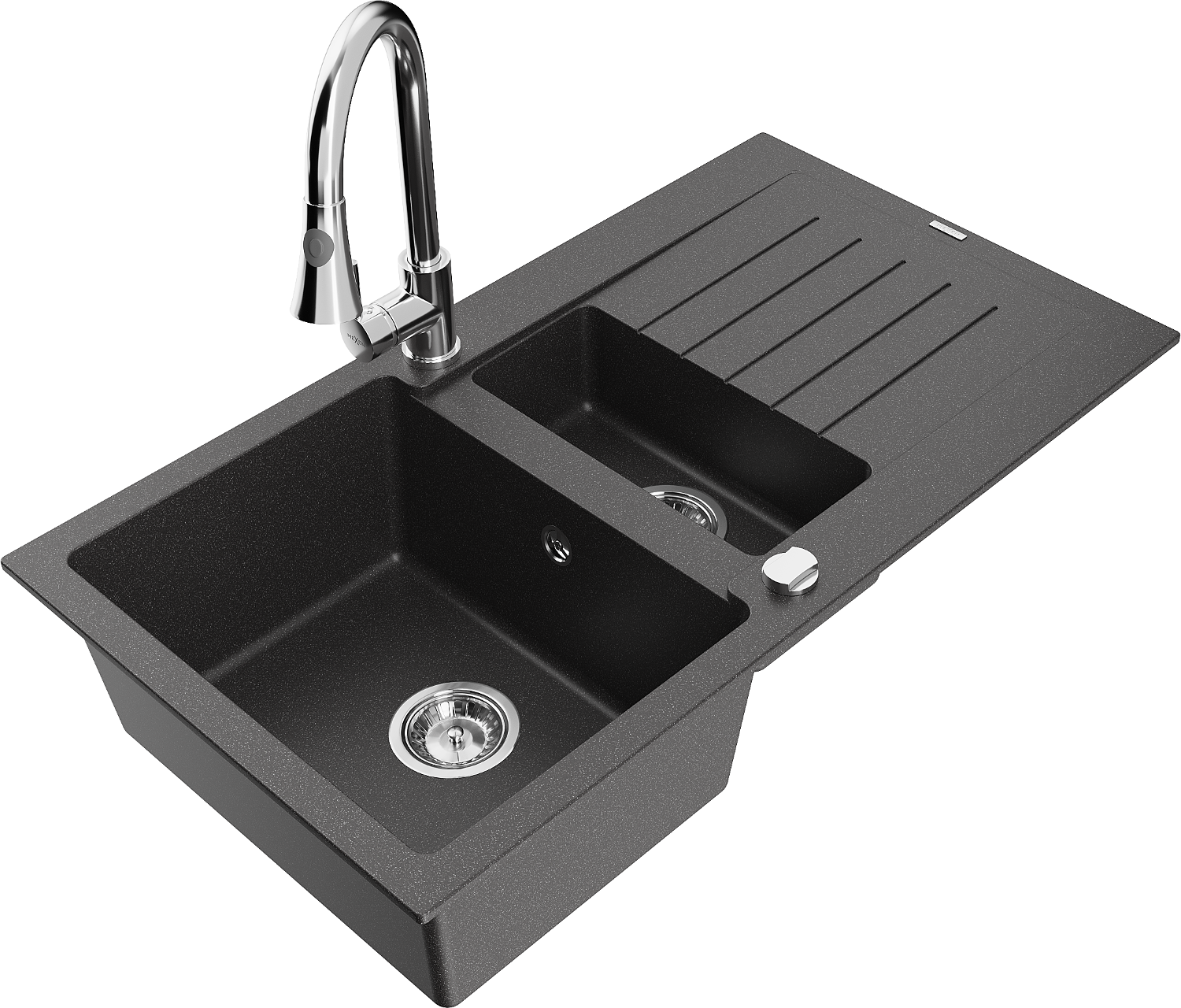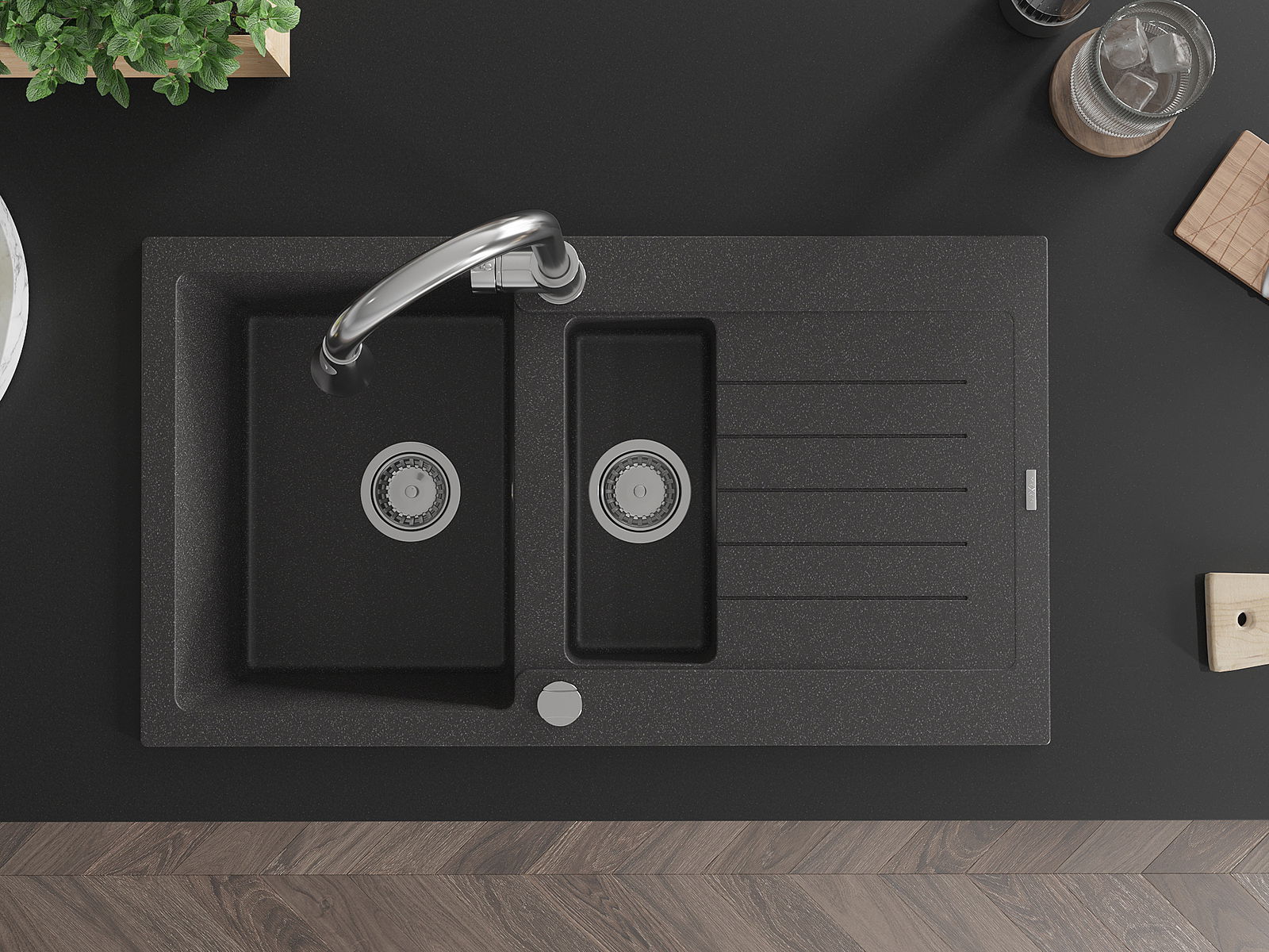 Mexen Matias žulový dřez 1,5-komorový s odkapávačem a kuchyňskou baterií Elia, černý s tečkováním - 6502-76-670101-00