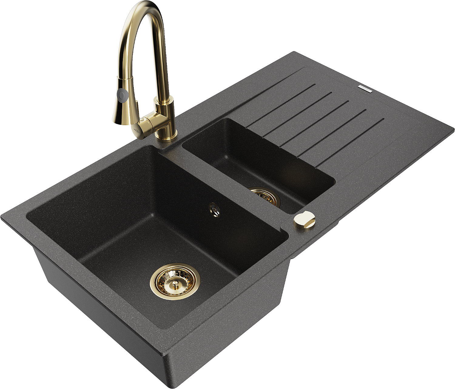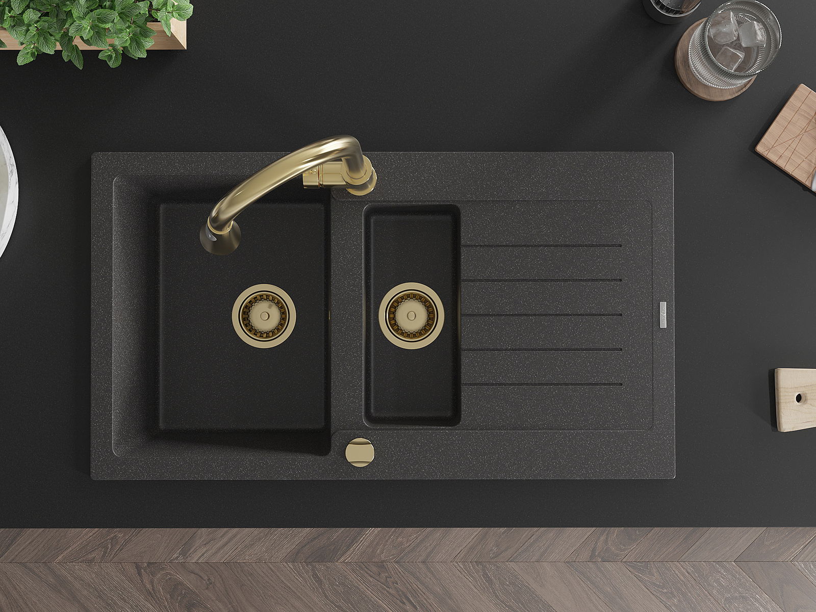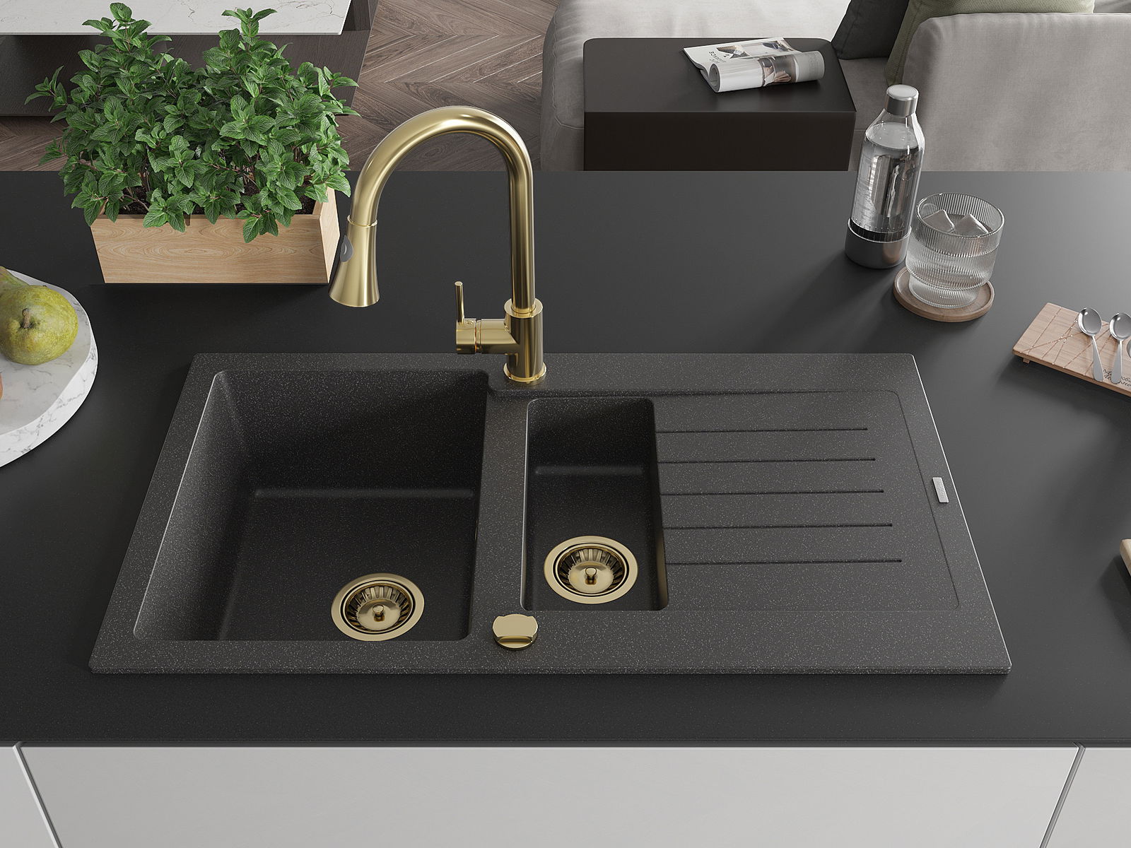 Mexen Matias granitový dřez 1,5-komorový s odkapávačem a kuchyňskou baterií Elia, černý tečkovaný - 6502-76-670101-50