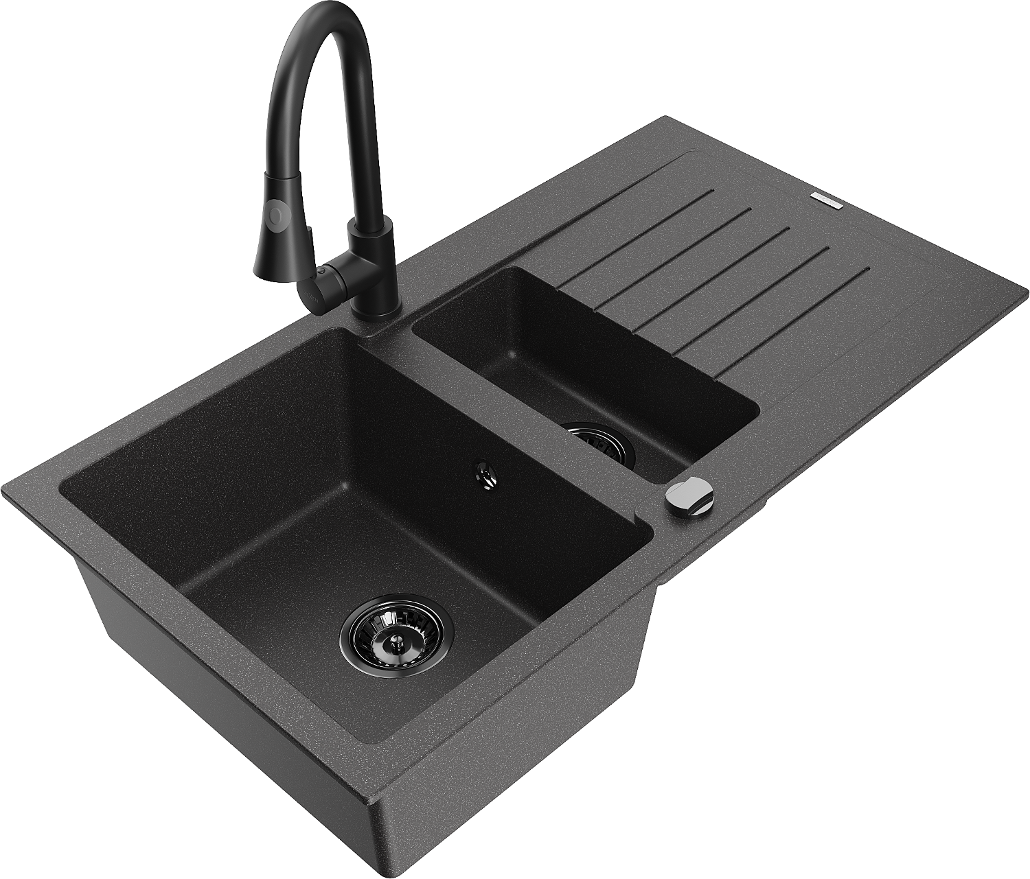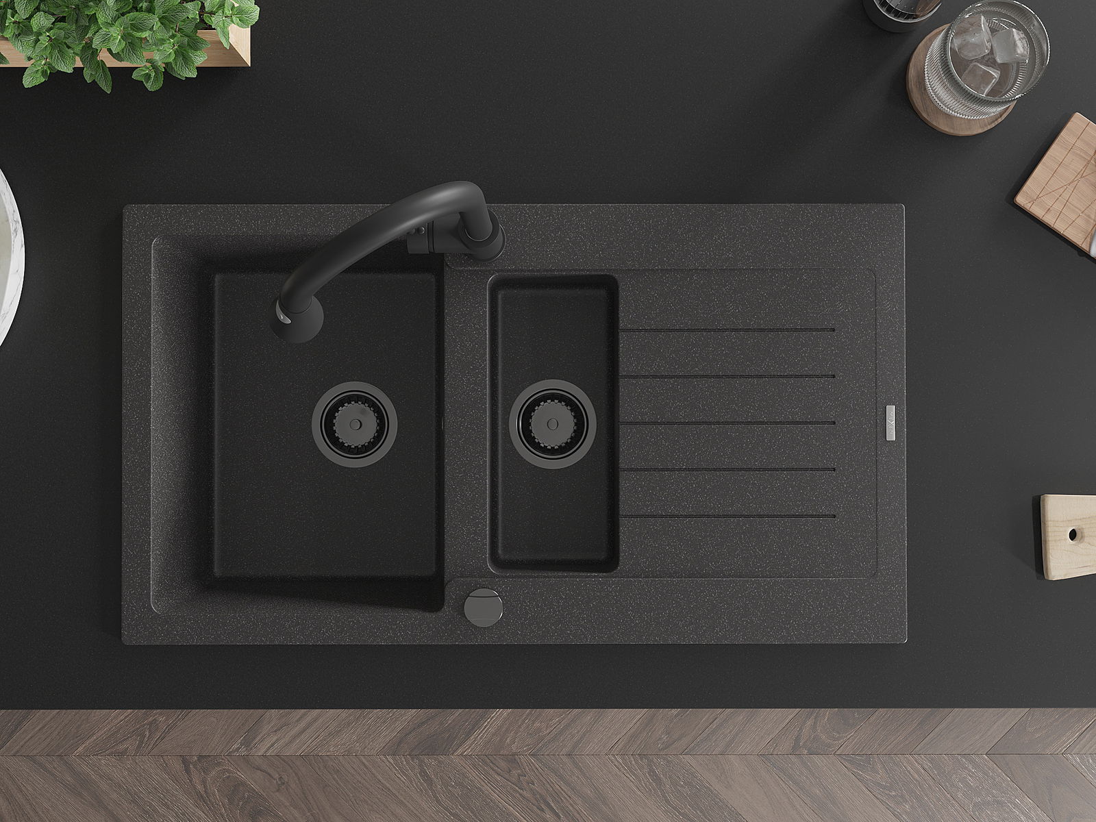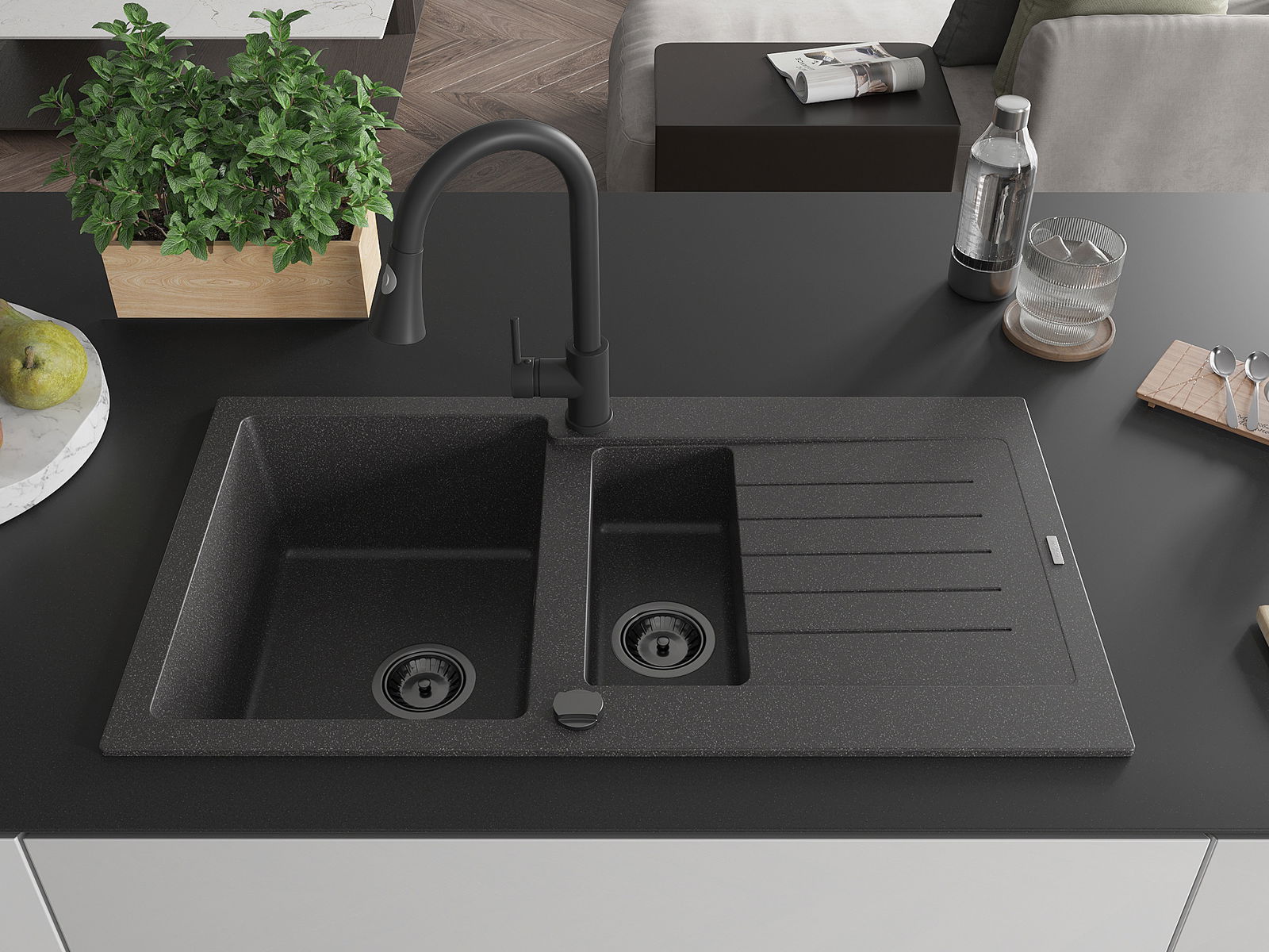 Mexen Matias granitový dřez 1,5-komorový s odkapávačem a kuchyňskou baterií Elia, černý kropenatý - 6502-76-670101-70-B