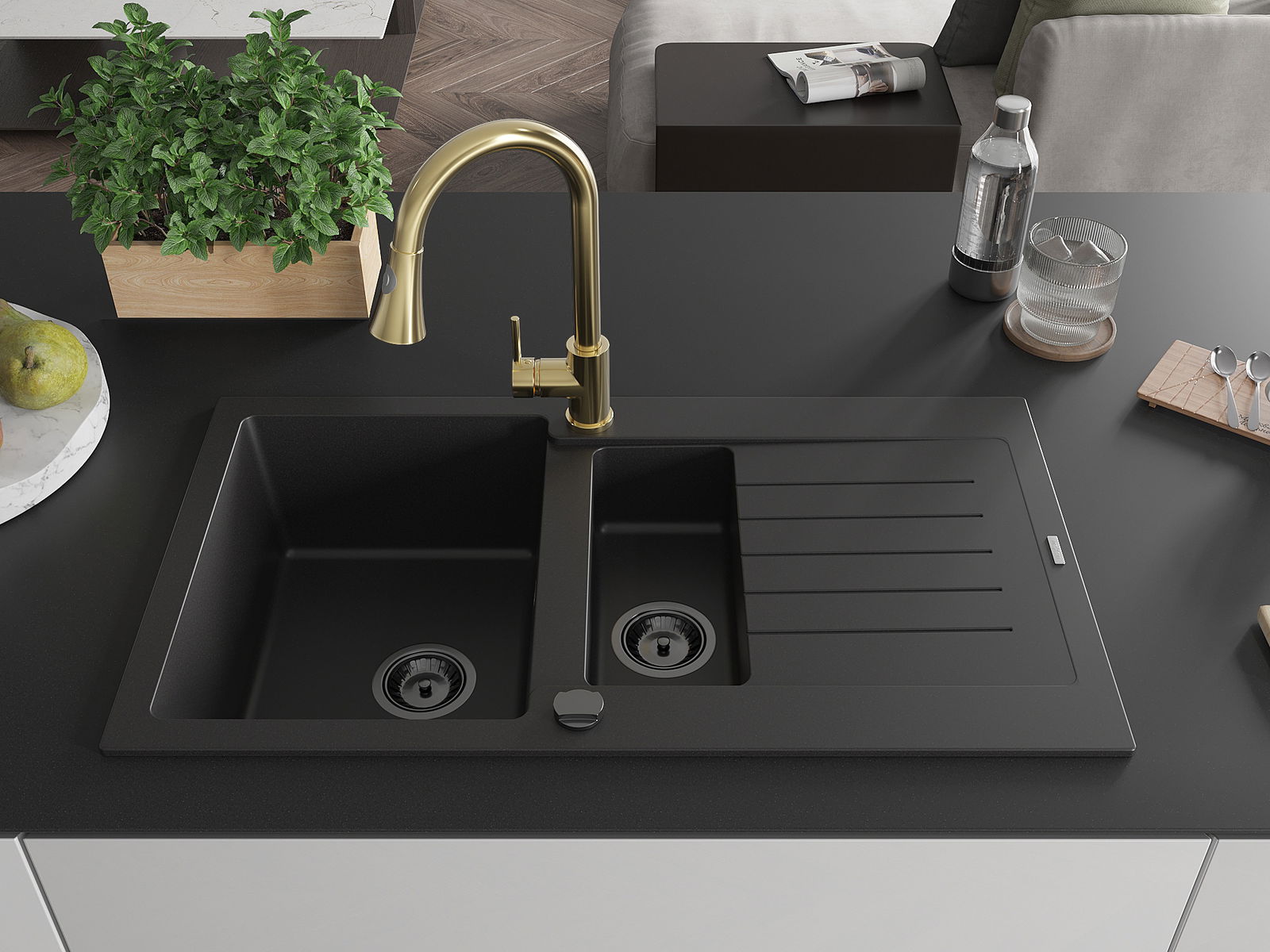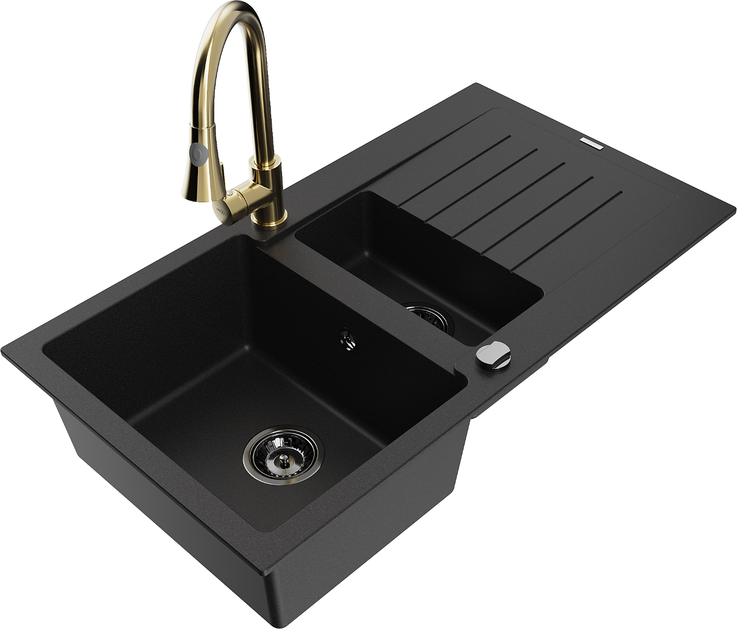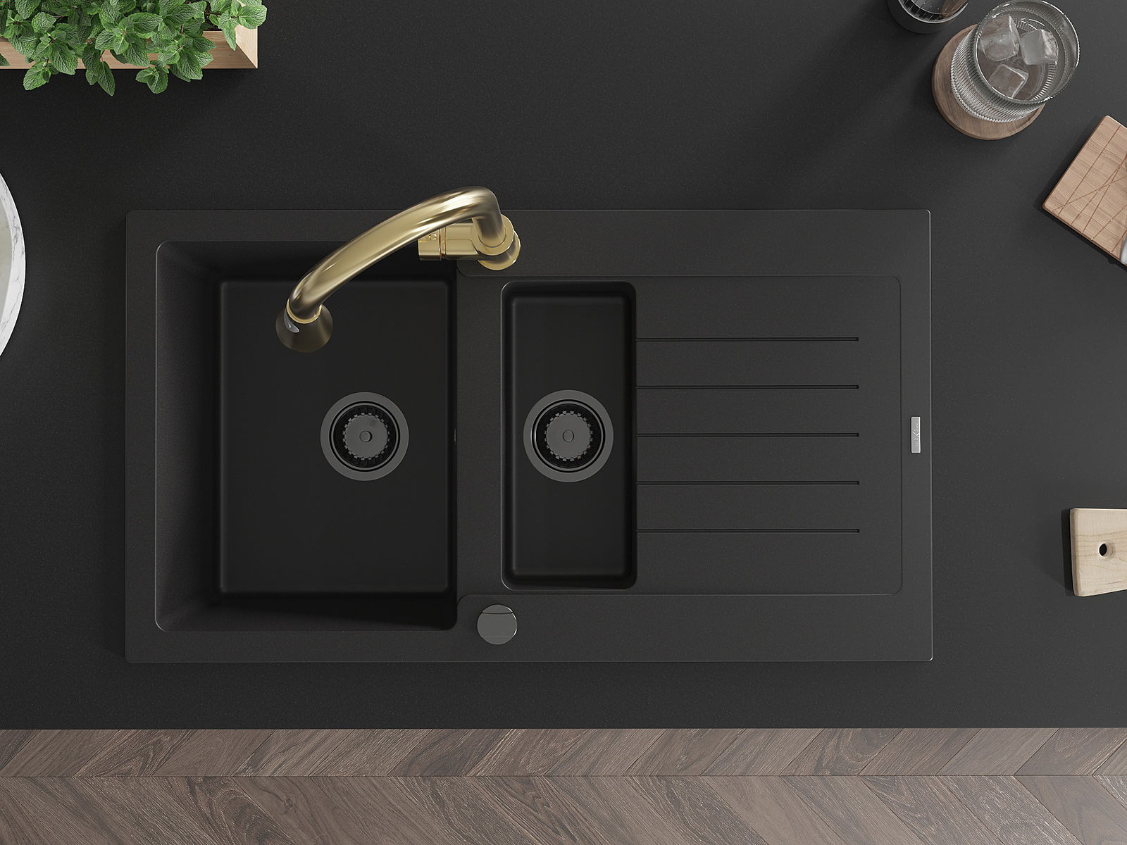 Mexen Matias granitový dřez 1,5-komorový s odkapávačem a kuchyňskou baterií Elia, černý - 6502-77-670101-50-B