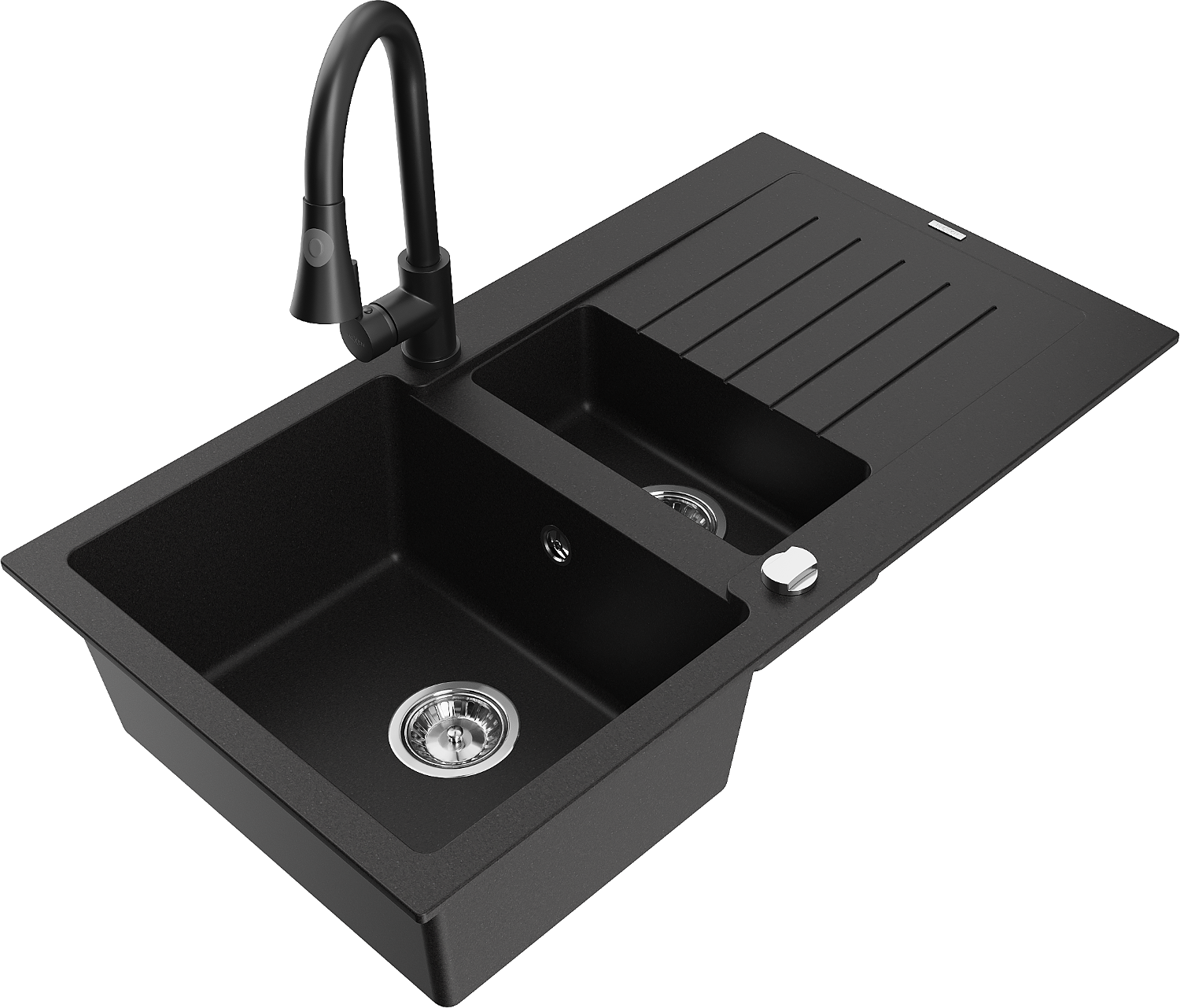• Mexen Matias granitový dřez 1,5komorový s odkapávačem a kuchyňskou baterií Elia, černý - 6502-77-670101-70