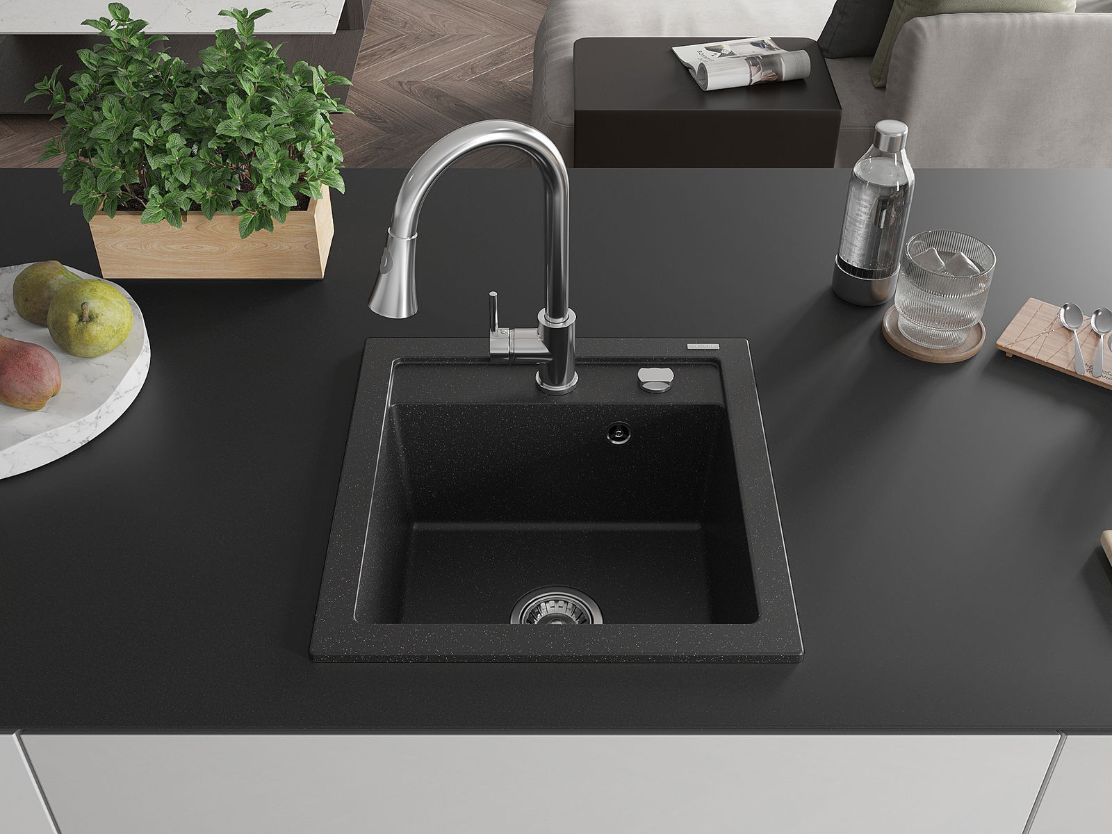 • Mexen Vito granitový dřez 1-komorový s kuchyňskou baterií Elia, černý/stříbrný metalik - 6503-73-670101-00