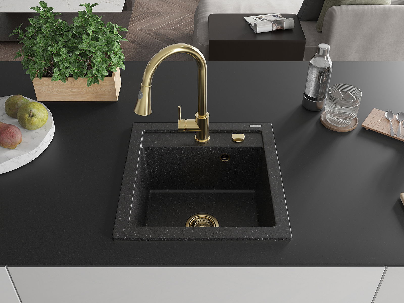 Mexen Vito granitový dřez 1-komorový s kuchyňskou baterií Elia, černý/stříbrný metalik - 6503-73-670101-50